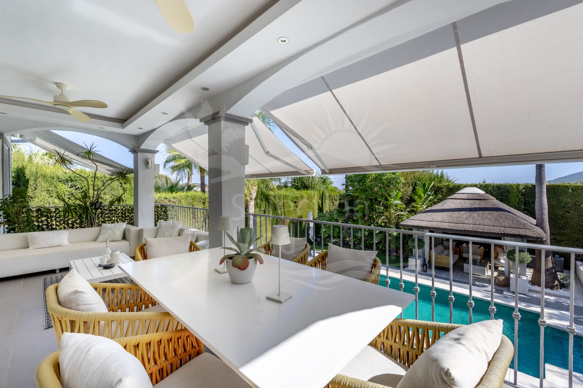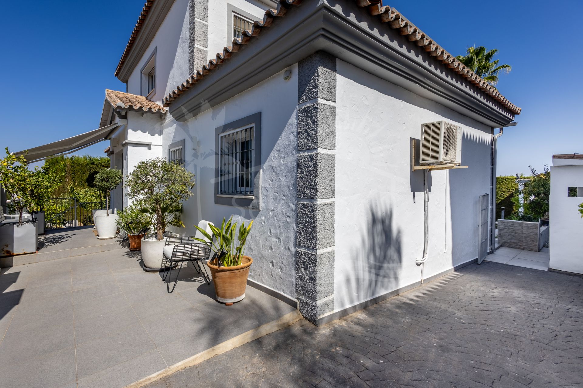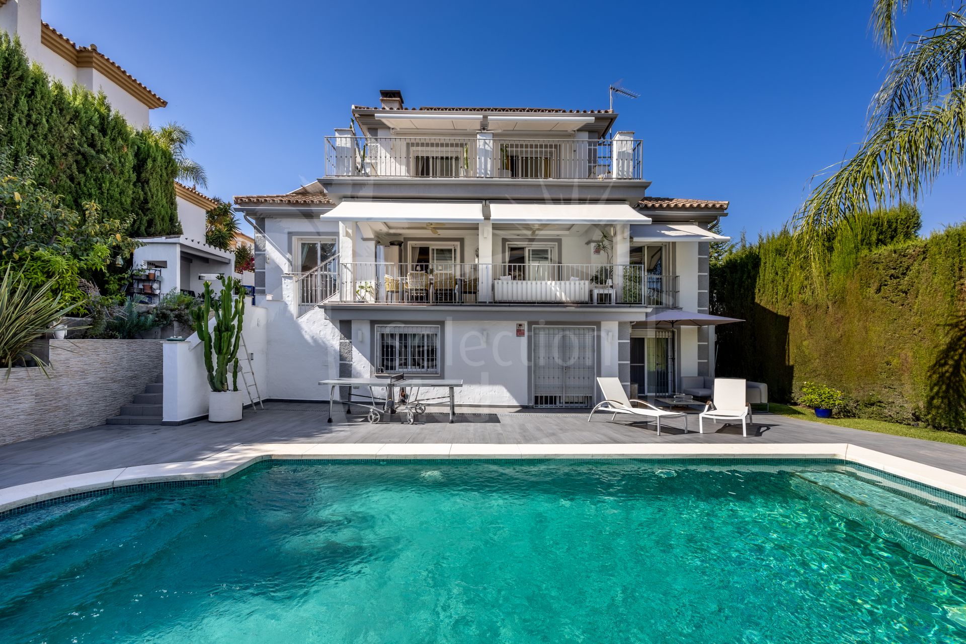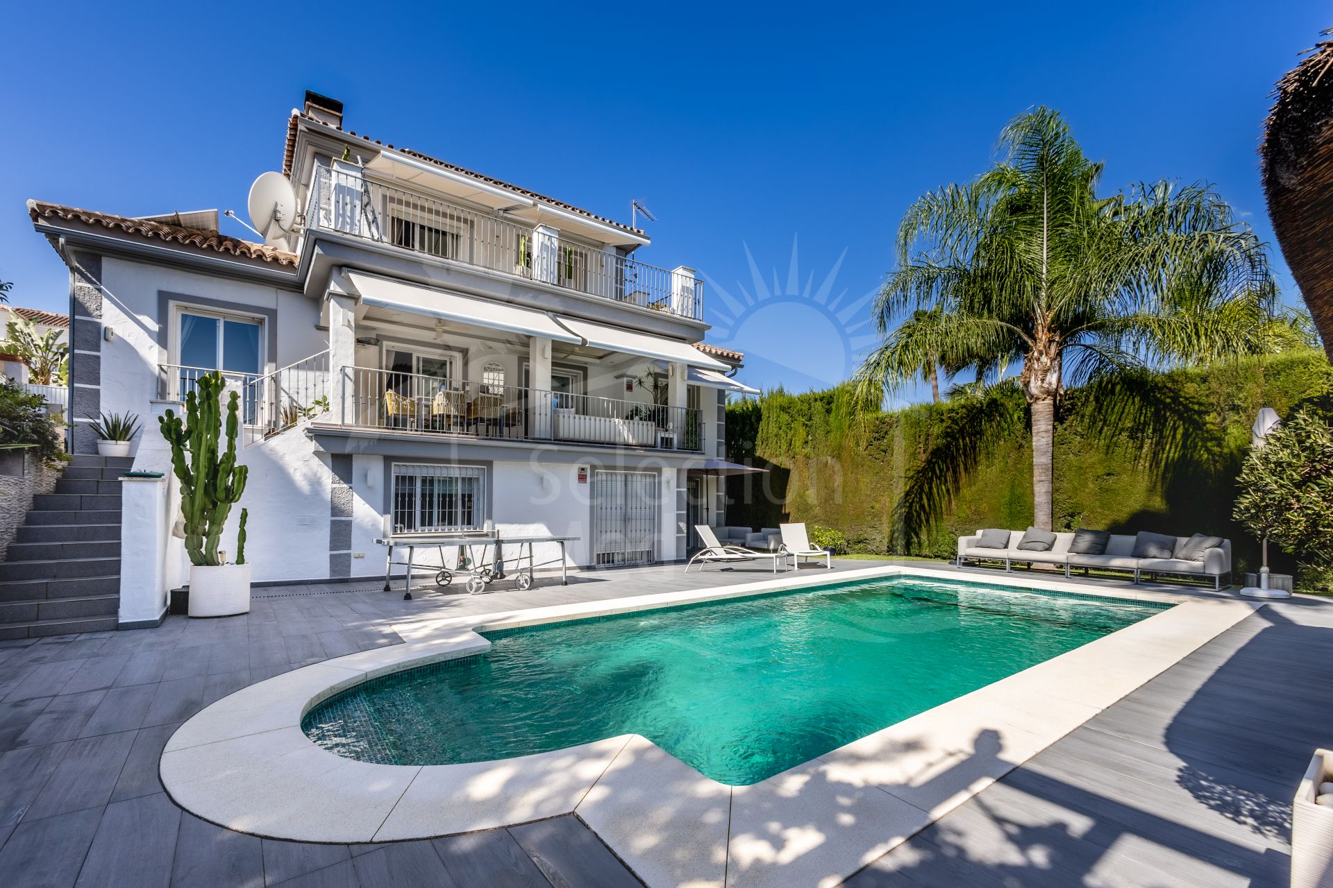 The exterior of the villa is an impressive, secure, and fully established retreat, landscaped to offer multiple seating areas, relaxation spaces, and outdoor dining options. Among its charms, you will find a barbecue area, a romantic corner in the orchard, fruit trees, and a small vegetable garden. The main terrace can accommodate more than 12 diners, providing direct access to the pool, solarium, and gardens.