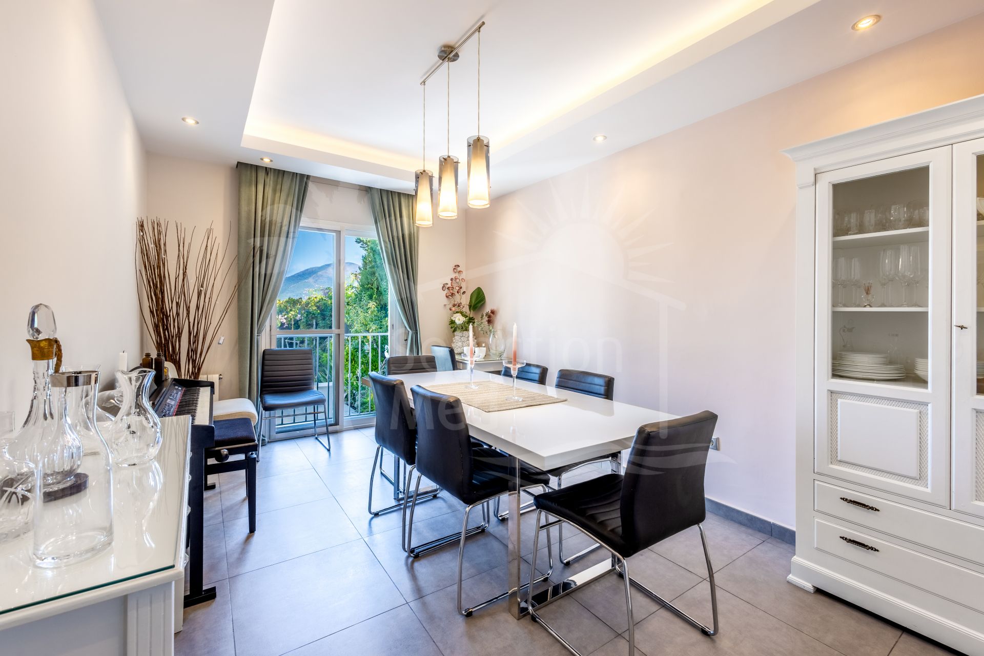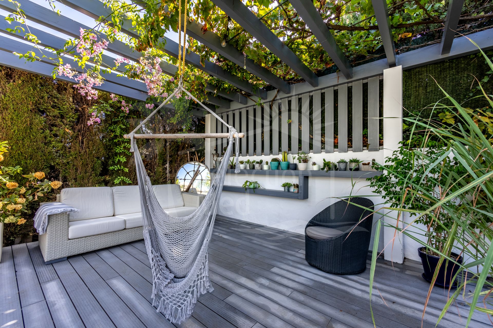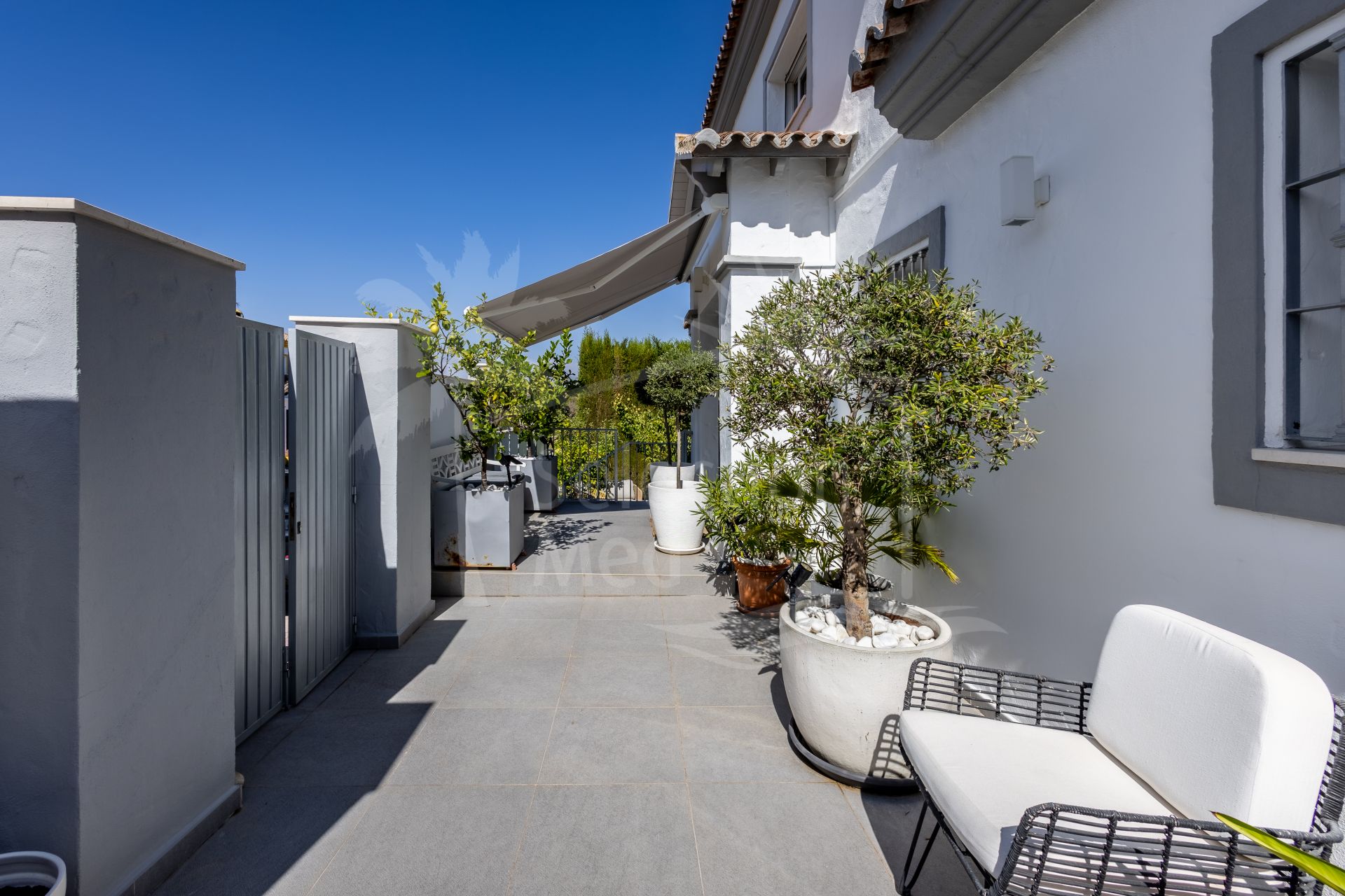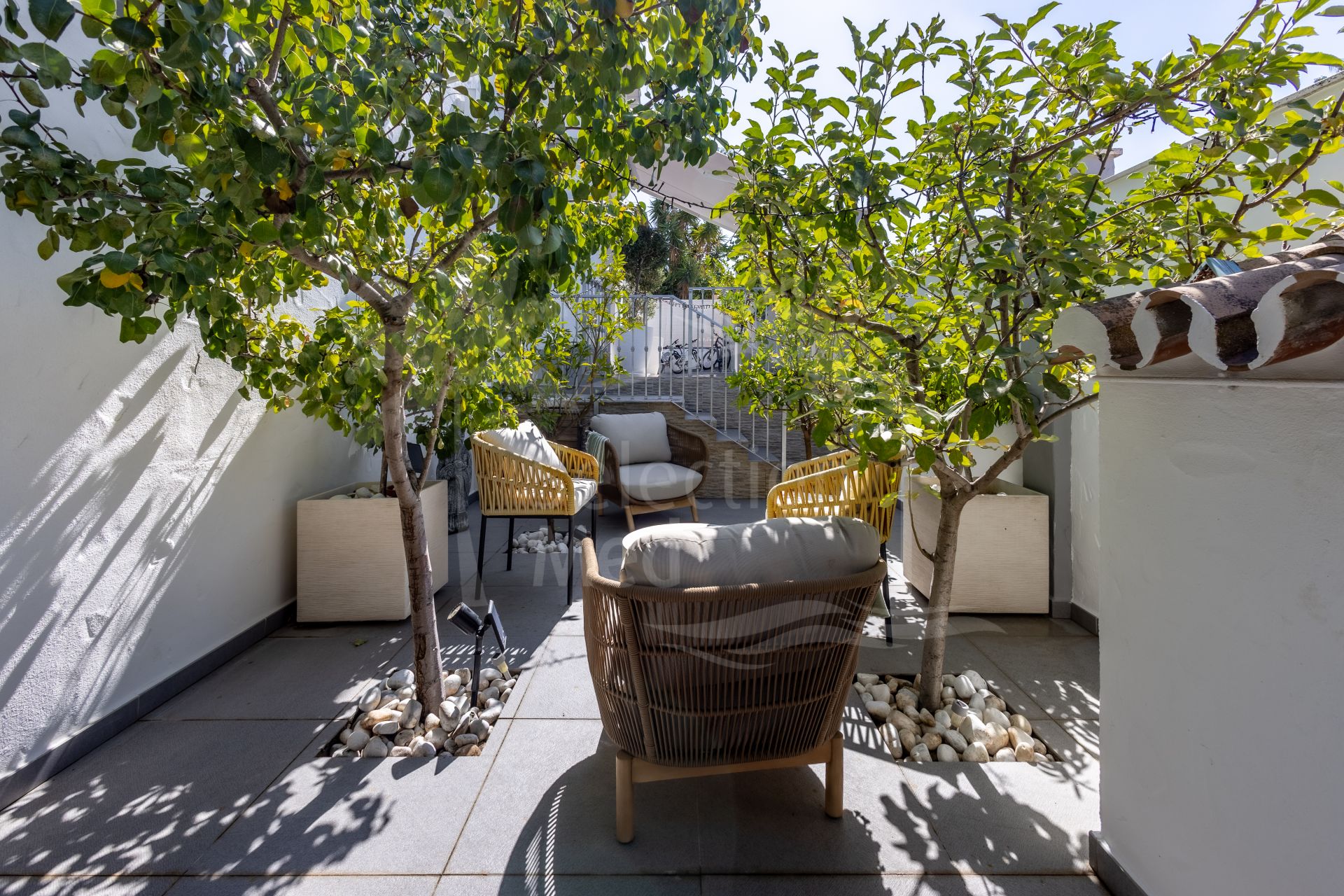 The exterior of the villa is an impressive, secure, and fully established retreat, landscaped to offer multiple seating areas, relaxation spaces, and outdoor dining options. Among its charms, you will find a barbecue area, a romantic corner in the orchard, fruit trees, and a small vegetable garden. The main terrace can accommodate more than 12 diners, providing direct access to the pool, solarium, and gardens.
