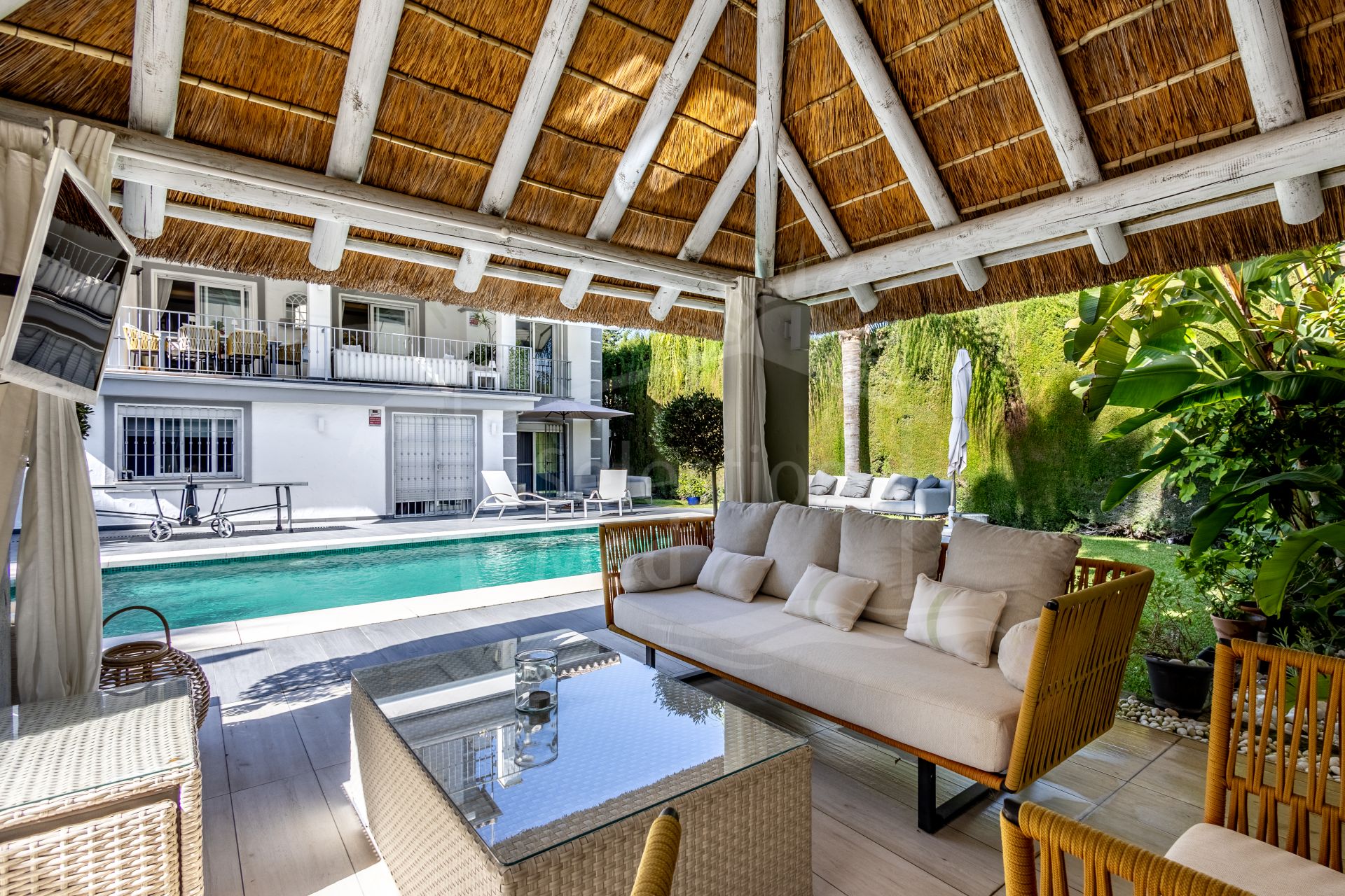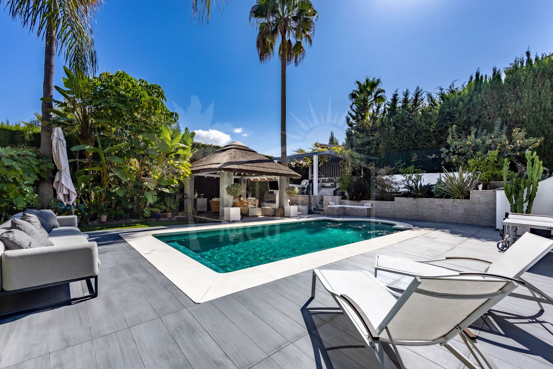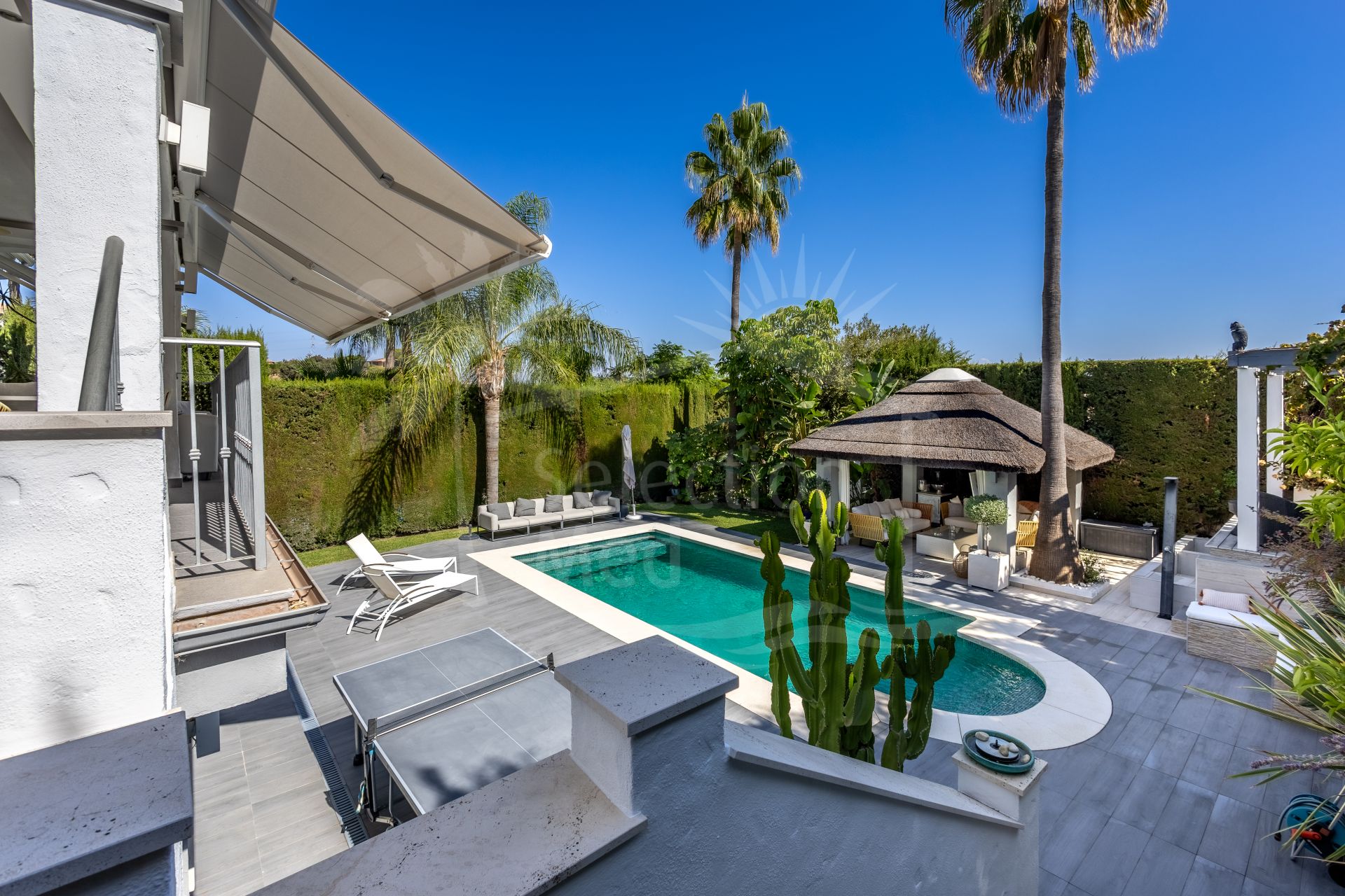 The current owners have carried out a complete renovation, investing in an extensive list of upgrades that are hard to match. Highlights include an elegant poolside cabana with African thatched Cap Reed roof, a high-end heated pool with electric cover and new lining, top-quality porcelain flooring throughout the house, custom lighting both inside and out, decorative ceiling moldings in every room, and many other enhancements that make this home truly special.