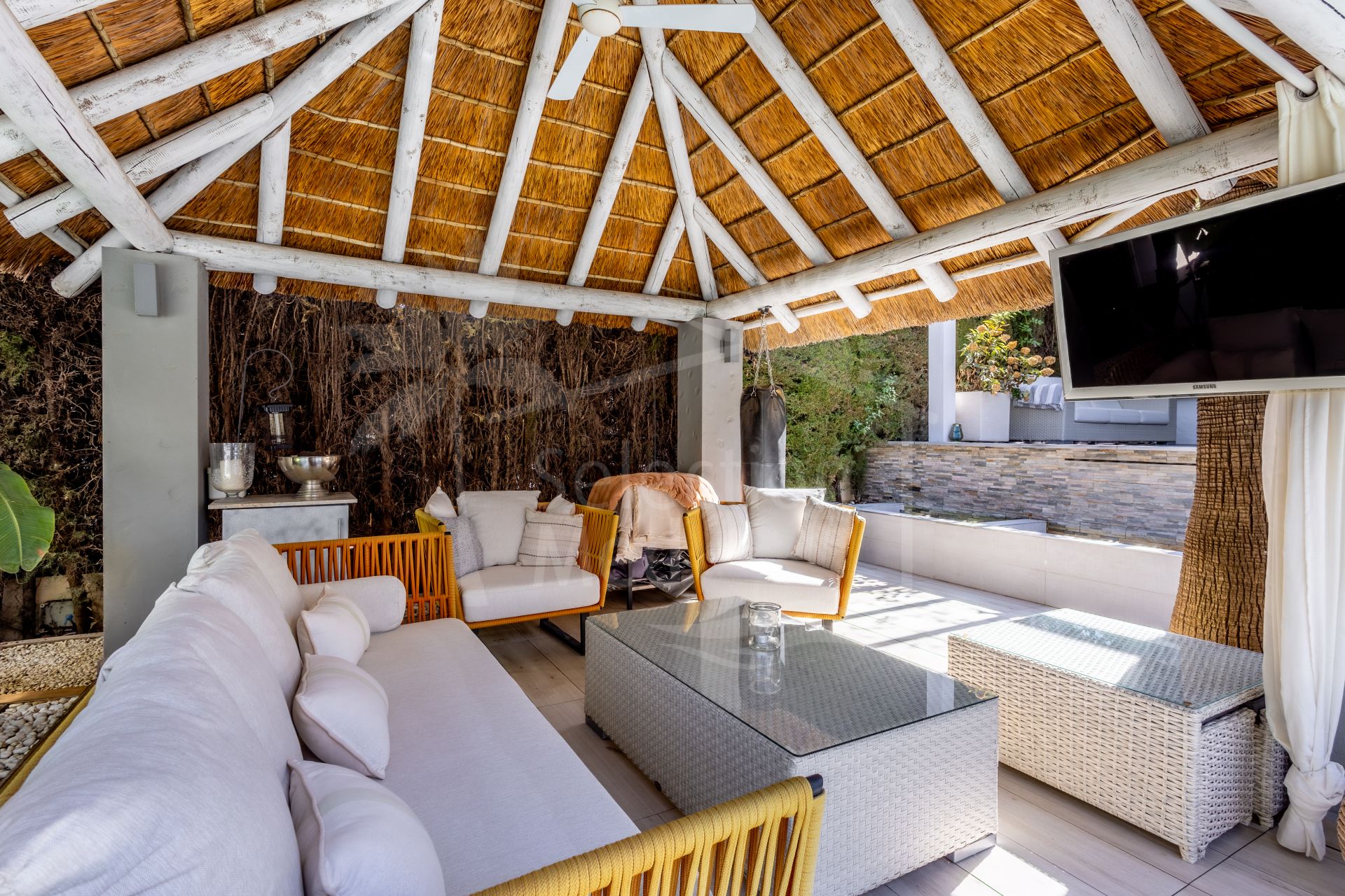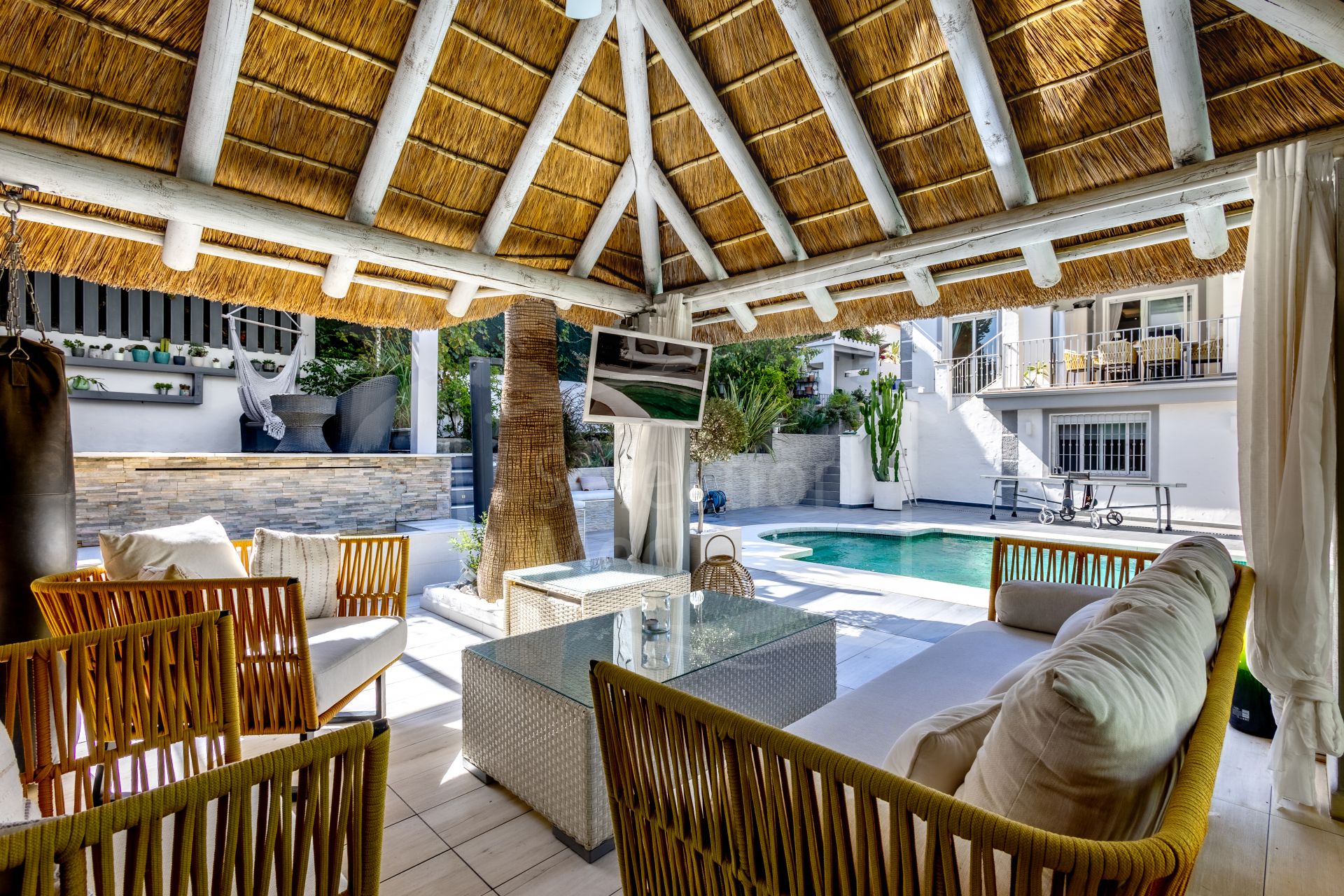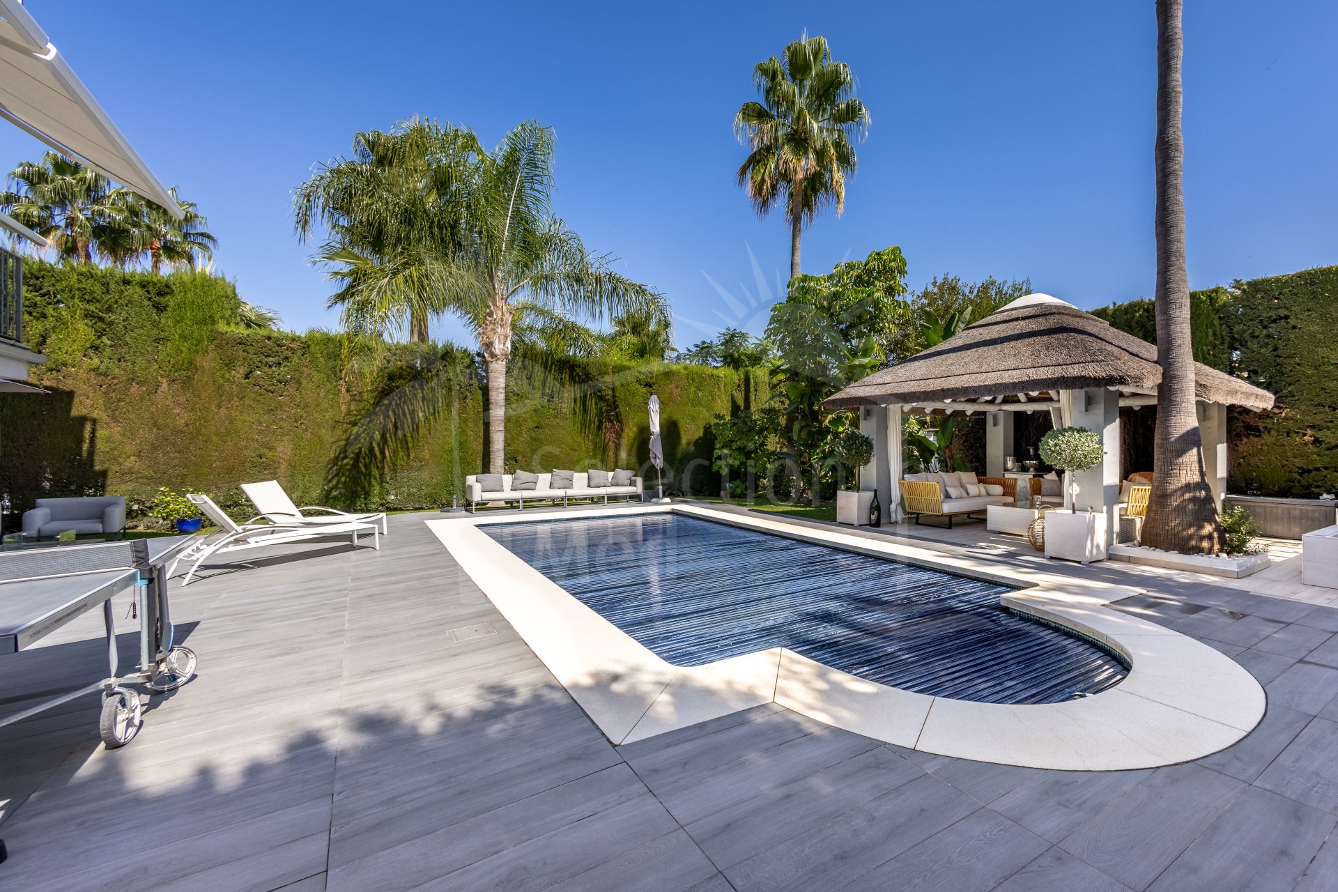 The current owners have carried out a complete renovation, investing in an extensive list of upgrades that are hard to match. Highlights include an elegant poolside cabana with African thatched Cap Reed roof, a high-end heated pool with electric cover and new lining, top-quality porcelain flooring throughout the house, custom lighting both inside and out, decorative ceiling moldings in every room, and many other enhancements that make this home truly special.