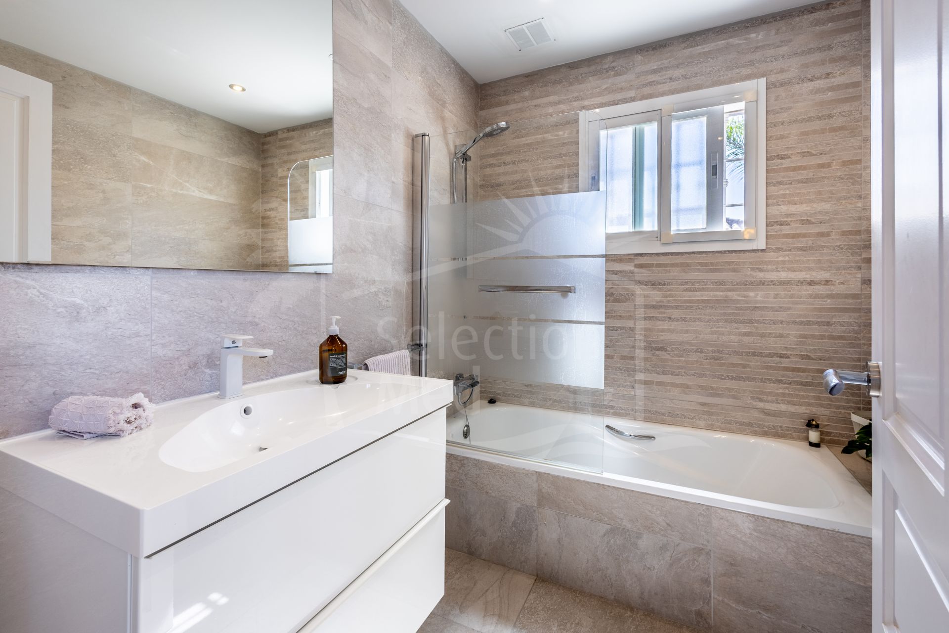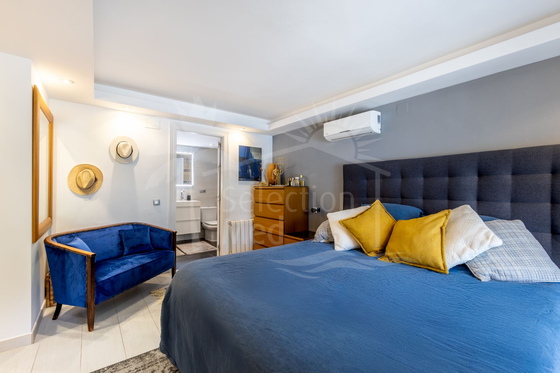 An attractive staircase connects the guest bedrooms on the upper floor with the main suites on the lower floor. The upper floor houses two similarly sized bedrooms, both with access to a magnificent terrace with panoramic views.
