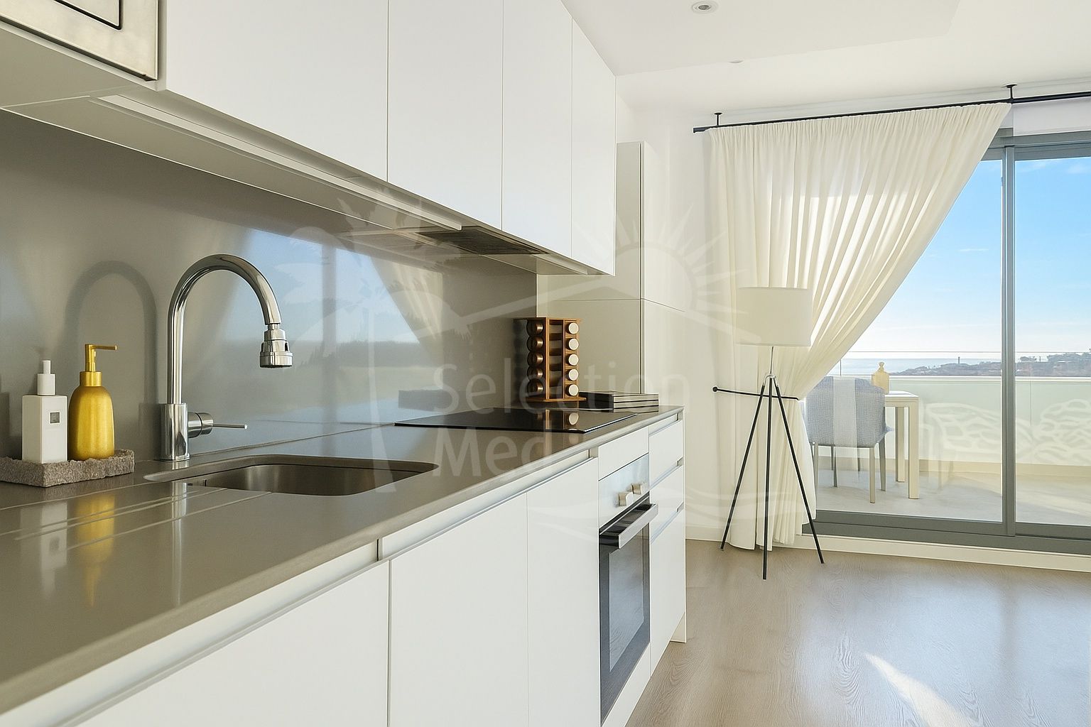 The home features a spacious main living room, designed with an open-concept layout, which integrates perfectly with the private terrace, allowing you to enjoy natural light and direct panoramic sea views. The kitchen, fully equipped and modern in style, is connected to the living room and includes high-quality appliances, as well as a practical laundry area.
