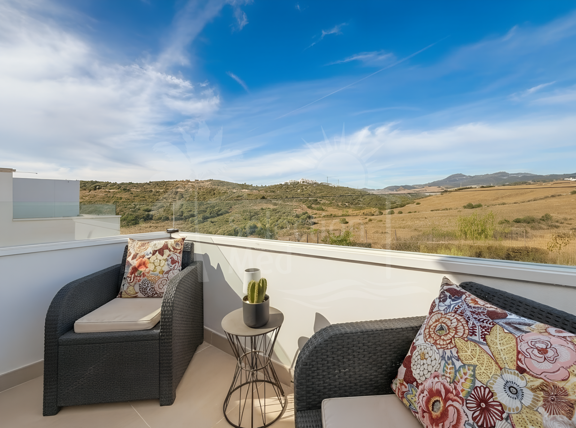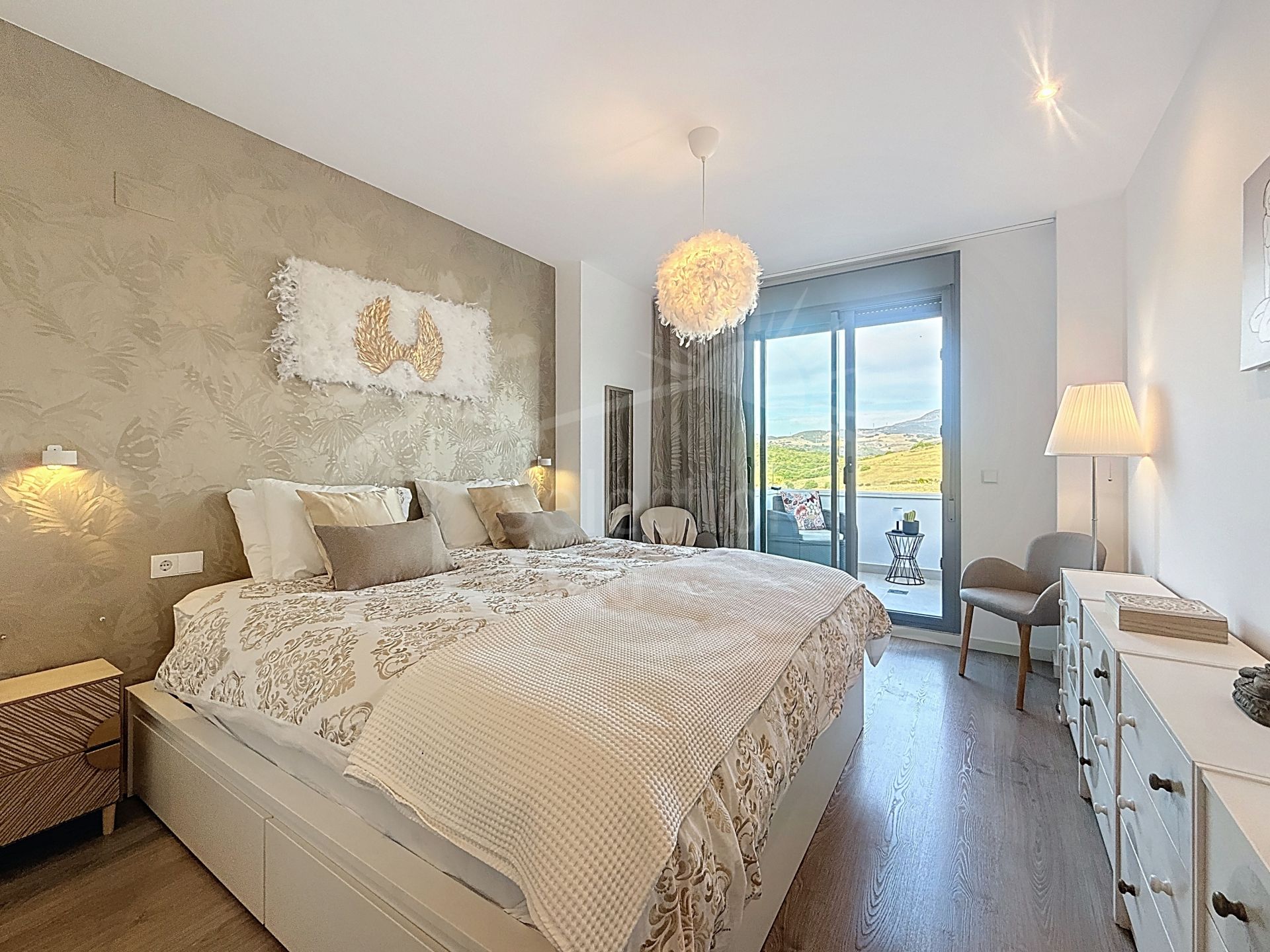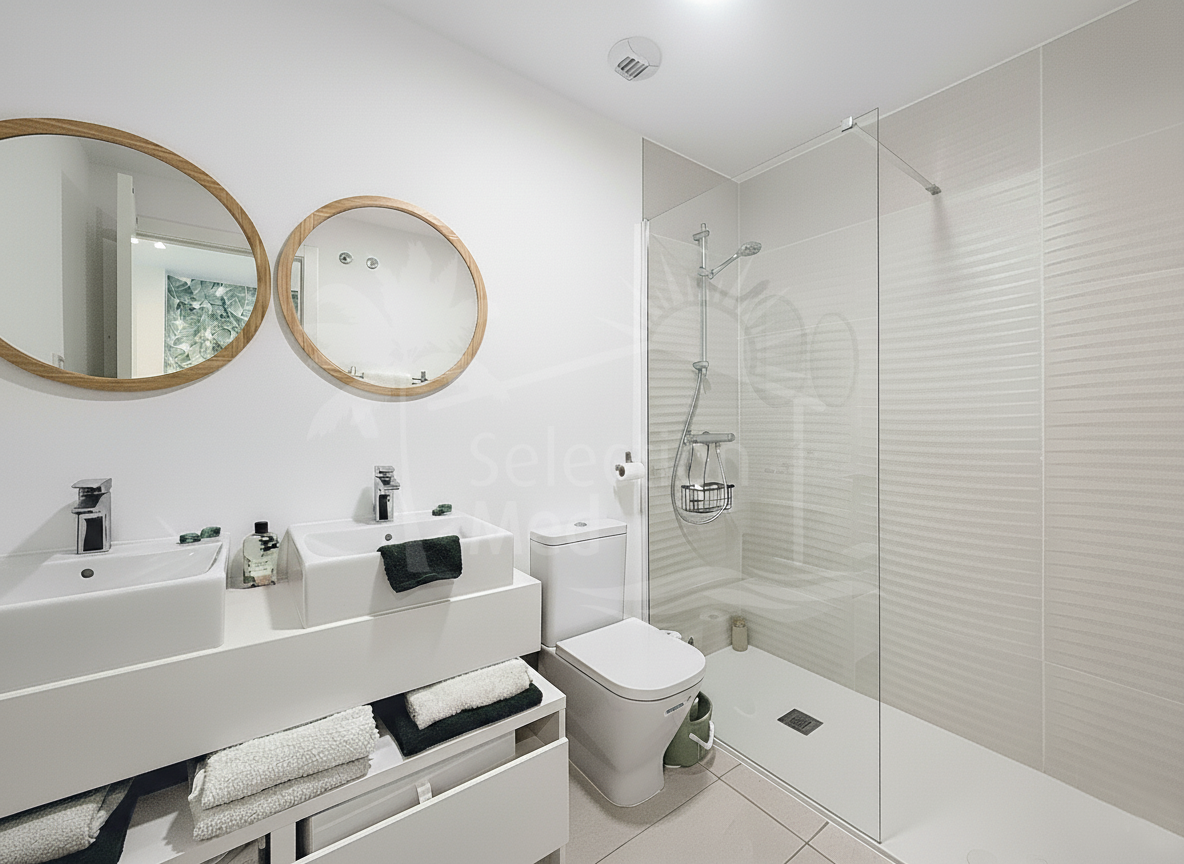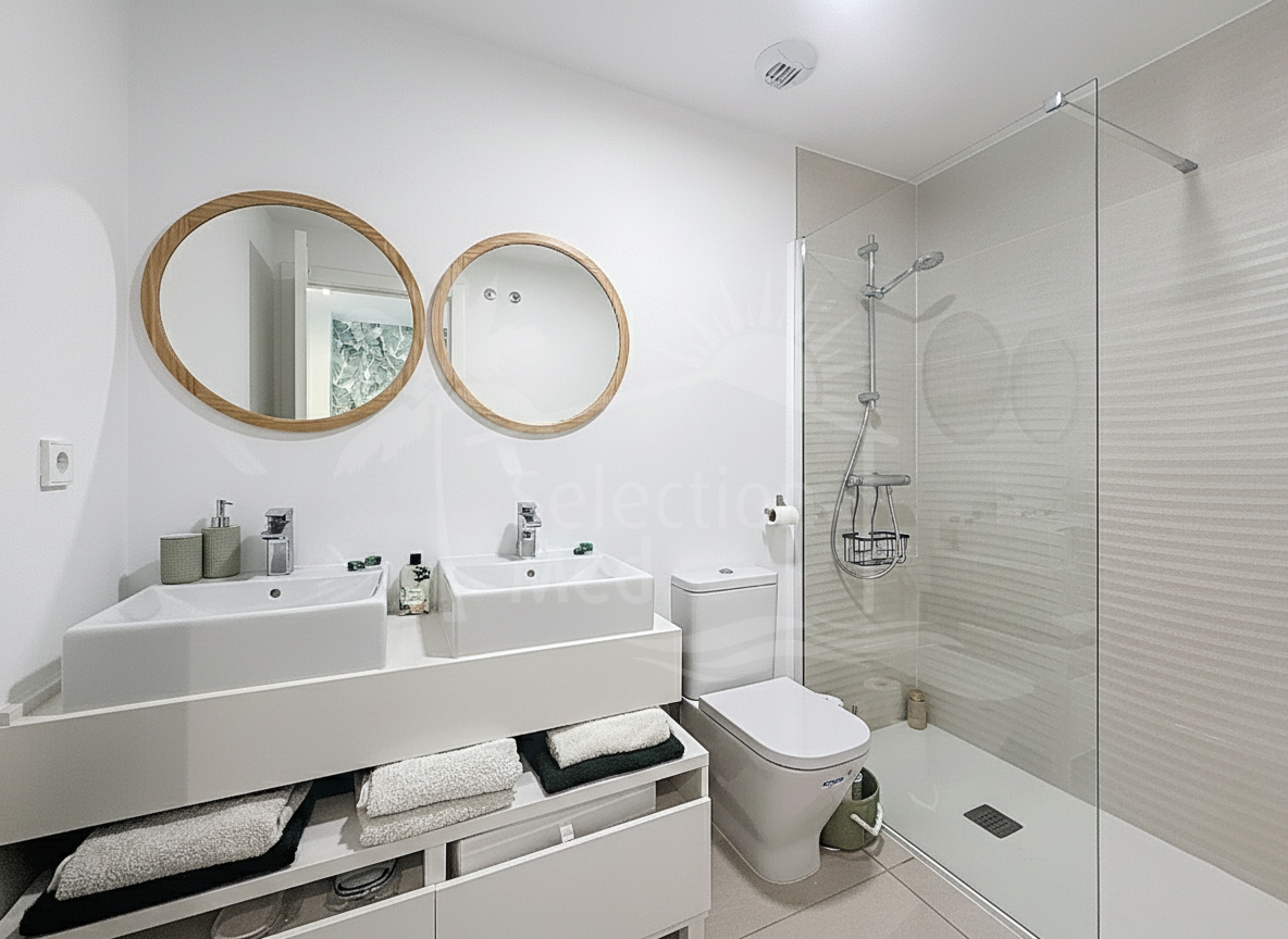In the sleeping area, there are two bedrooms with built-in wardrobes and two full bathrooms, one of them en suite. The bedrooms are designed to offer comfort and privacy, and the master bedroom also has a private bathroom and a private terrace with views of the countryside and mountains.