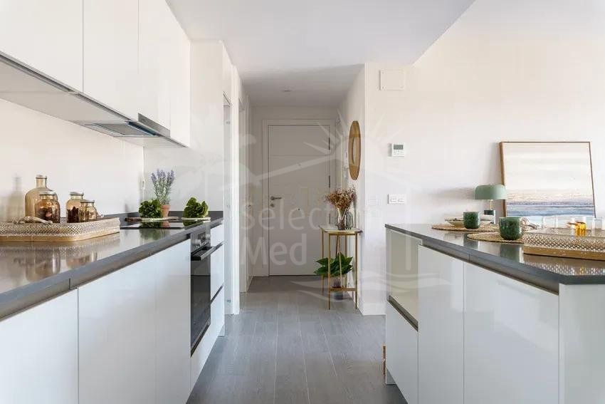 The apartment is presented in good condition and comes fully furnished for immediate occupation. The spacious open plan kitchen seamlessly connects to the dining and living areas, creating a modern and sociable environment. Fitted wardrobes provide ample storage, while additional storage space is available in the dedicated storage room. Air conditioning is installed throughout for year-round comfort, and a private garage is included for secure parking.