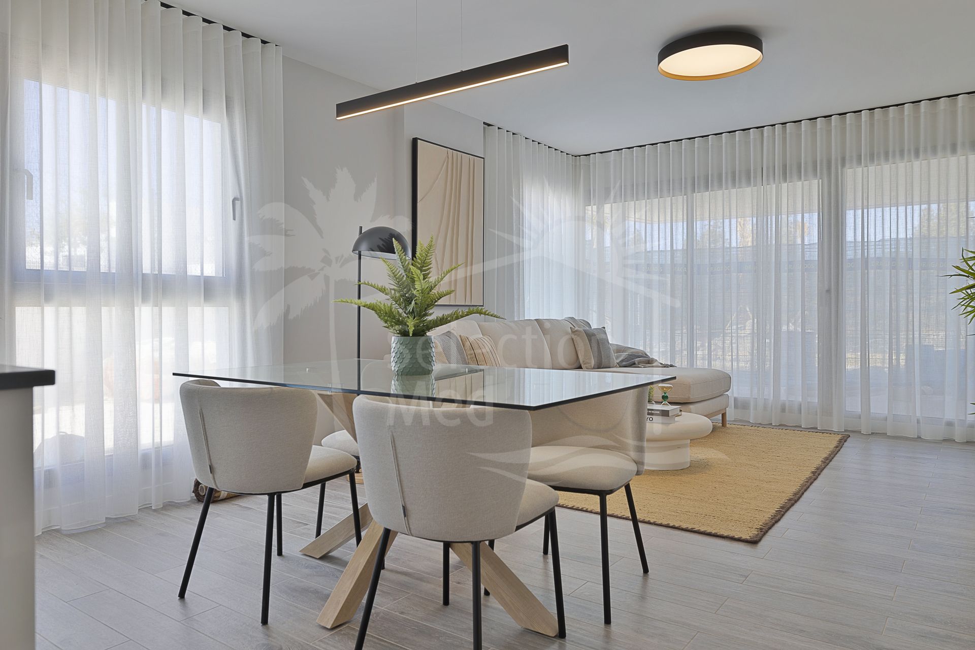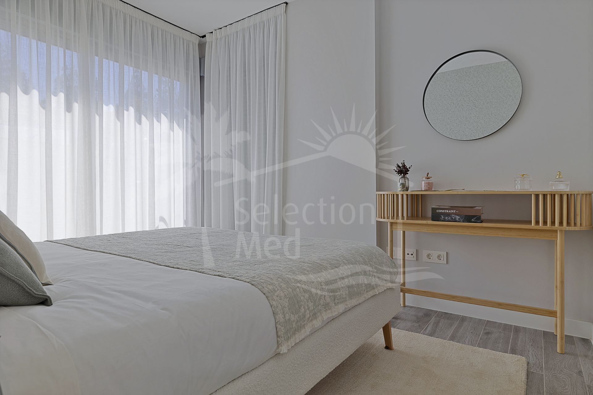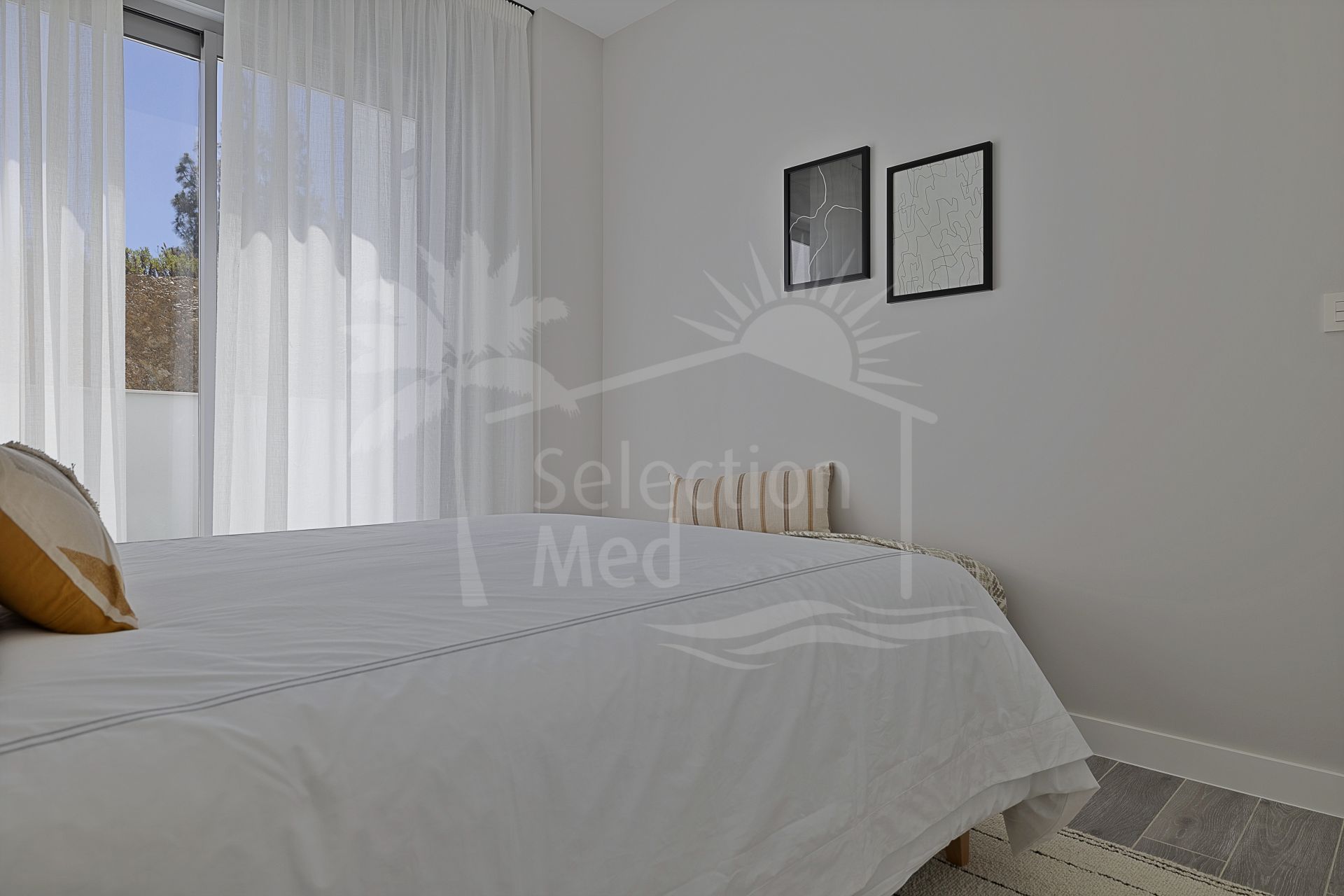 The residence is thoughtfully designed to maximise natural light and scenic views, featuring double glazing throughout. The expansive private terrace, along with both covered and uncovered sections, offers panoramic mountain vistas, partial sea views, and overlooks the communal pool. The living and dining rooms are generously proportioned, seamlessly connecting with the terrace to create an inviting atmosphere for relaxation or gatherings. The property is delivered unfurnished, allowing for personal customisation.