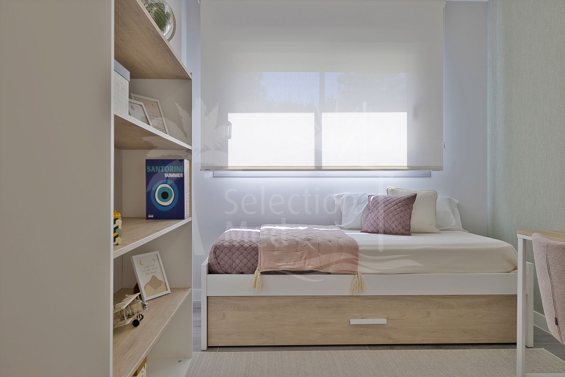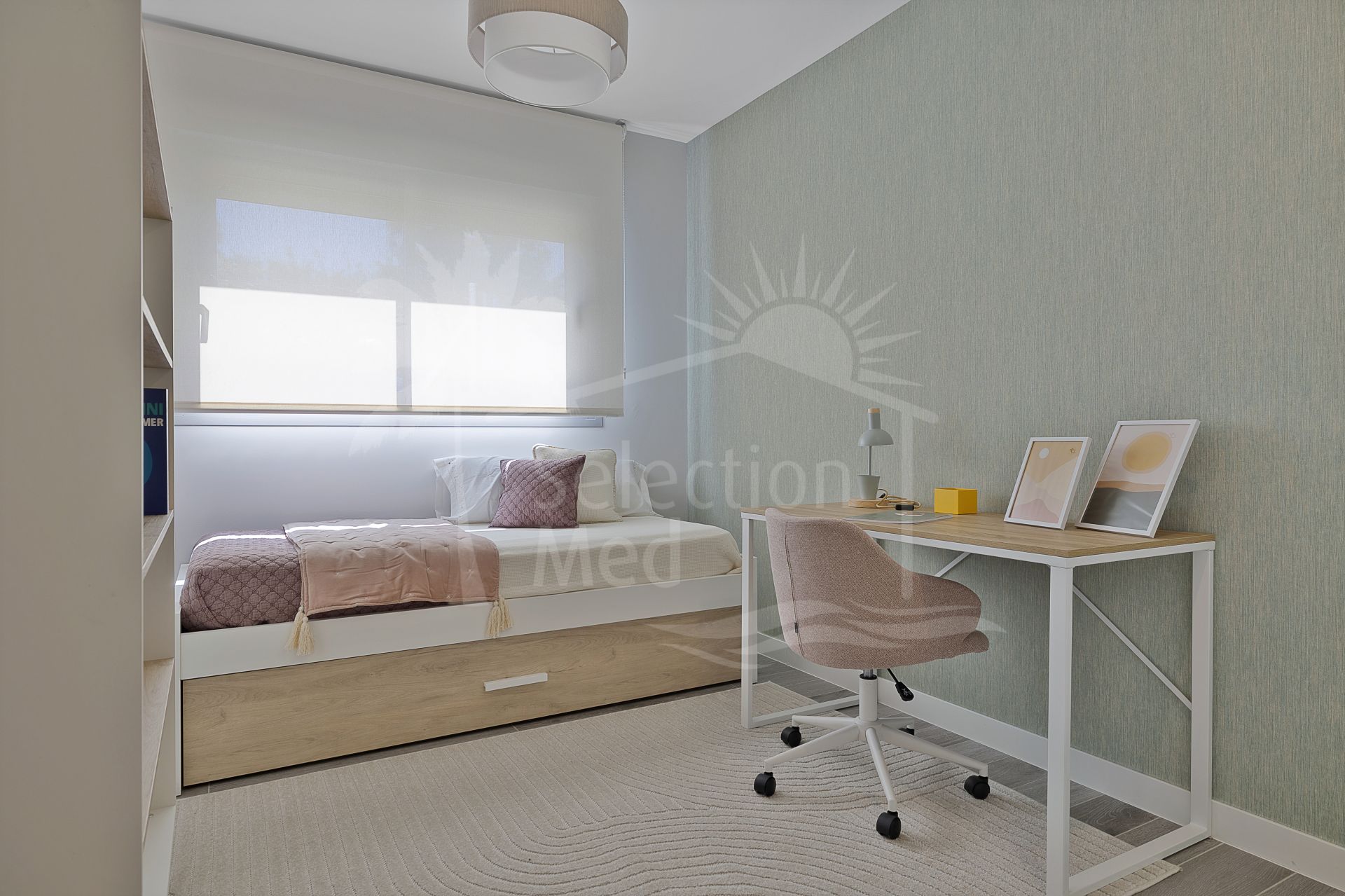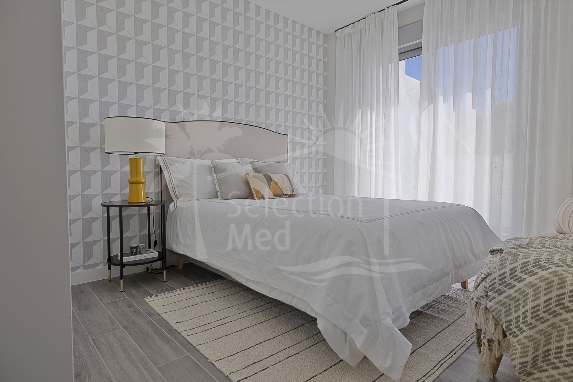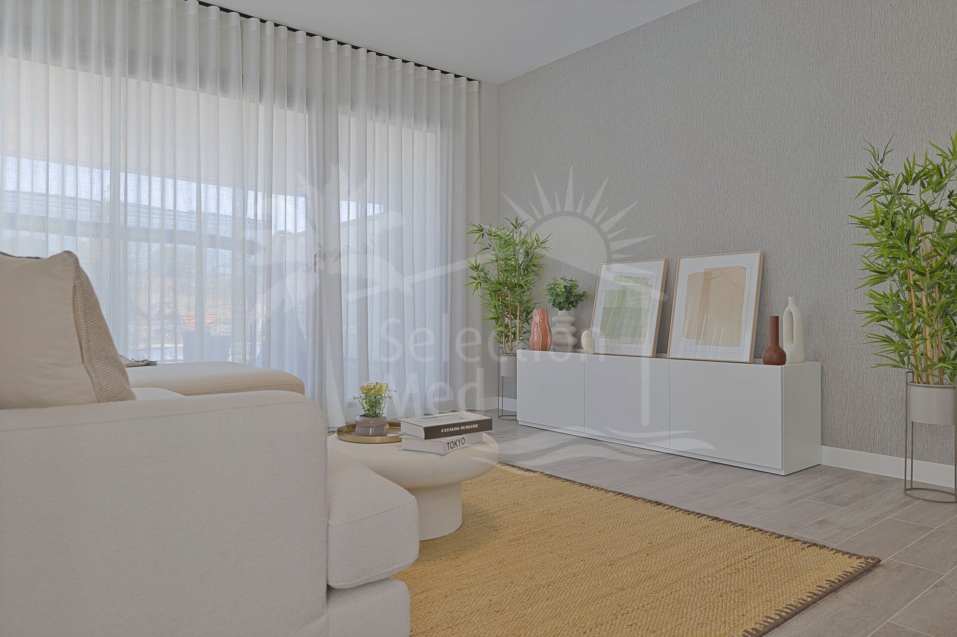 The residence is thoughtfully designed to maximise natural light and scenic views, featuring double glazing throughout. The expansive private terrace, along with both covered and uncovered sections, offers panoramic mountain vistas, partial sea views, and overlooks the communal pool. The living and dining rooms are generously proportioned, seamlessly connecting with the terrace to create an inviting atmosphere for relaxation or gatherings. The property is delivered unfurnished, allowing for personal customisation.