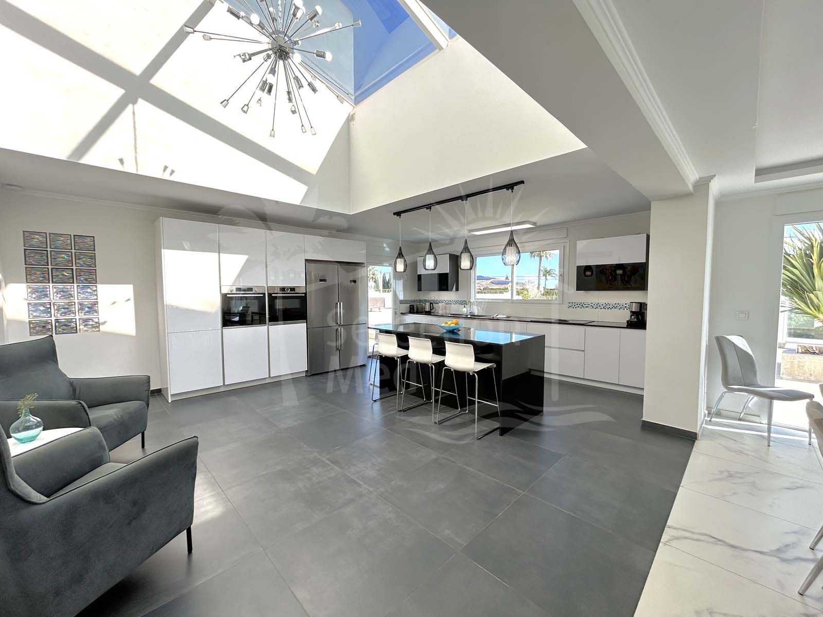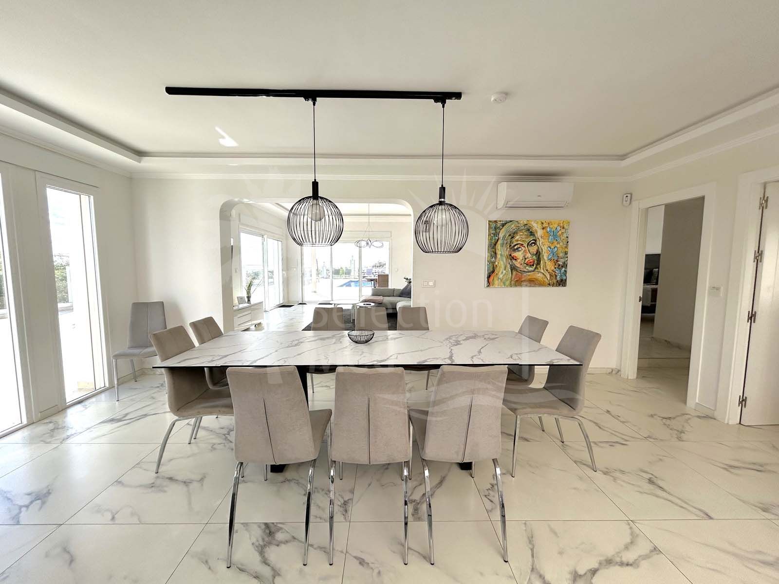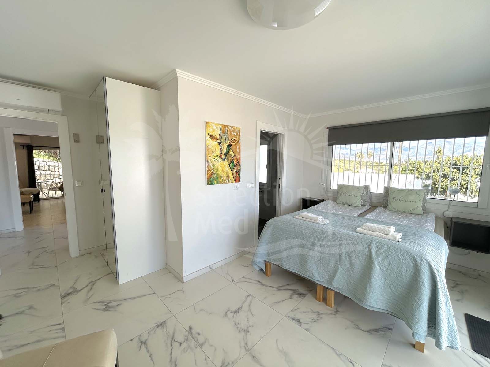 The spacious villa features six bedrooms, each with an ensuite bathroom, a fully equipped kitchen, and a separate guest apartment with its own kitchen, bedroom, bathroom, and living room. Outdoor spaces include large terraces, gardens, a solarium, a heated pool, and an outdoor dining and barbecue area. The villa also boasts air conditioning, underfloor heating, and solar panels for power and water heating.