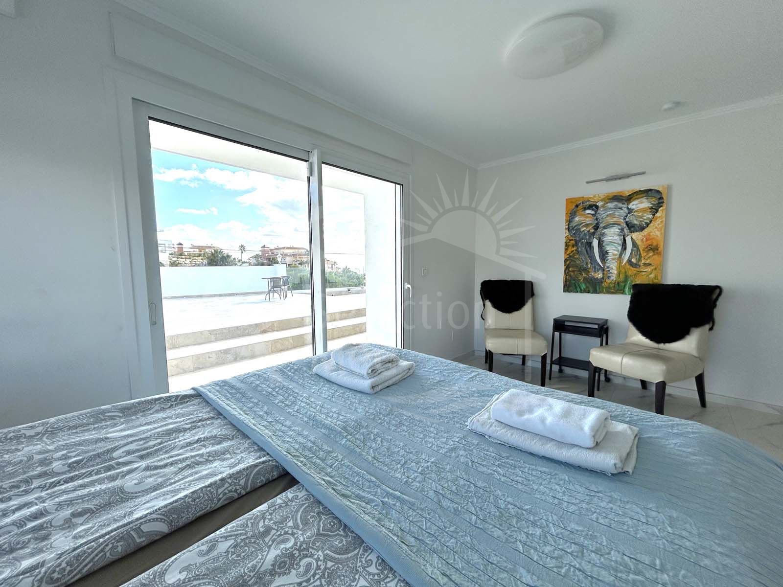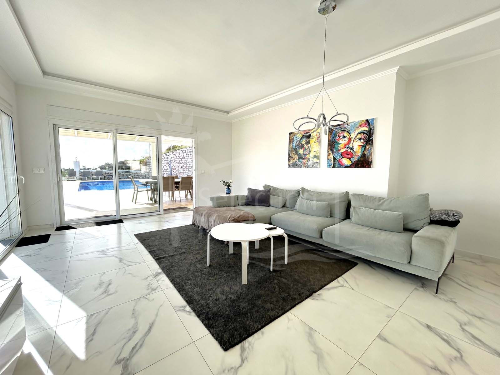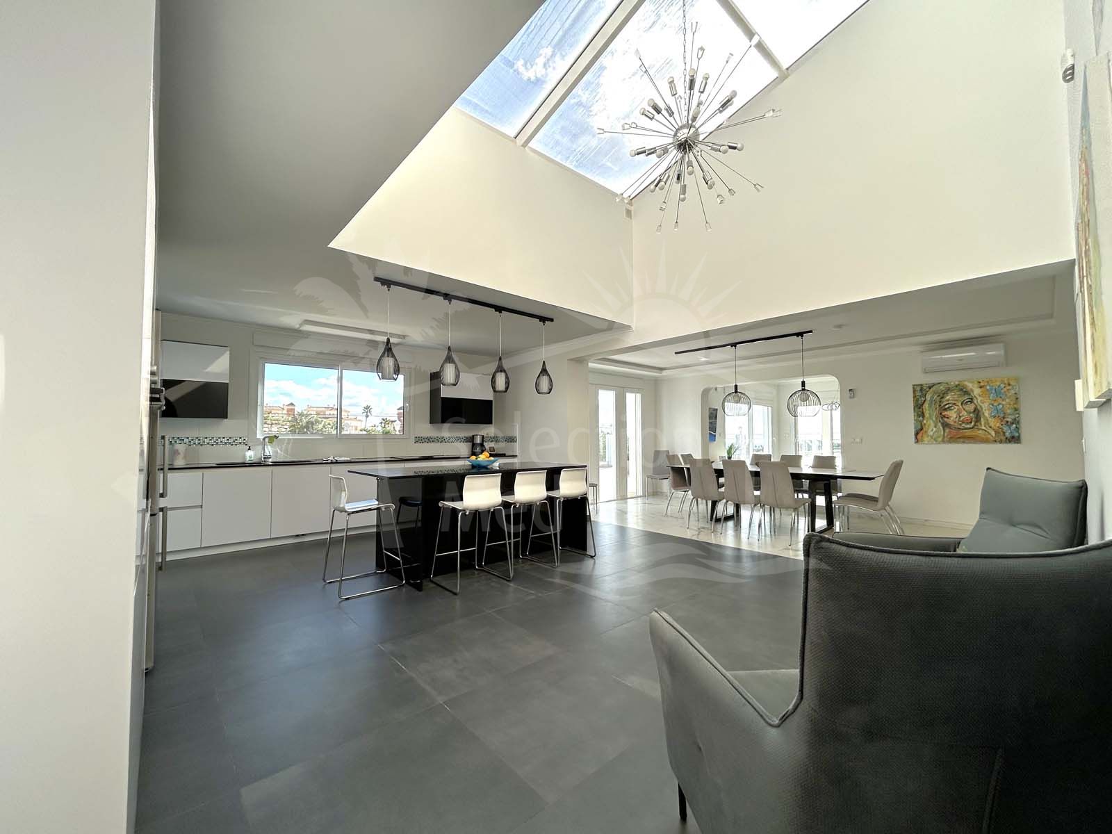 The spacious villa features six bedrooms, each with an ensuite bathroom, a fully equipped kitchen, and a separate guest apartment with its own kitchen, bedroom, bathroom, and living room. Outdoor spaces include large terraces, gardens, a solarium, a heated pool, and an outdoor dining and barbecue area. The villa also boasts air conditioning, underfloor heating, and solar panels for power and water heating.