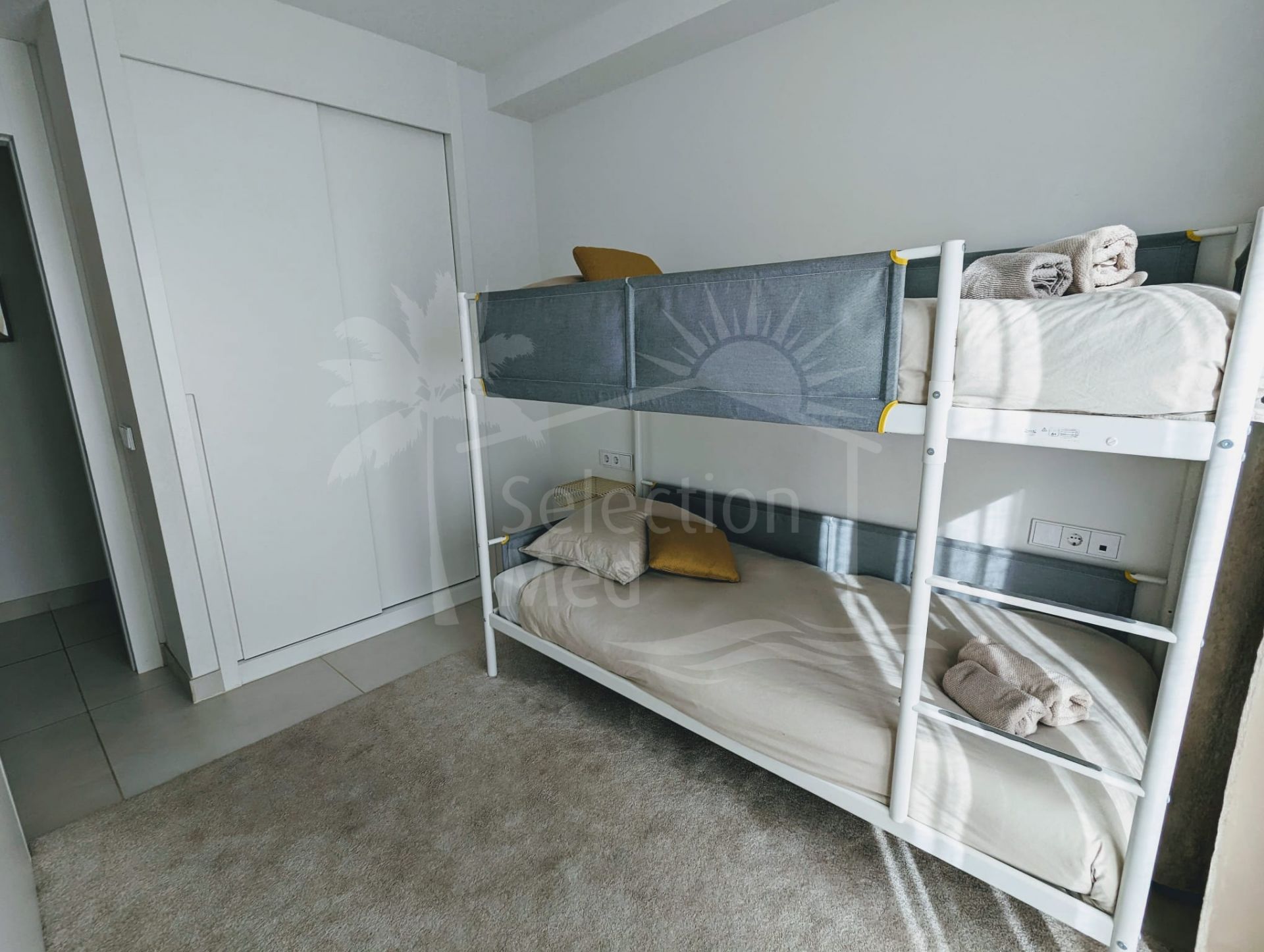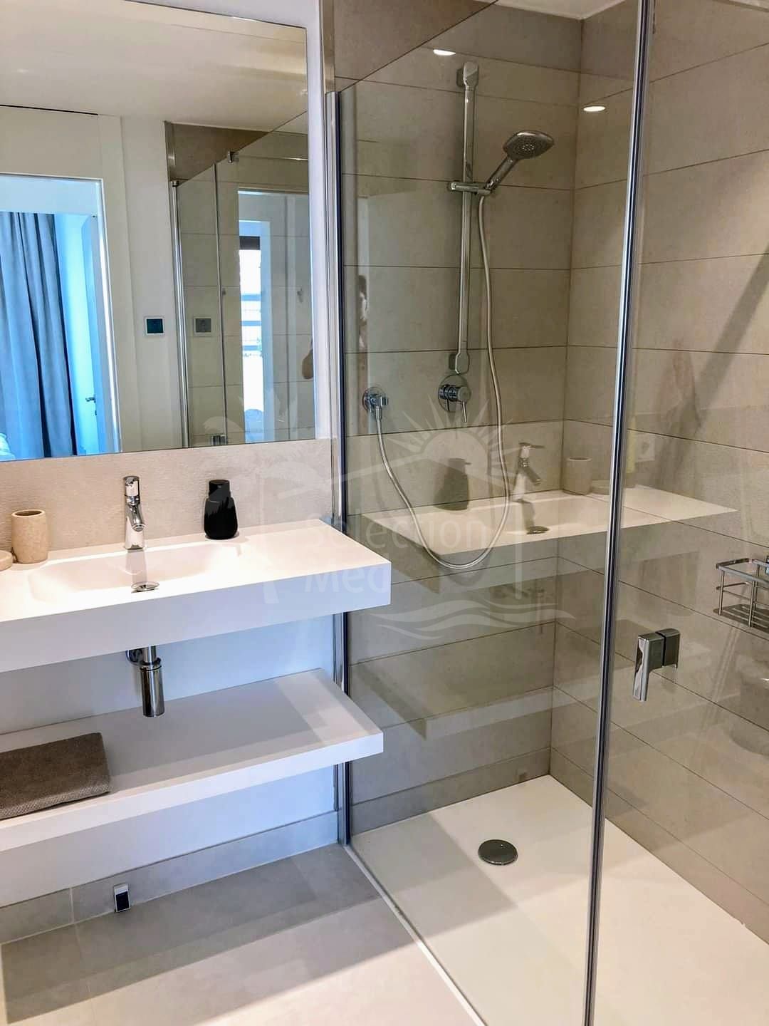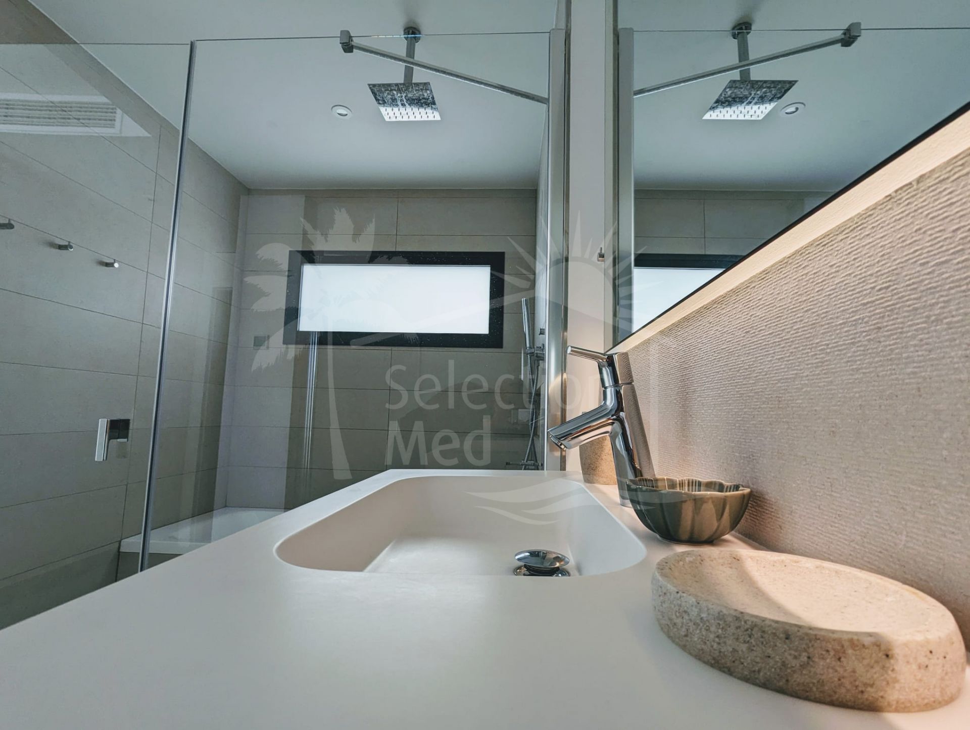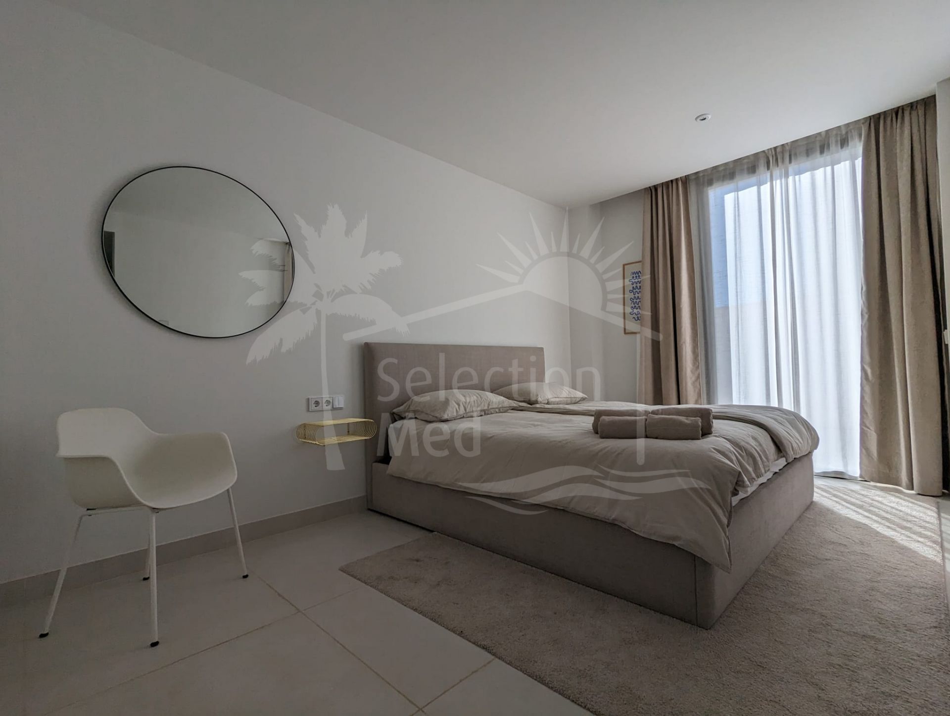 It consists of 3 double bedrooms, all with direct access to the terrace, 2 full bathrooms with a beautiful design, a high-quality fully equipped open-plan kitchen with laundry room, and a living room.