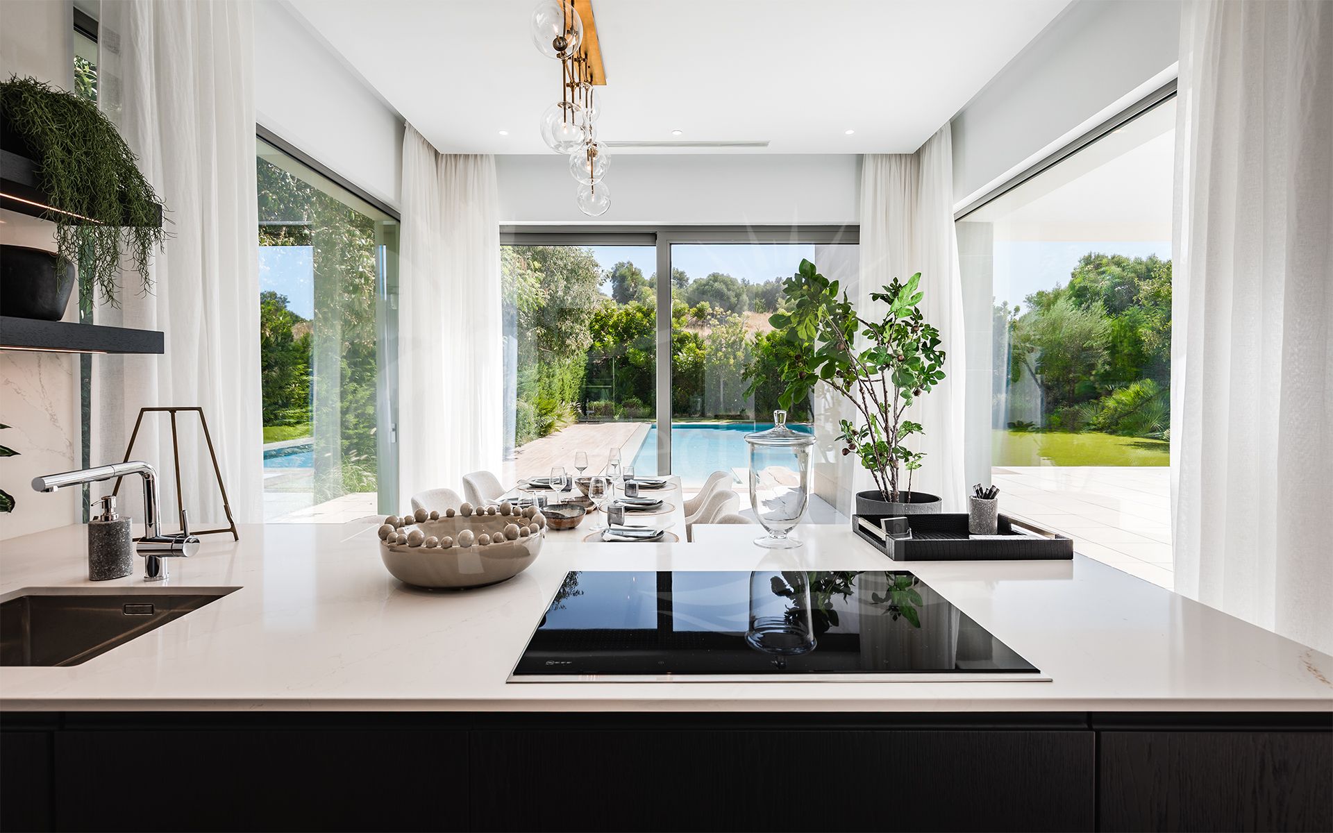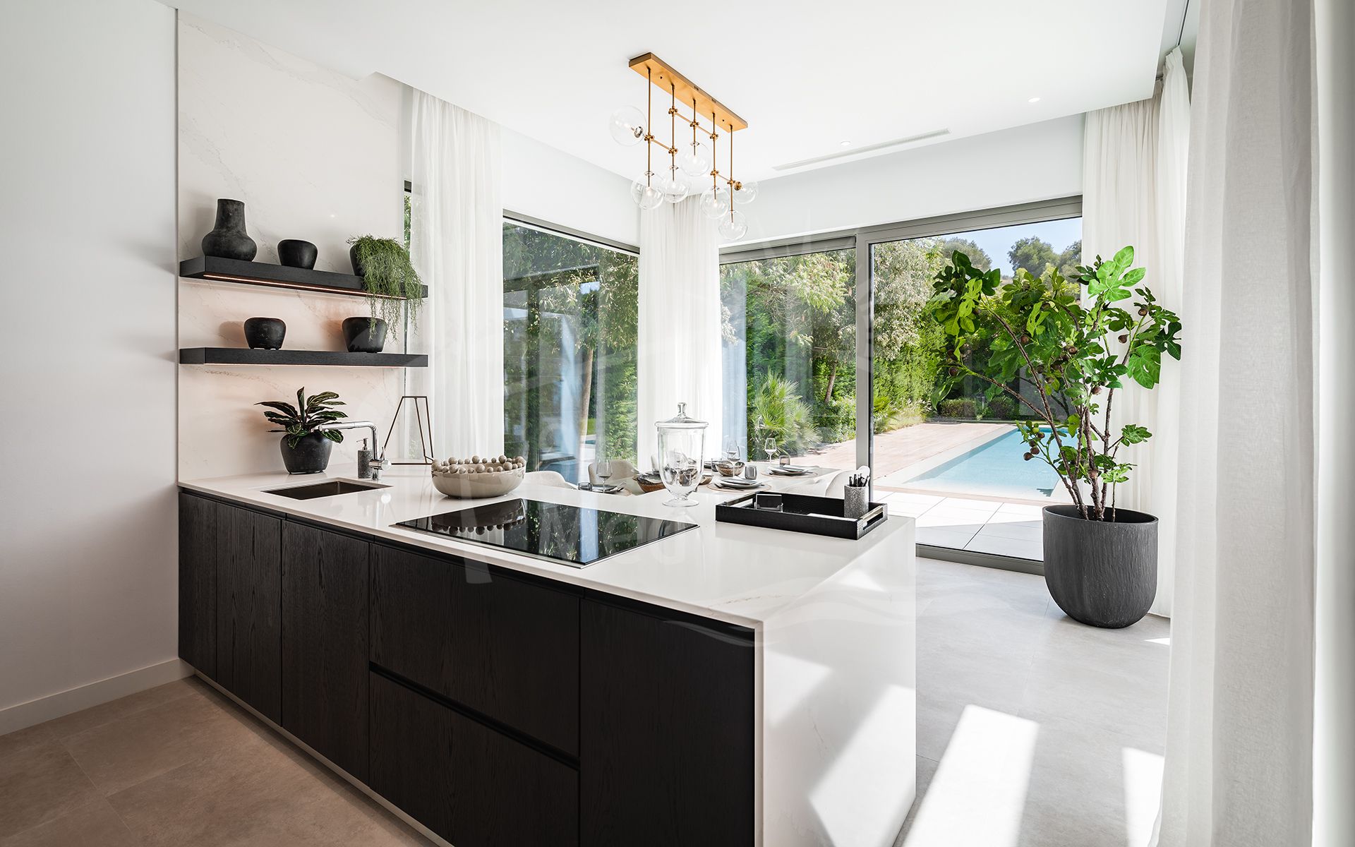 Designed with a focus on light, space, and comfort, the property is distributed across three levels and offers a refined layout ideal for modern living. The main floor features a spacious open-plan living and dining area, seamlessly connected to a fully fitted high-end German kitchen. Large sliding doors open onto expansive, partially covered terraces with outdoor seating and dining areas, perfect for enjoying the Costa del Sol's year-round climate.