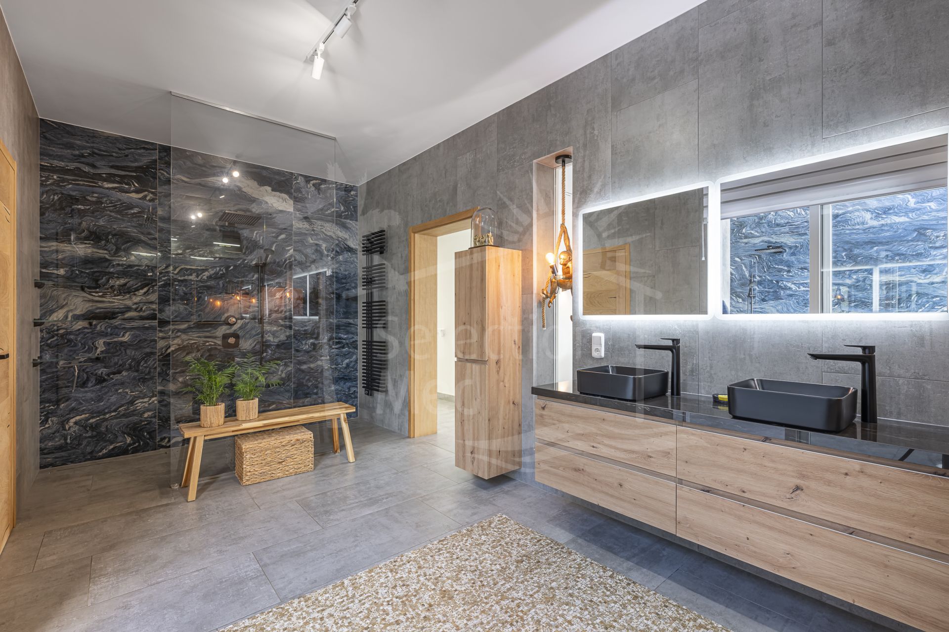 The villa’s lower pool level features a self-contained apartment with private access, offering three bedrooms, 2 bathrooms, and a shower, ideal for guests, extended family, or home office. Other features include solar panels with potential for expansion, underfloor heating, three garages, and a spacious driveway for up to five cars.