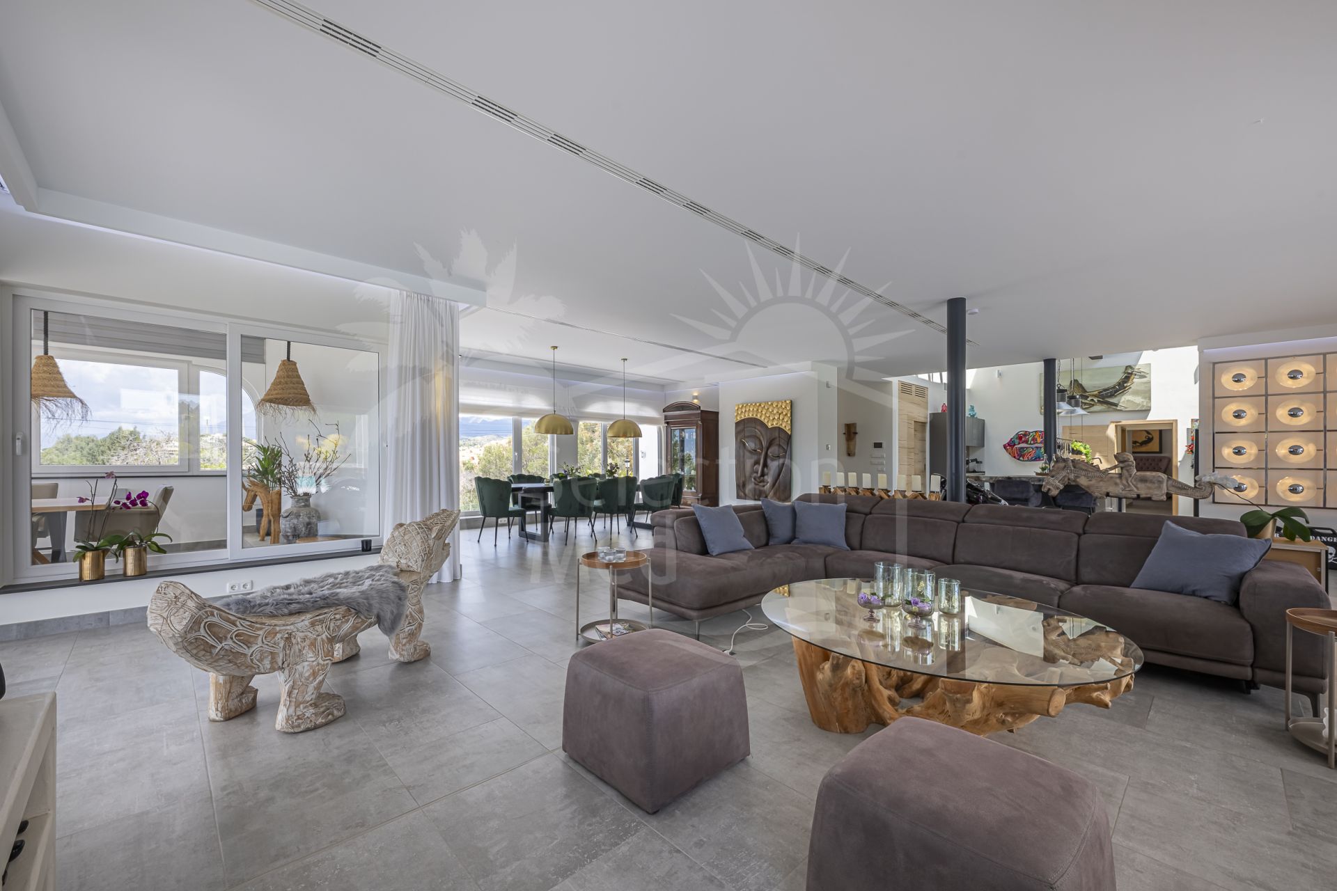 What makes this property stand out are the exceptional outdoor areas. The beautifully maintained garden surrounds the home, filled with quiet corners perfect for reading or relaxing. The terraces are extensive and varied, offering postcard-perfect views across the hills and out to the sea – the kind of views that never get old. Two stunning swimming pools enhance the appeal: one located at the main living level for easy access and another on a lower terrace, offering breathtaking views. Chill-out zones are dotted throughout the grounds, including a BBQ area, two outdoor dining spaces, a bar and both shaded and sunny spots to enjoy throughout the day.