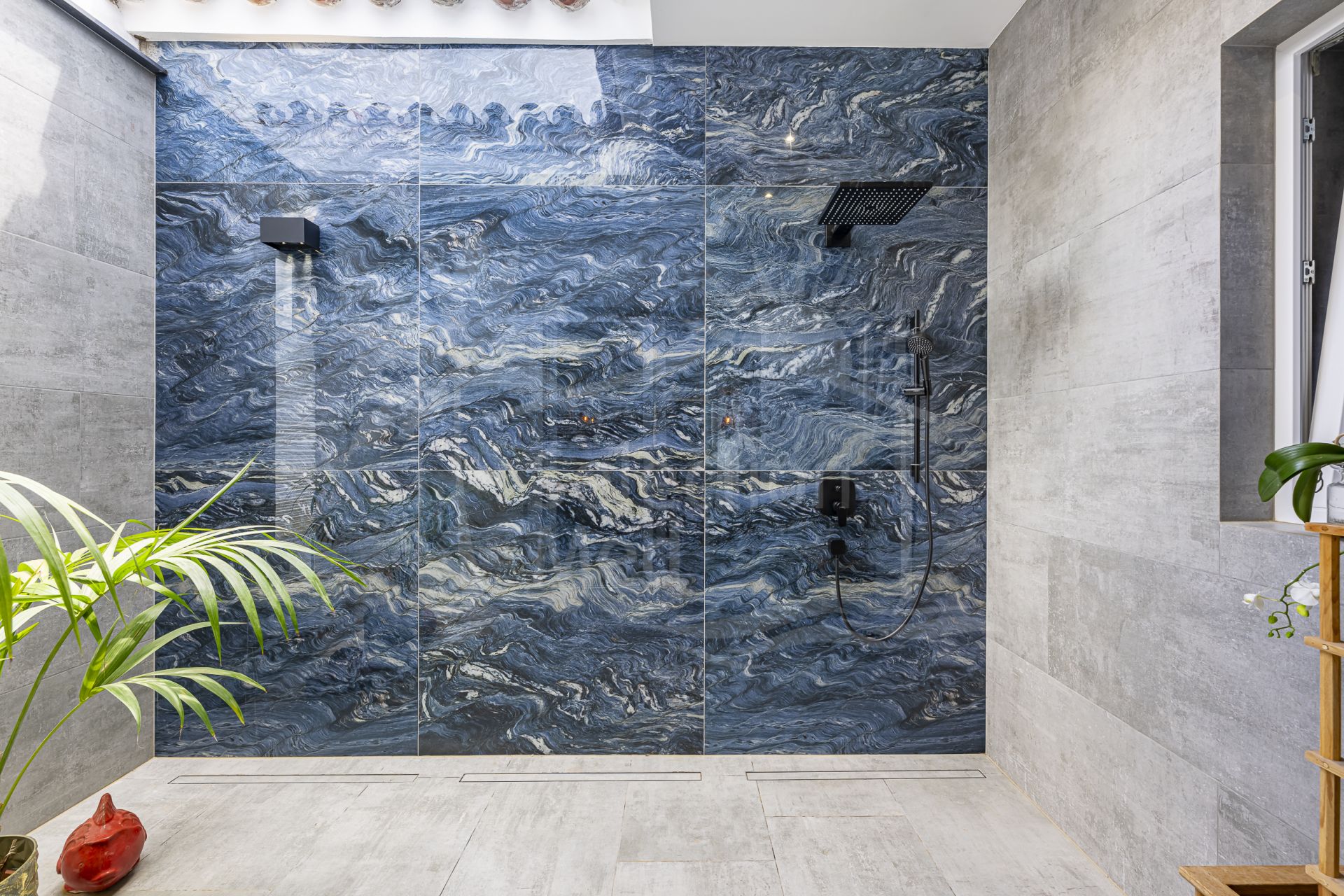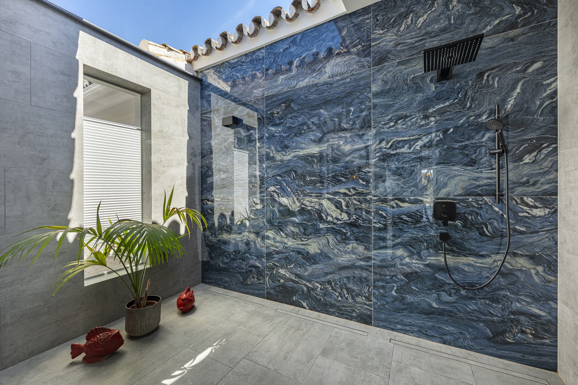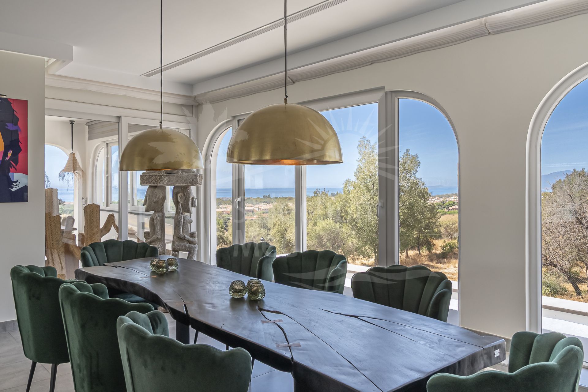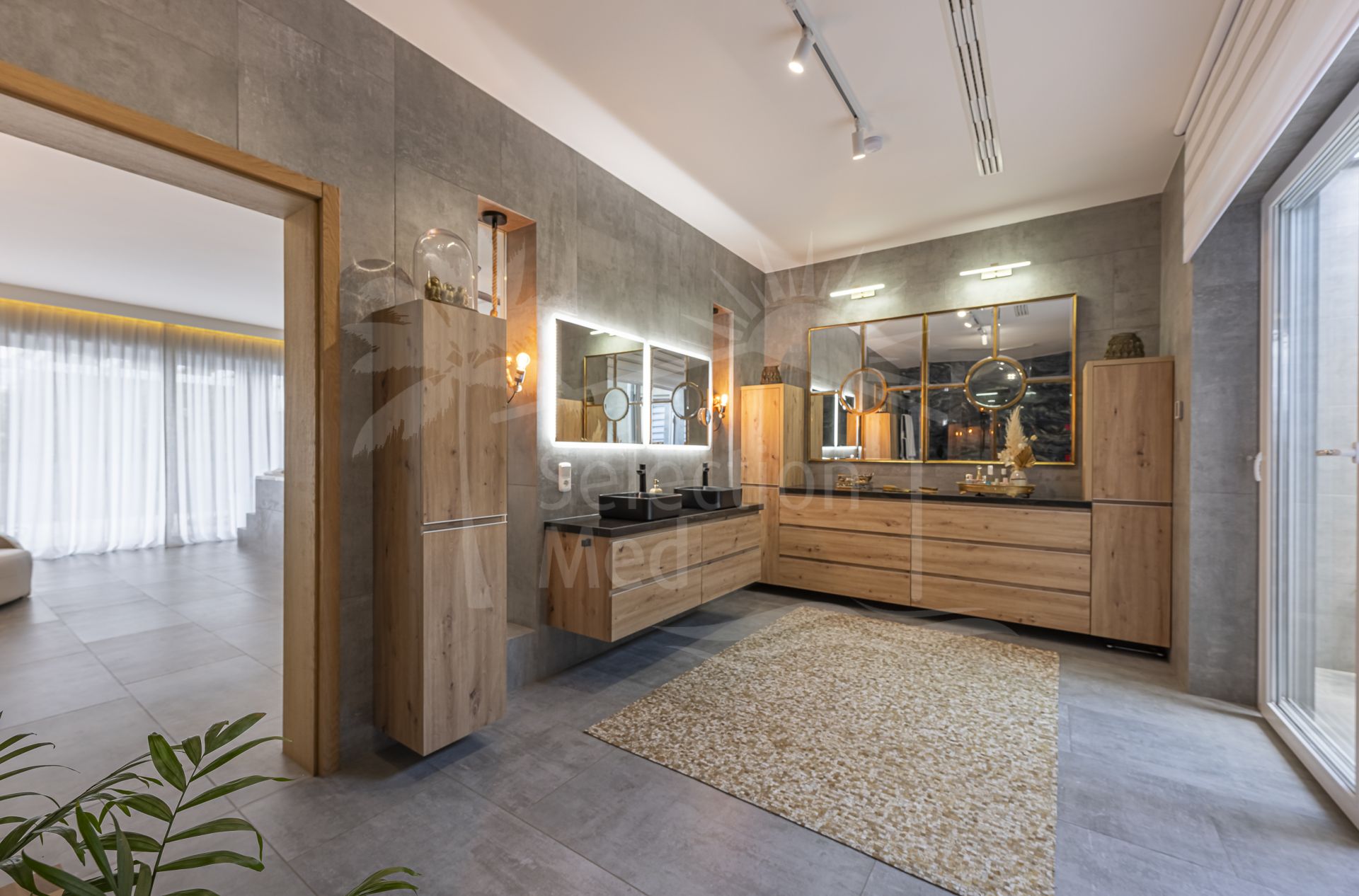 Inside, the villa feels bright, open and welcoming. The heart of the home is the spacious living room, designed with floor-to-ceiling glass doors that open directly onto the terrace, framing fantastic views of the sea and surrounding greenery. Natural light floods in from all angles, creating a warm and inviting atmosphere. The contemporary kitchen with breakfast area flows naturally into this space, making it ideal for family life and entertaining. There are four deluxe bedrooms, including a main suite with indoor and outdoor showers.