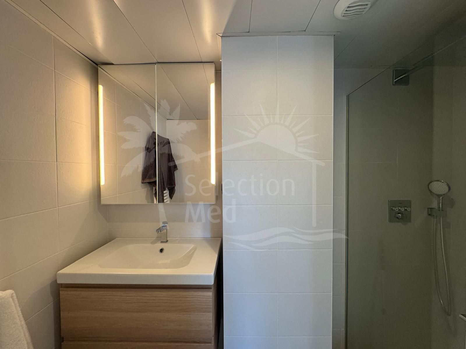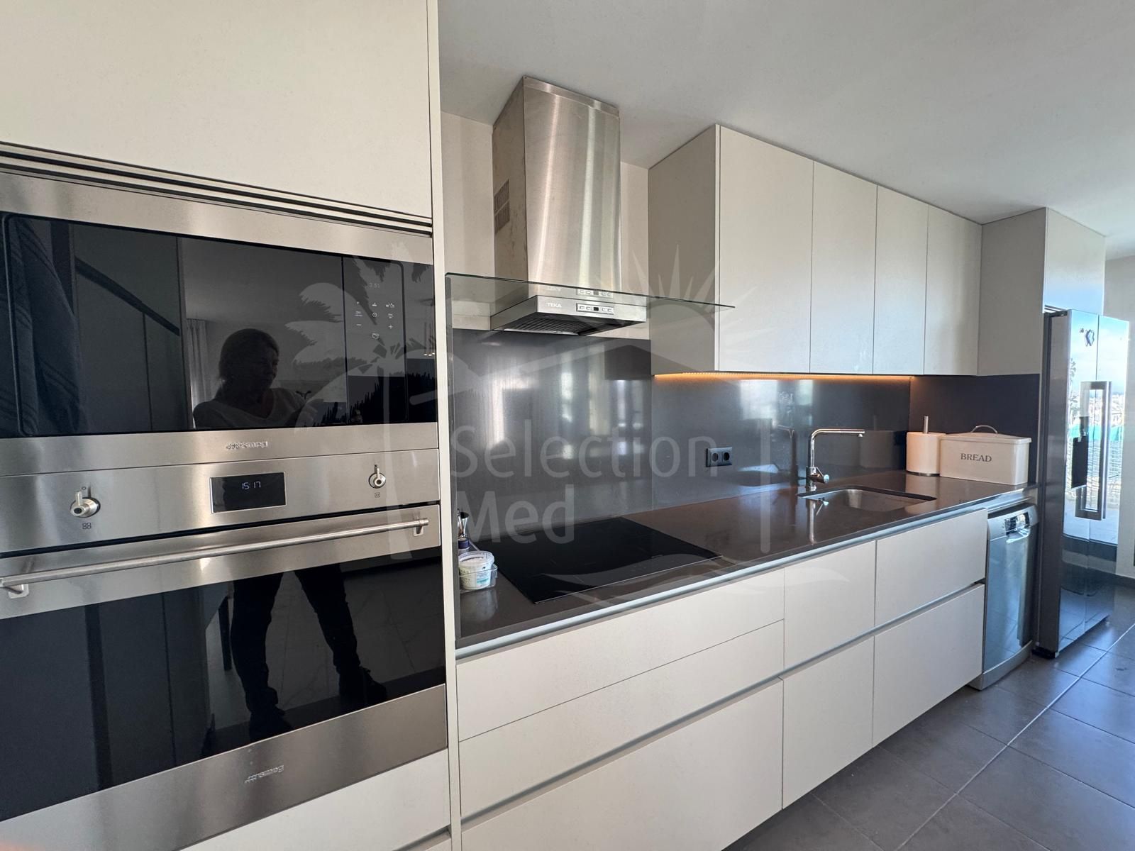 The interior is bright and stylish, with a sleek kitchen fully equipped with premium SMEG and BOSCH appliances, while the impressive 74 m² terrace wraps around the apartment, offering nearly full-circle views. A partially glass-enclosed area on the terrace ensures year-round enjoyment of the breath taking scenery.