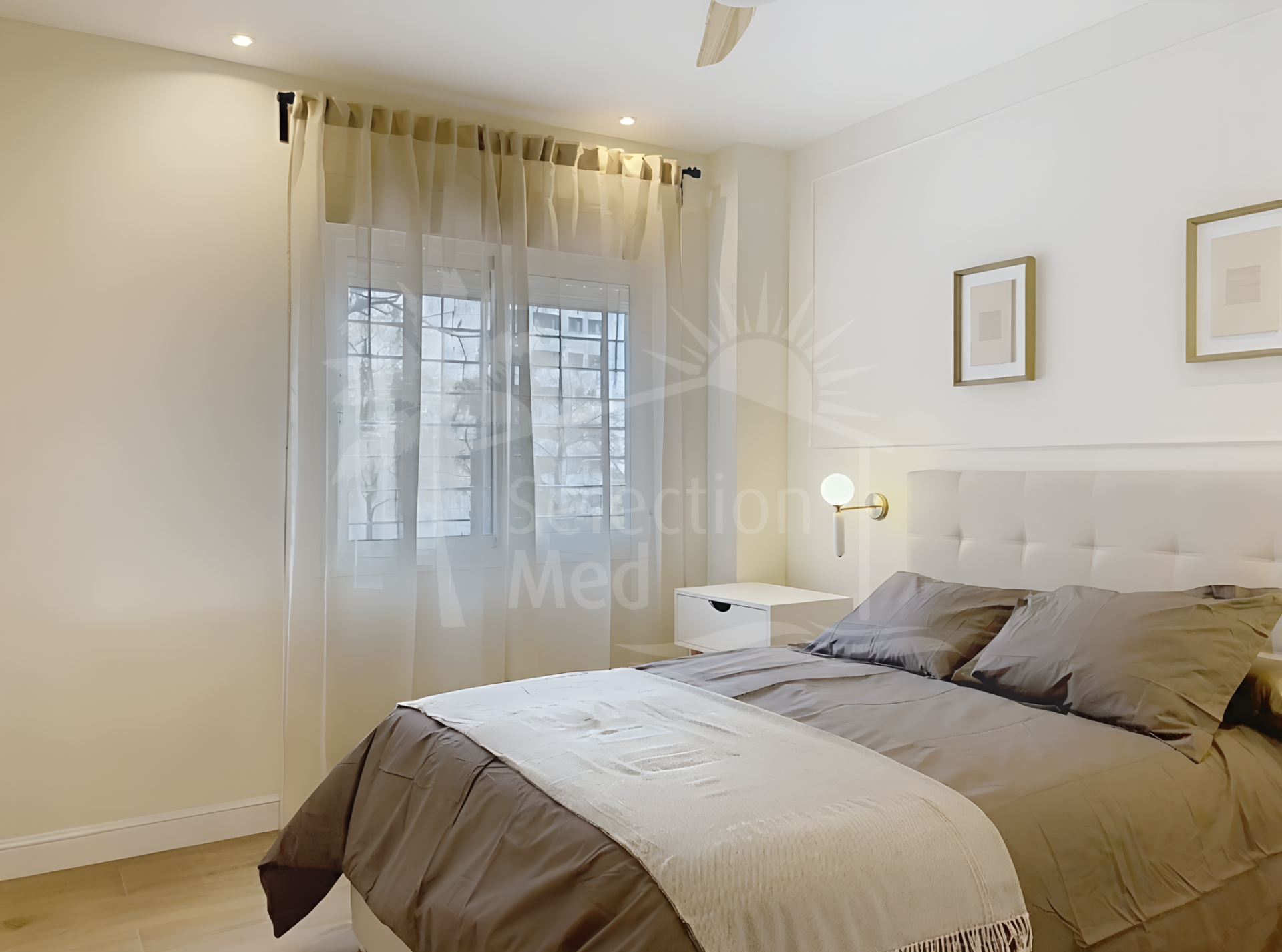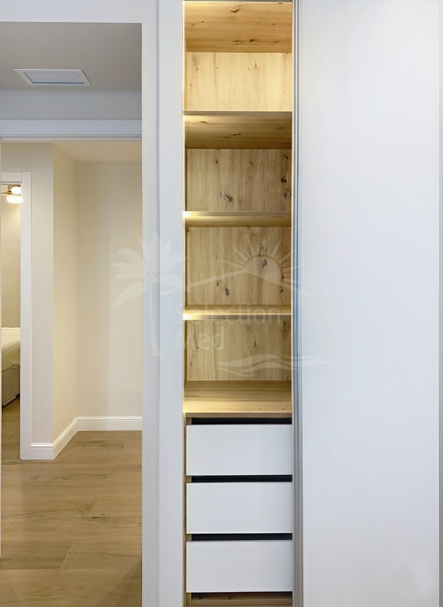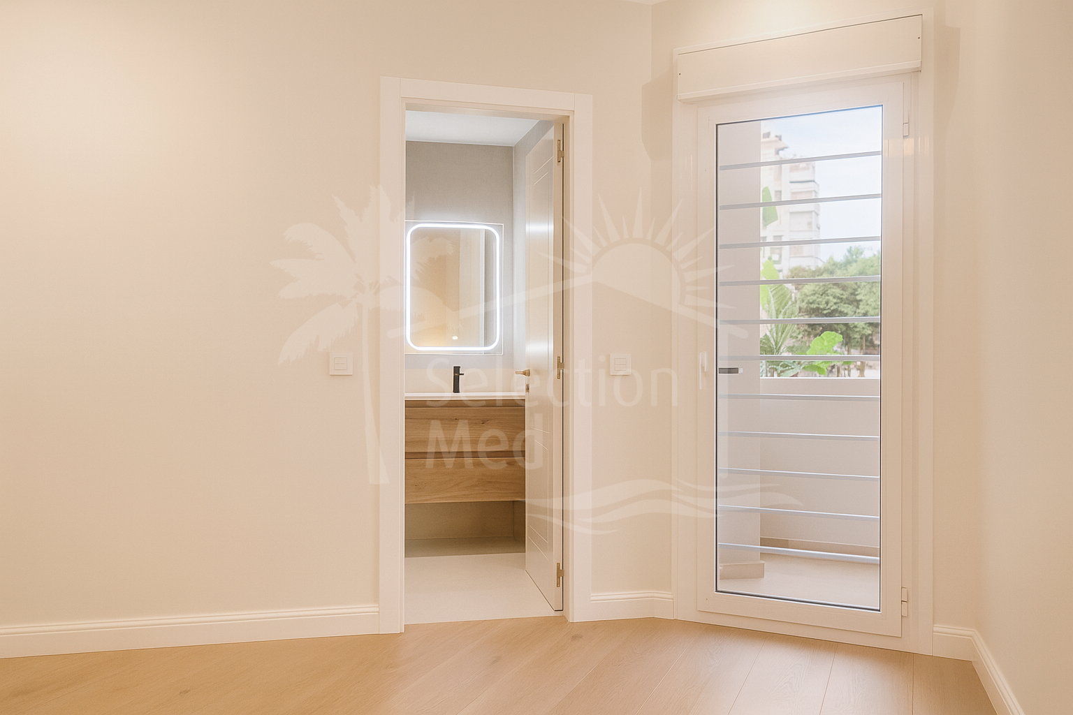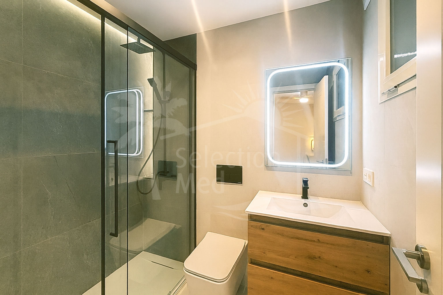 The apartment features three spacious bedrooms, all with new, lined, and illuminated built-in wardrobes, as well as ceiling fans and a powerful air conditioning system (8,000 frigories) that ensures maximum comfort throughout the year. The master bedroom has an en-suite bathroom with a modern shower and access to a balcony overlooking the interior of the complex, while the other two bedrooms—one currently used as a dressing room—share a second full bathroom. Both bathrooms stand out for their complete renovation with top-quality finishes, each featuring exterior windows that provide perfect ventilation. They include sliding glass shower screens designed to offer greater comfort and elegance.