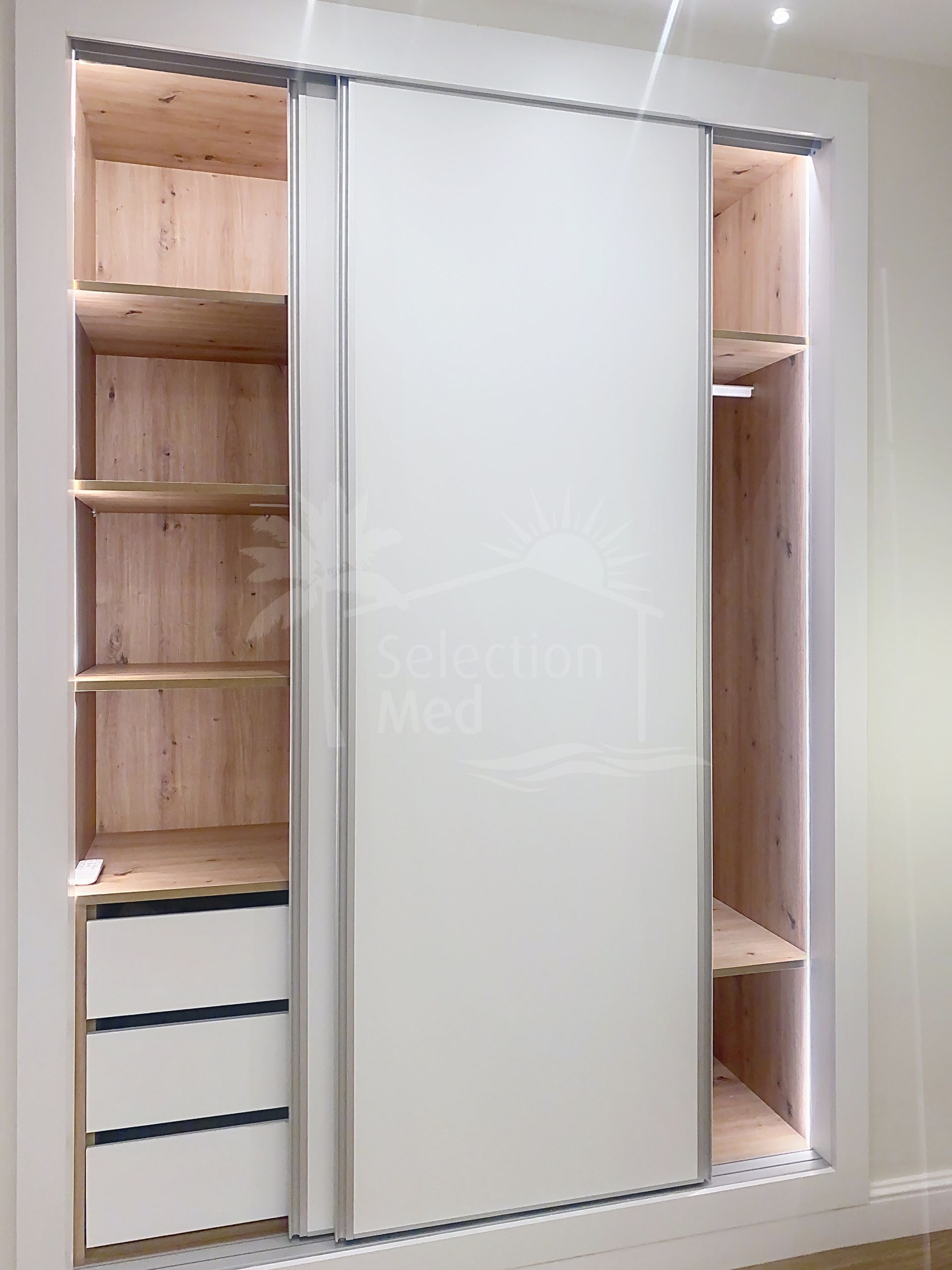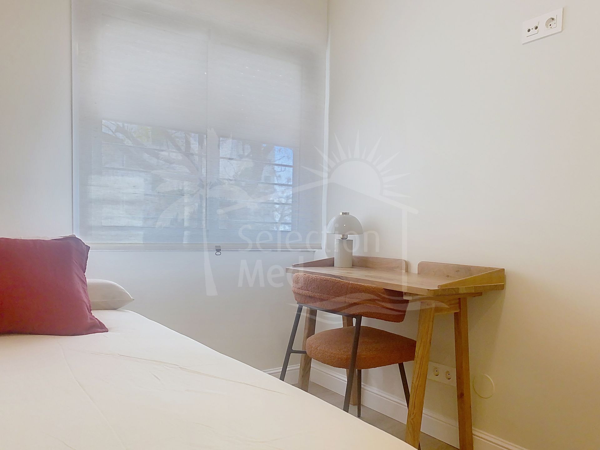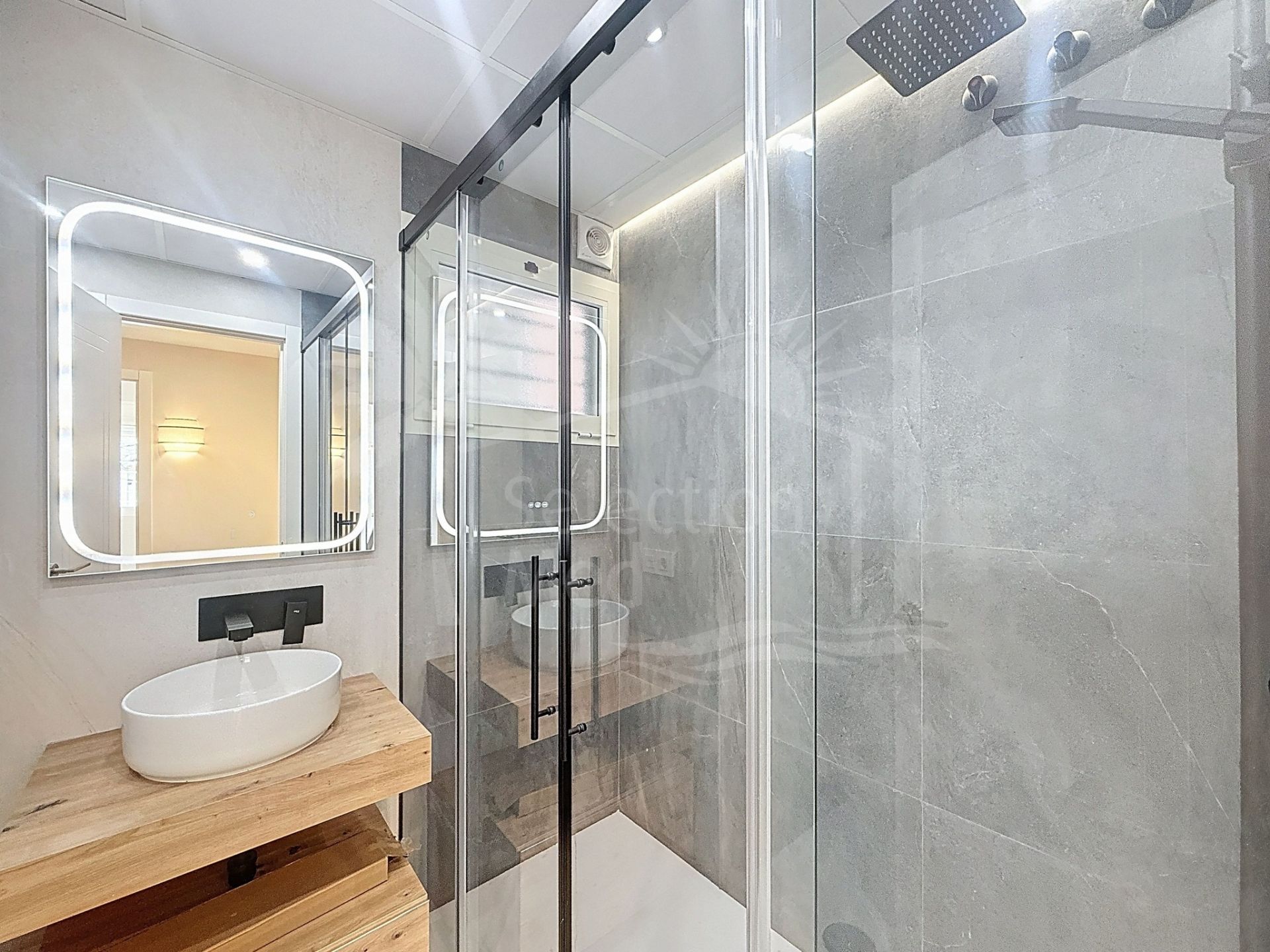 The apartment features three spacious bedrooms, all with new, lined, and illuminated built-in wardrobes, as well as ceiling fans and a powerful air conditioning system (8,000 frigories) that ensures maximum comfort throughout the year. The master bedroom has an en-suite bathroom with a modern shower and access to a balcony overlooking the interior of the complex, while the other two bedrooms—one currently used as a dressing room—share a second full bathroom. Both bathrooms stand out for their complete renovation with top-quality finishes, each featuring exterior windows that provide perfect ventilation. They include sliding glass shower screens designed to offer greater comfort and elegance.