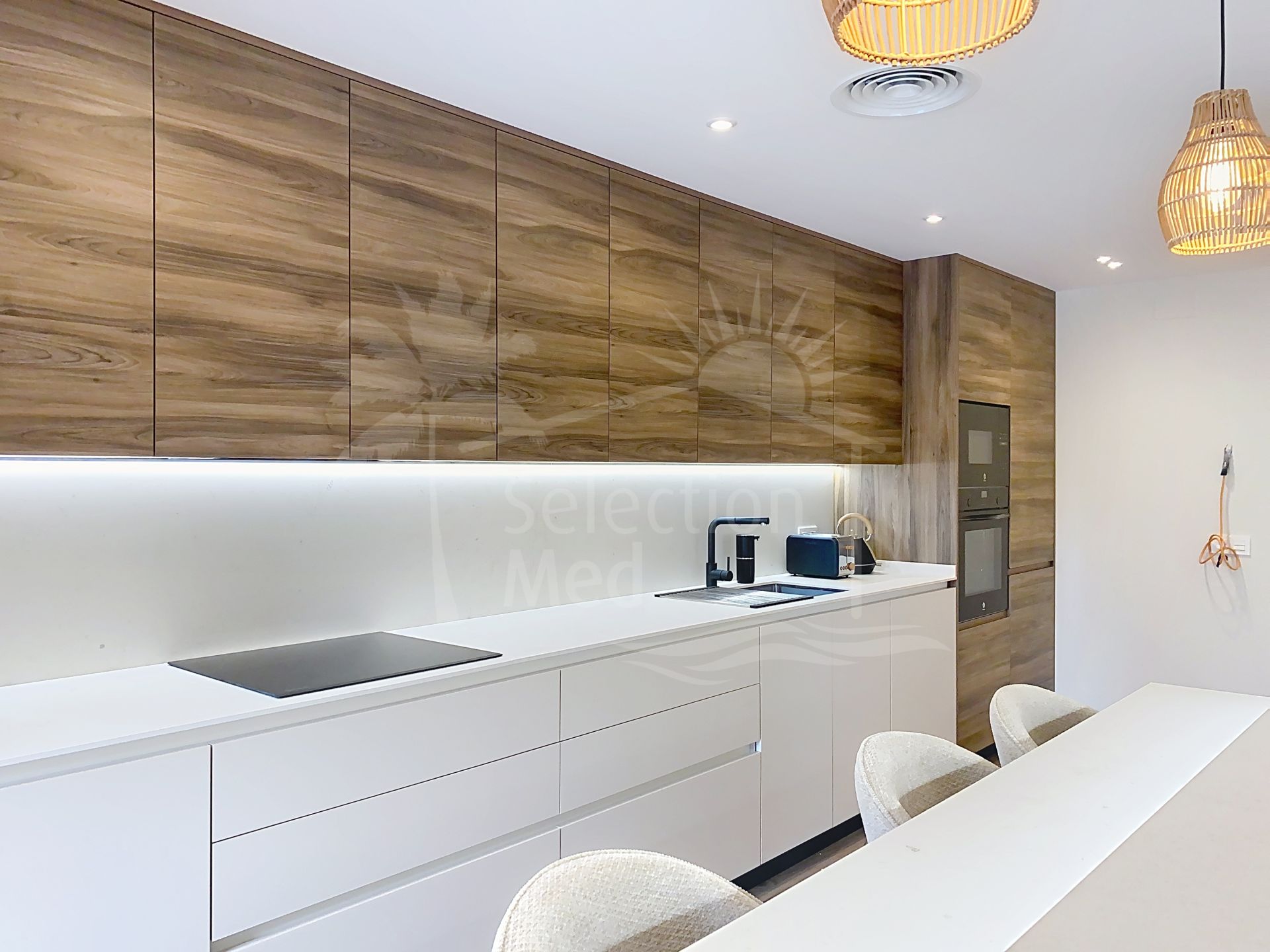 The interior layout includes a spacious and bright living room with direct access to a cozy private terrace of 7 m² with open views. The designer kitchen, fully equipped and with integrated laundry area, offers a practical and elegant space, connected to the terrace and open to the living room through a large peninsula.