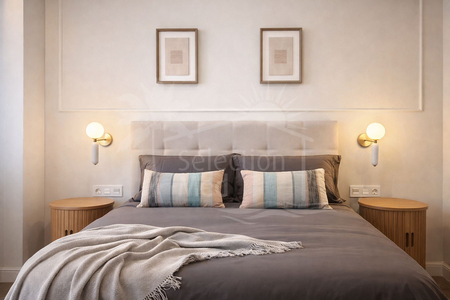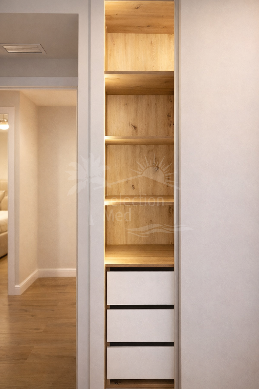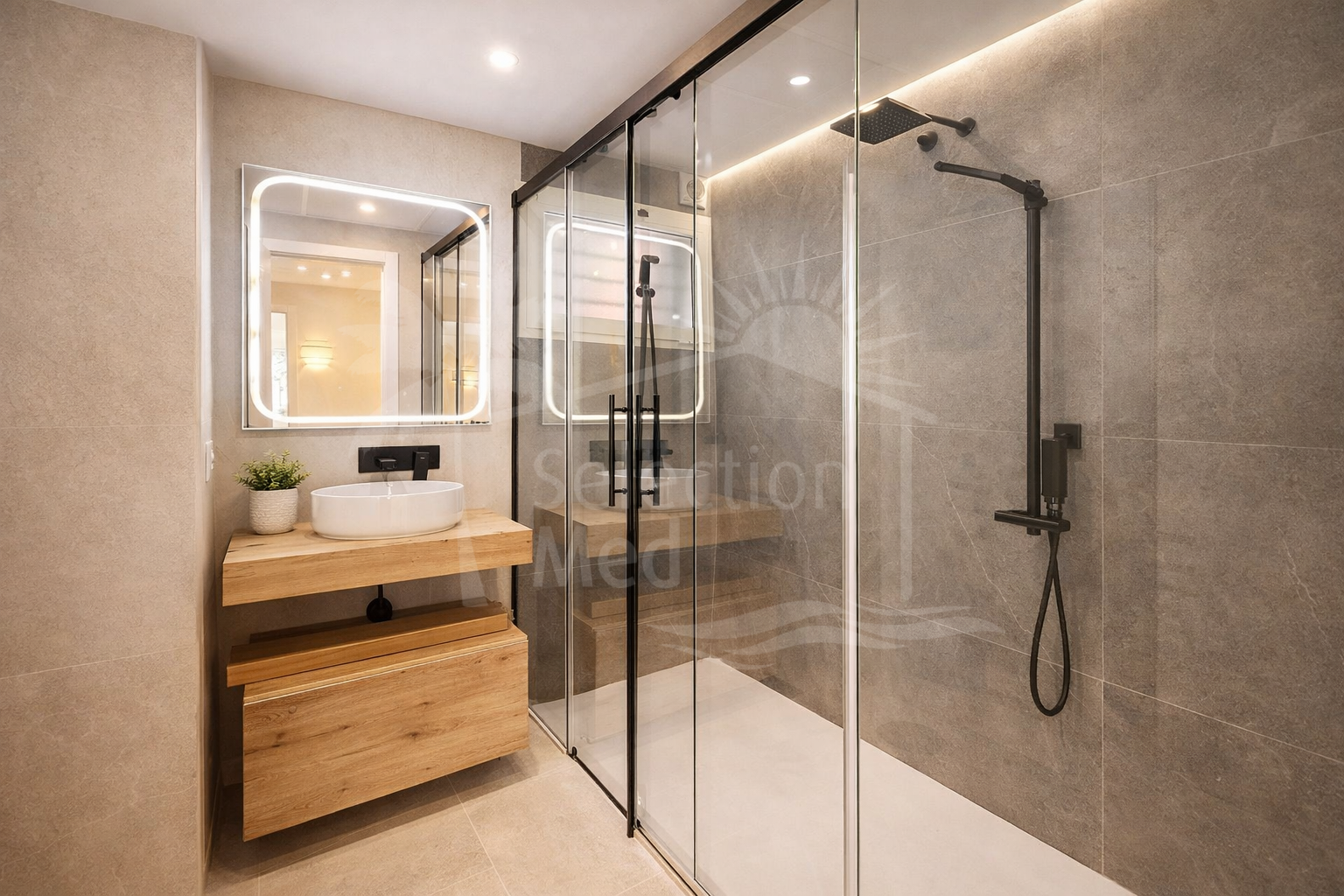 The apartment features three spacious bedrooms, all with new, lined, and illuminated built-in wardrobes, as well as ceiling fans and a powerful air conditioning system (8,000 frigories) that ensures maximum comfort throughout the year. The master bedroom has an en-suite bathroom with a modern shower and access to a balcony overlooking the interior of the complex, while the other two bedrooms—one currently used as a dressing room—share a second full bathroom. Both bathrooms stand out for their complete renovation with top-quality finishes, each featuring exterior windows that provide perfect ventilation. They include sliding glass shower screens designed to offer greater comfort and elegance.