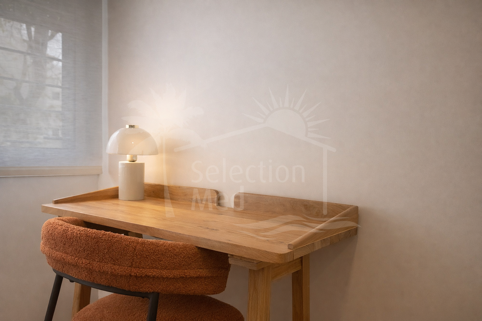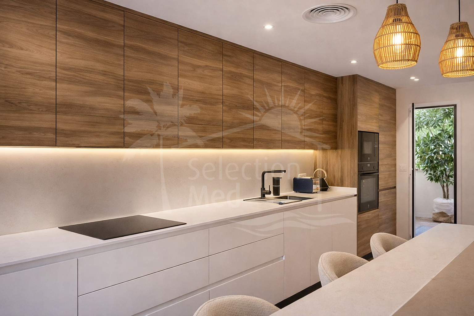The interior layout includes a spacious and bright living room with direct access to a cozy private terrace of 7 m² with open views. The designer kitchen, fully equipped and with integrated laundry area, offers a practical and elegant space, connected to the terrace and open to the living room through a large peninsula.