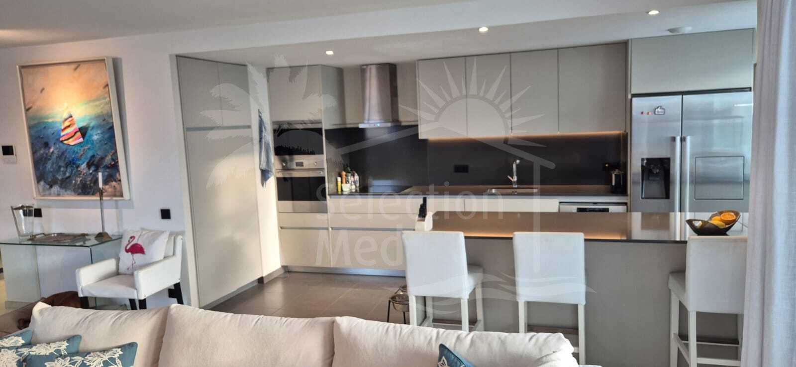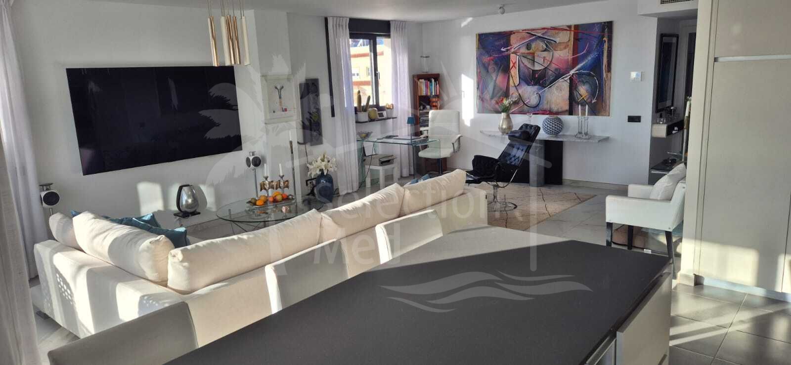 The open-plan living-dining room connects to an elegant, fully equipped kitchen, creating an ideal environment to enjoy both daily life and social gatherings. Thanks to its orientation and large windows, natural light bathes every corner of the penthouse throughout the day.