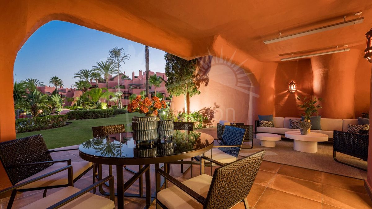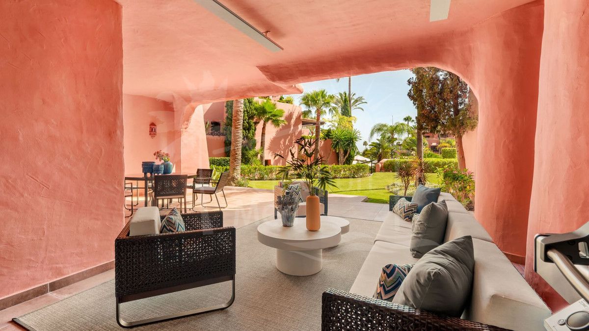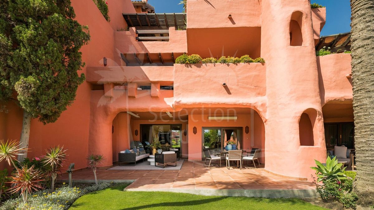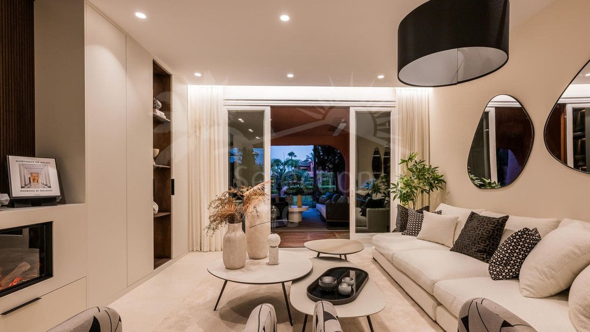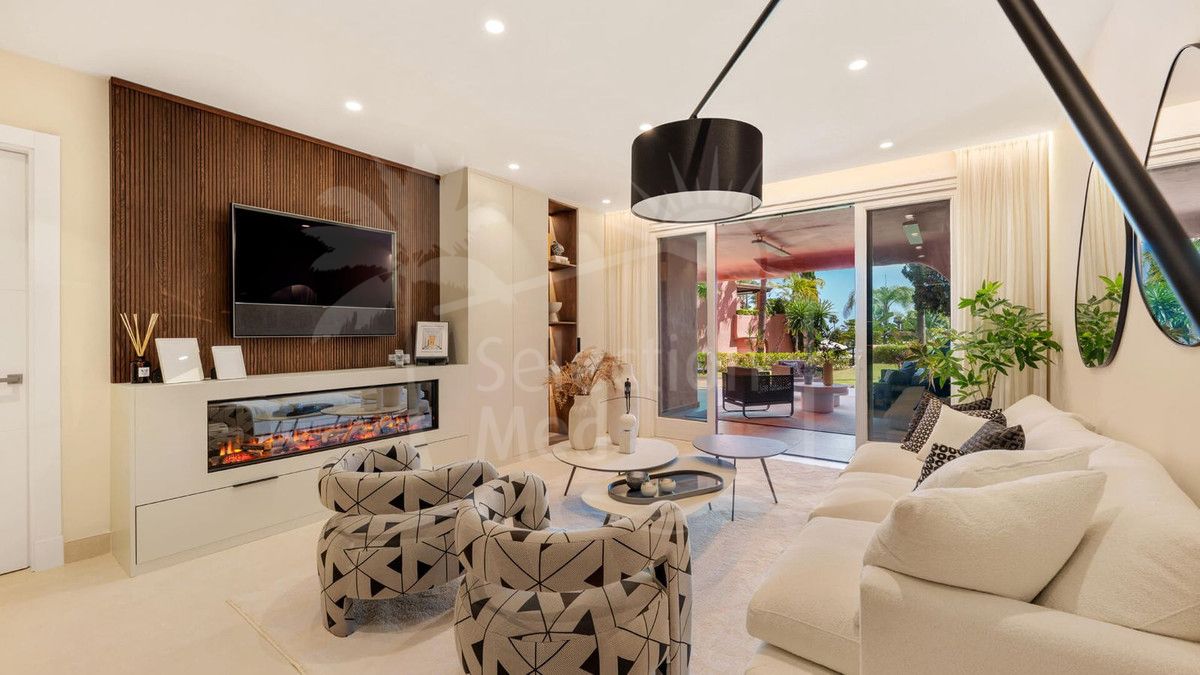 “This south facing 3 bedroom and 3-bathroom ground floor apartment has been fully renovated to the highest standards and offers delightful views of the lush landscaped gardens. With a total built area of 142 m2 and a spacious private terrace of 60 m2, this apartment provides an ample and luxurious open living space. It features elegant floors, a brand-new designer kitchen with Miele appliances, a Bang & Olufsen sound system, tailormade wardrobes and an electric fireplace. It is ideal for people who are looking for refined luxury beachfront living at its best.