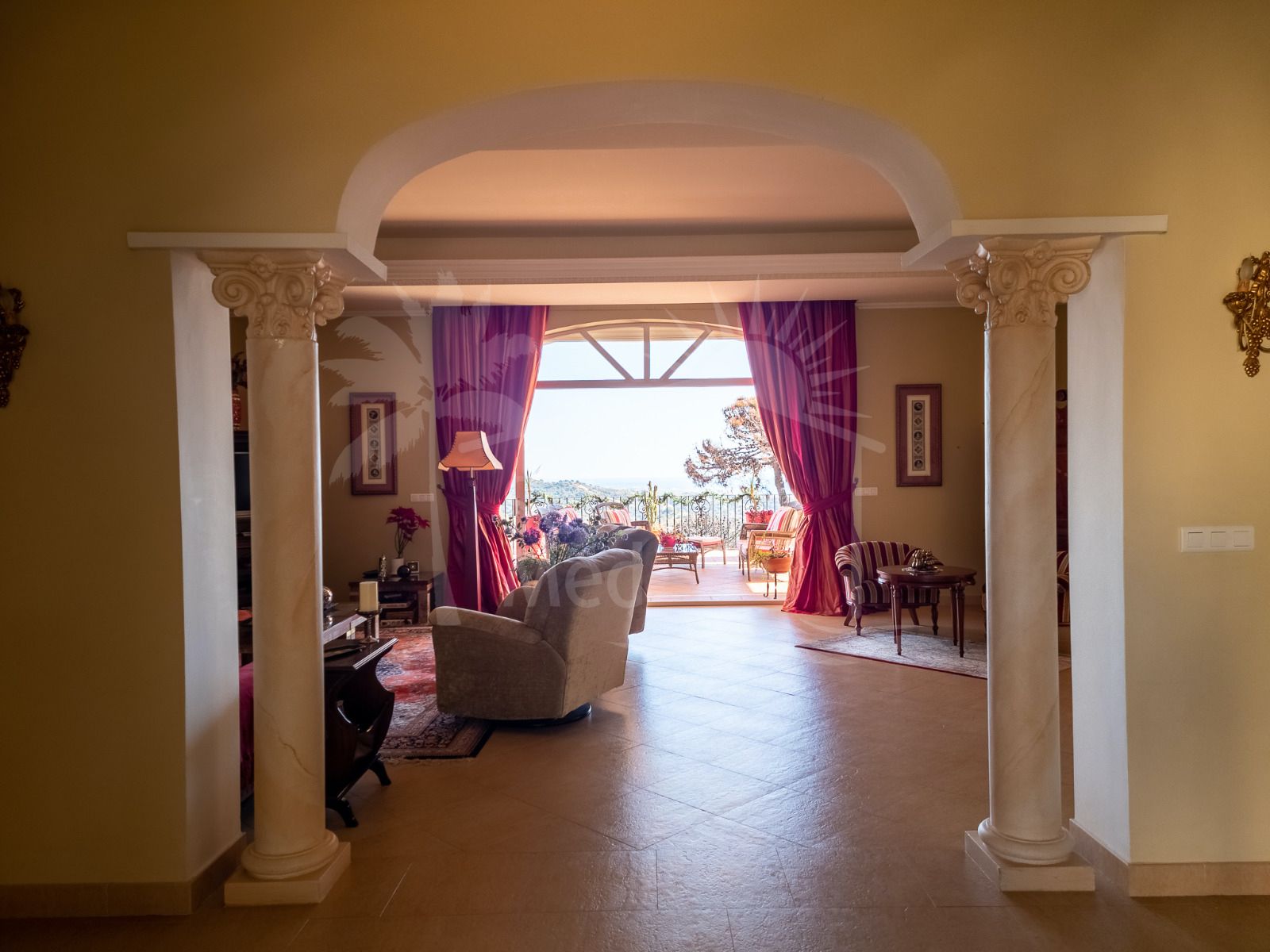 From the moment you arrive, the sense of space and light is striking. The main reception area features a beautifully proportioned living room with large south-facing windows that bathe the interiors in natural light while framing the spectacular views beyond. The living area flows effortlessly onto an expansive panoramic terrace, creating a seamless connection between indoor and outdoor living.