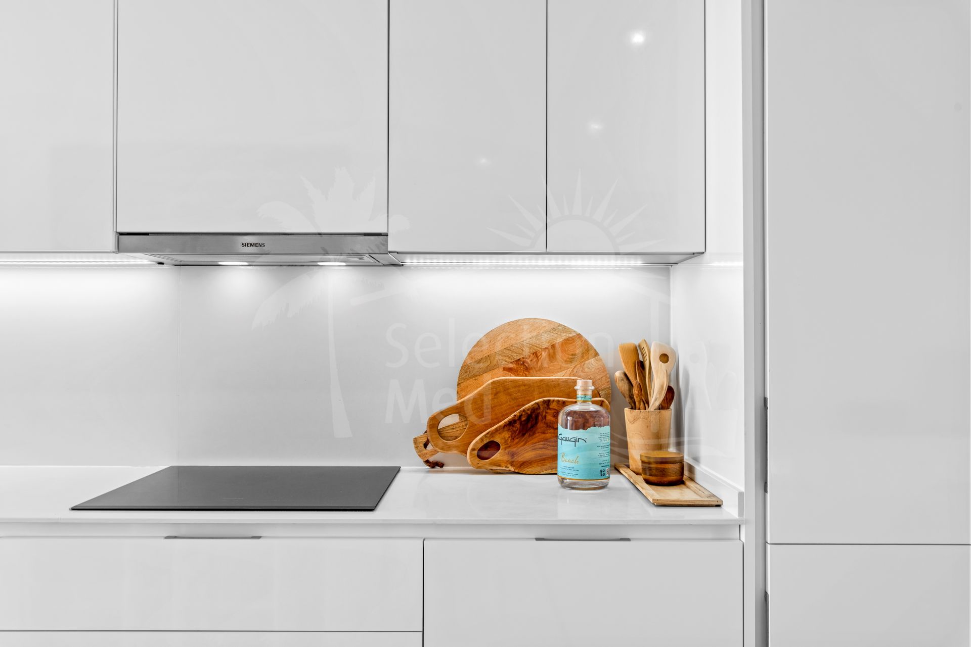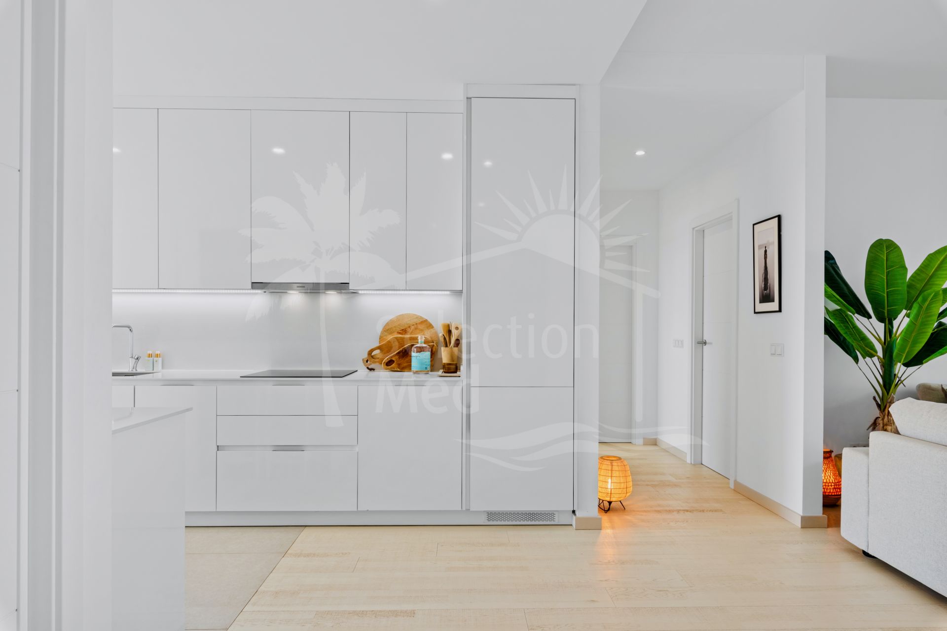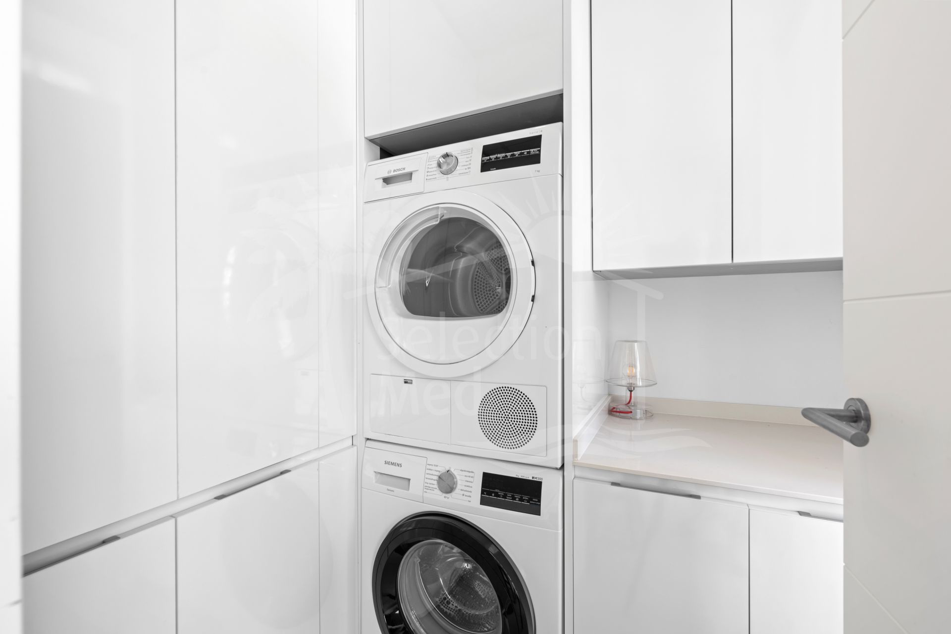 The finishes throughout the apartment are of high quality, enhancing every corner with elegance and attention to detail. The modern open kitchen with Siemens appliances and a breakfast bar is perfect for hosting, and connects to a utility room.