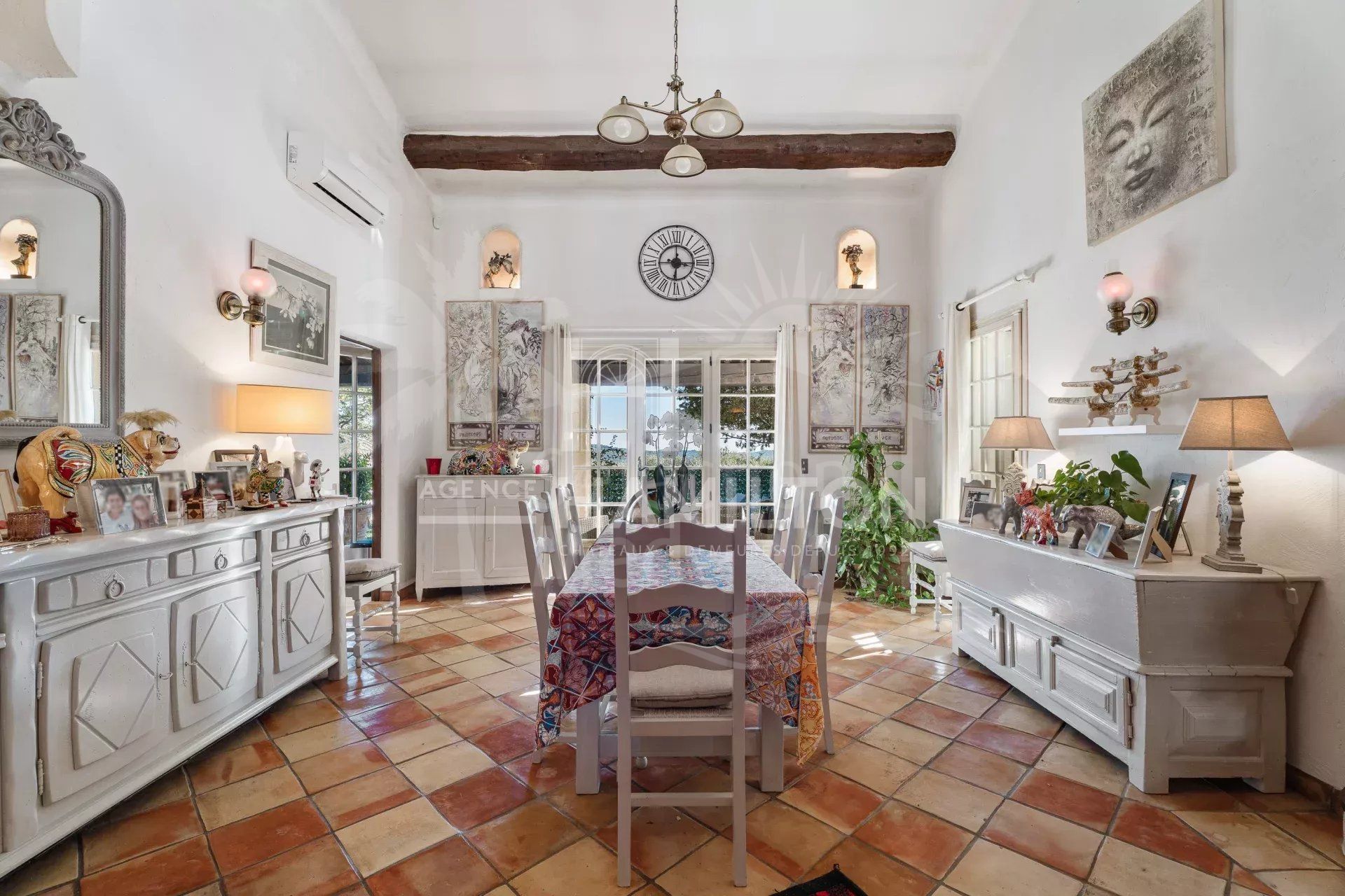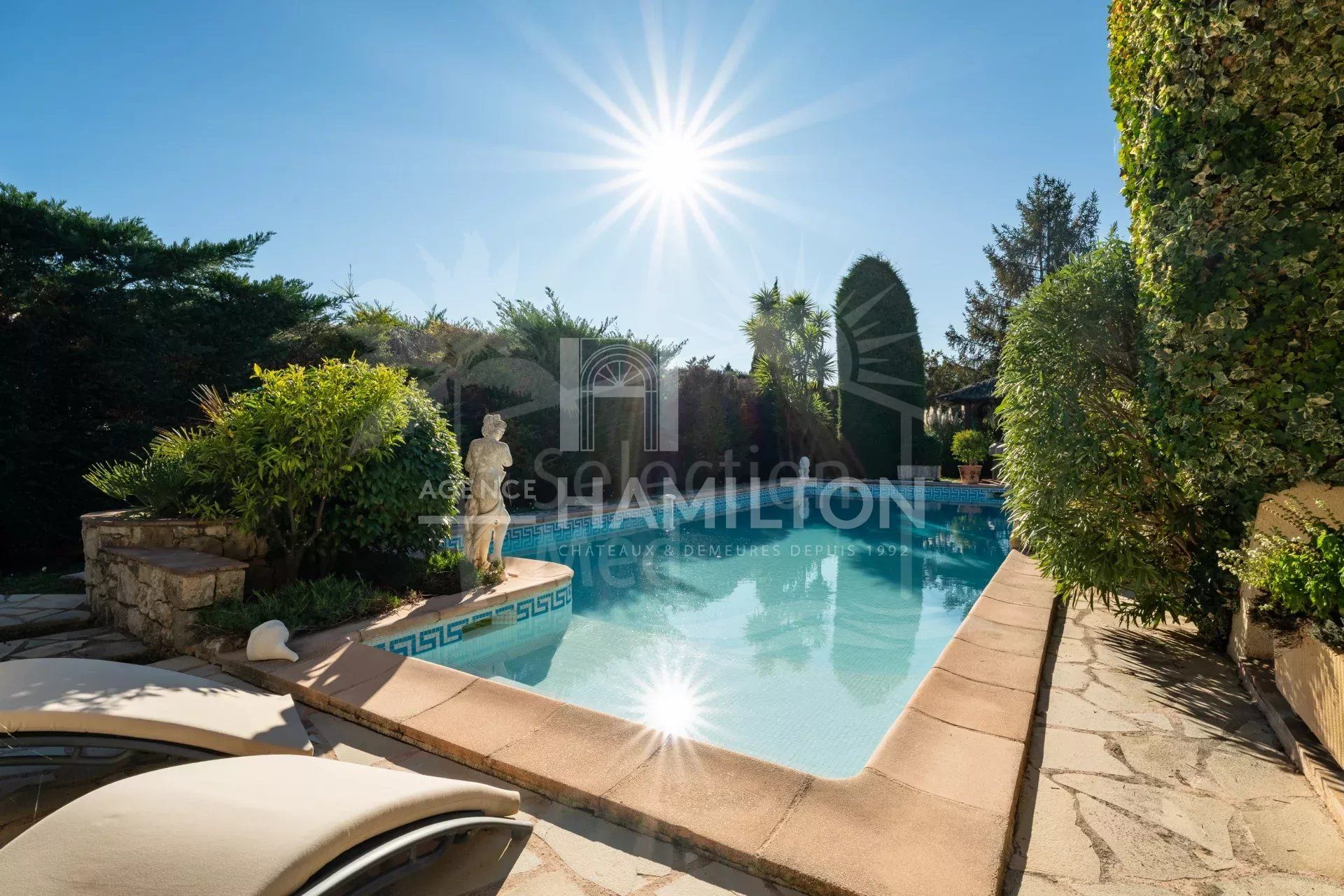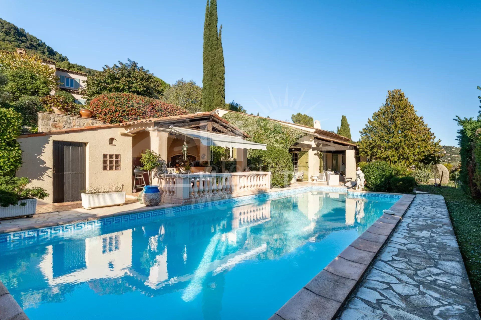 Outside, the flat 1,900 m² garden offers a peaceful atmosphere, ideal for enjoying the region’s mild climate. The garden includes a sunny swimming pool, a pool house, a jacuzzi for relaxing moments, and even a pétanque court for those who enjoy outdoor activities.