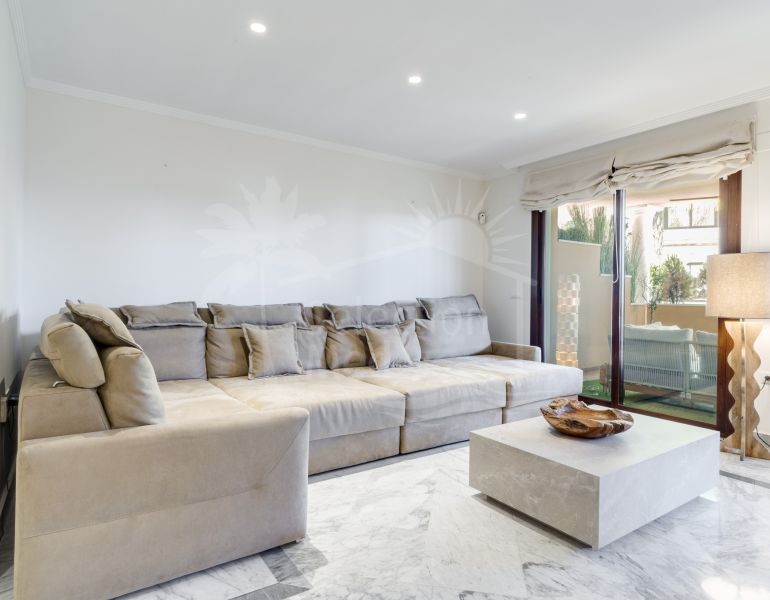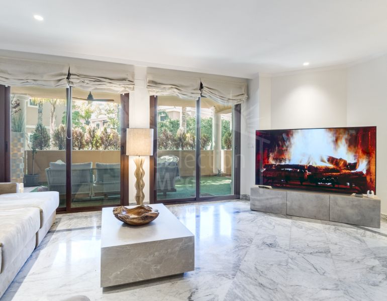 Excellent ground floor apartment with a 247 m² garden! Magnificent, fully renovated ground floor apartment in a superb location (the new Golden Mile) of Estepona. Just minutes from Estepona town center and San Pedro de Alcántara (Marbella). Located in a private community...