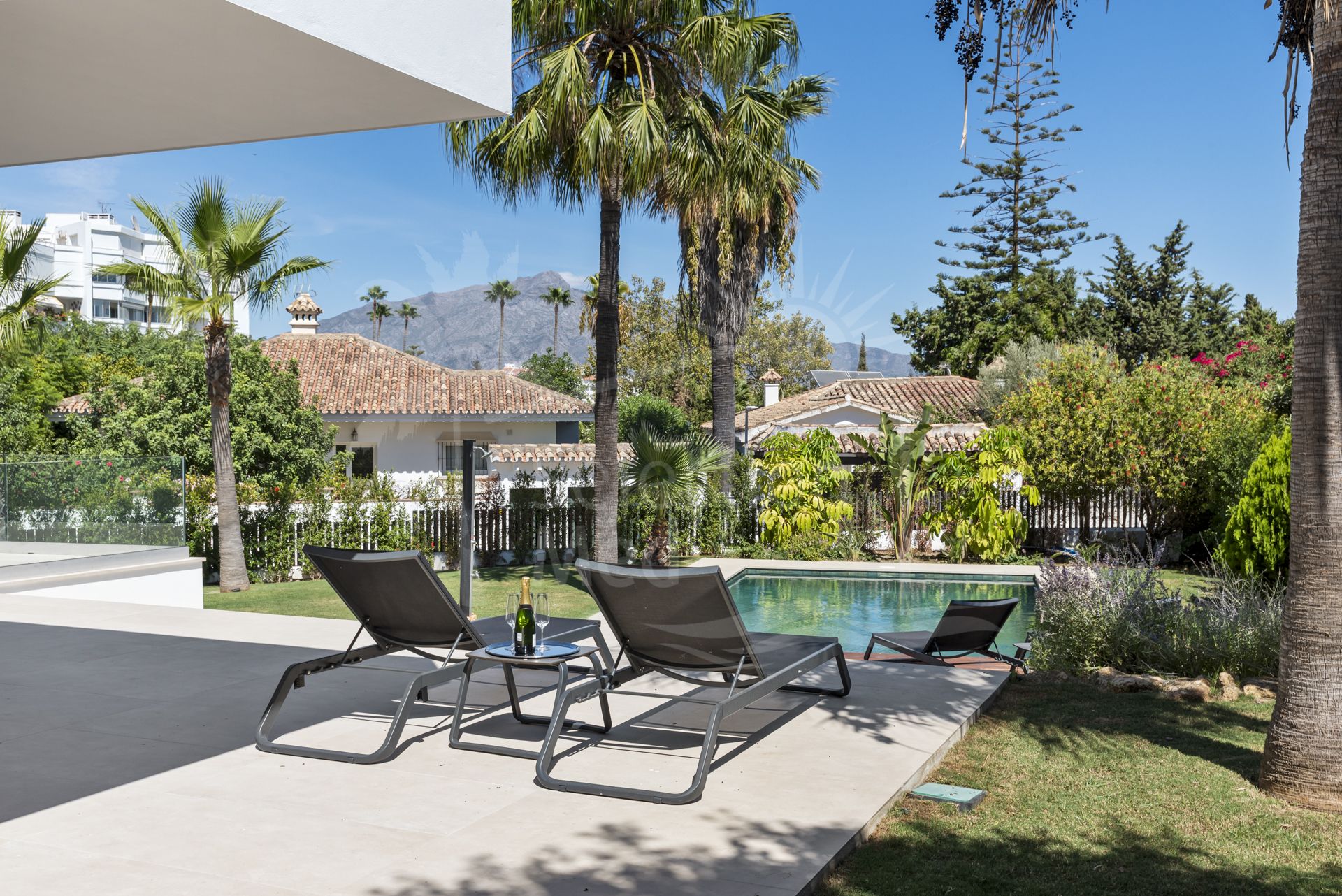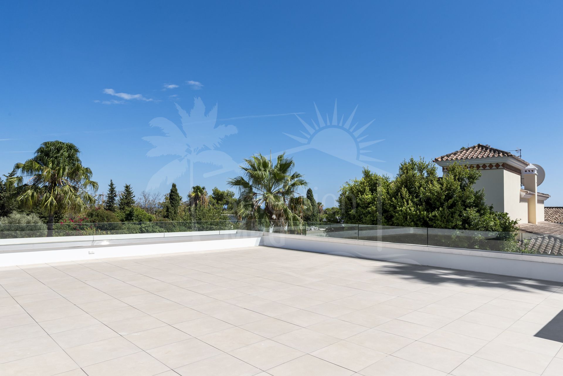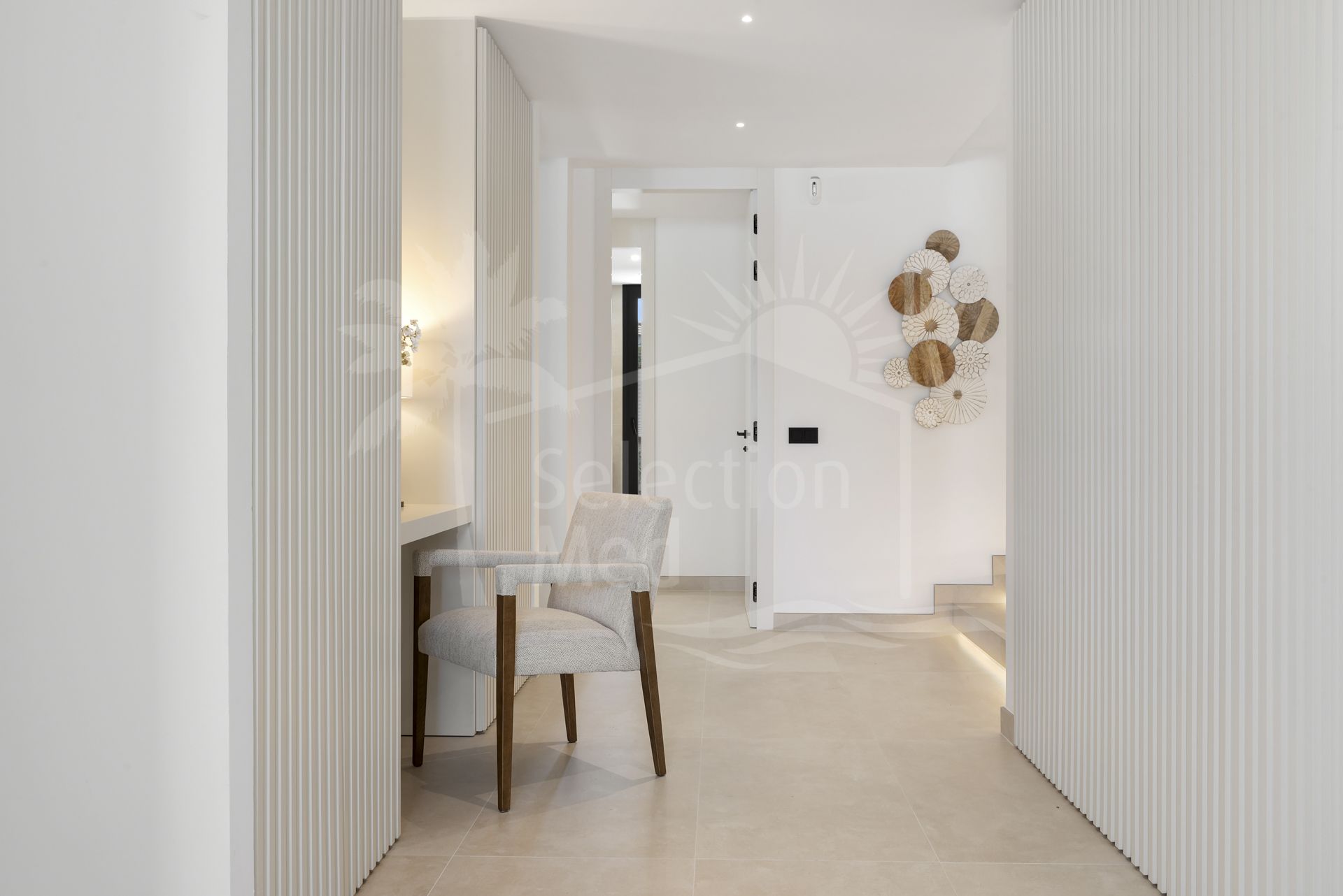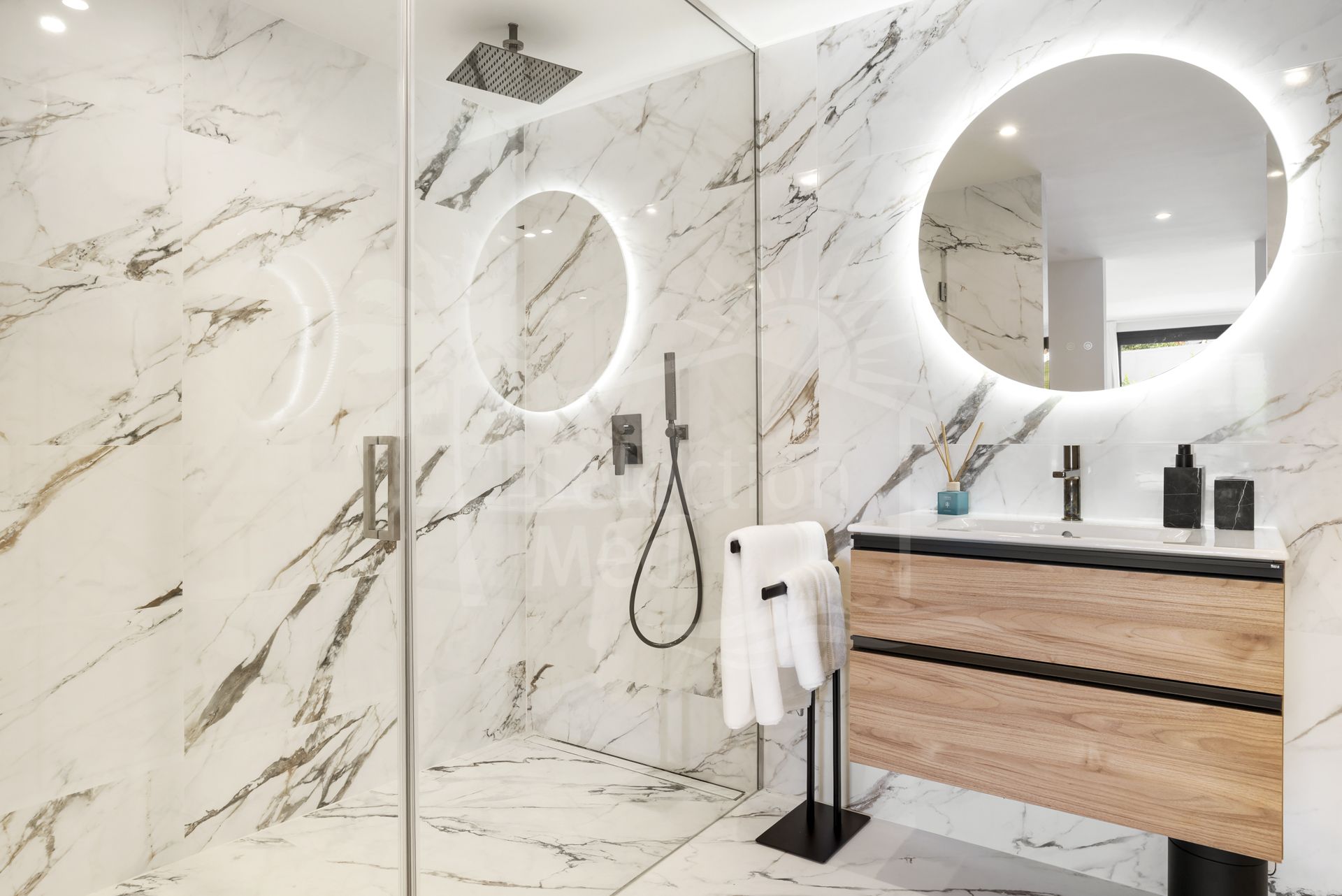 Ideally located just a short walk from the prestigious Guadalmina Golf Club and only minutes from the beach, this stunning villa is perfect as a family home, holiday retreat, or premium investment. It offers an exceptional blend of comfort, style, and convenience in one of the most sought-after areas of Marbella. The property features four spacious, sun-filled bedrooms and four modern bathrooms. The villa boasts a sleek open-plan kitchen with a central island and top-quality appliances, which connects seamlessly to an expansive living and dining area with direct access to the terrace. Outside, there is a beautifully landscaped garden with a private swimming pool, as well as a generous rooftop terrace offering impressive sea and mountain views. The villa is sold fully furnished and move-in ready, with built-in wardrobes illuminated by LED lighting. It also includes a large covered garage for one car, an electric vehicle charging point, and additional gated space that can accommodate up to three more cars. This is an exceptional property that combines prime location, modern design, and premium finishes.