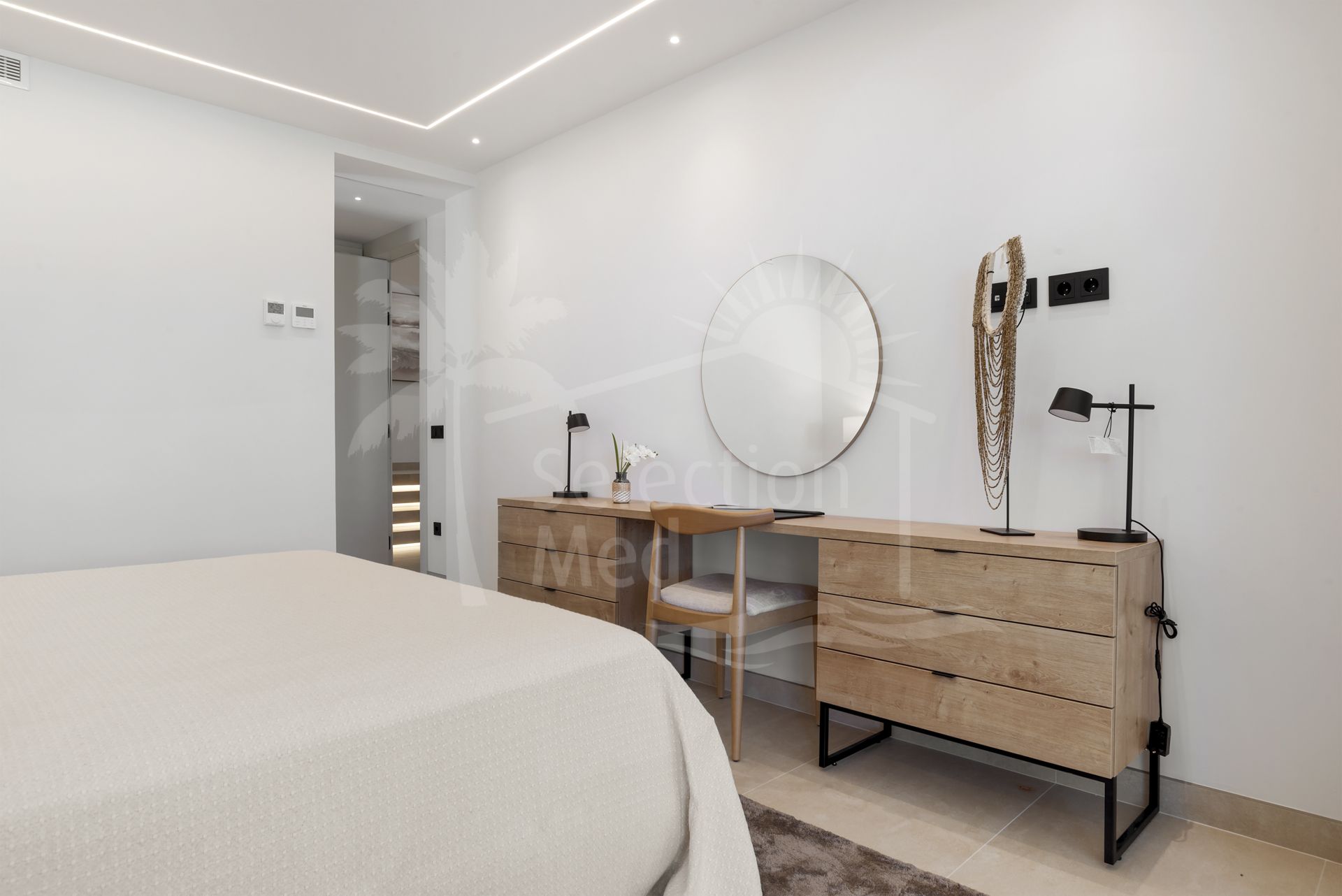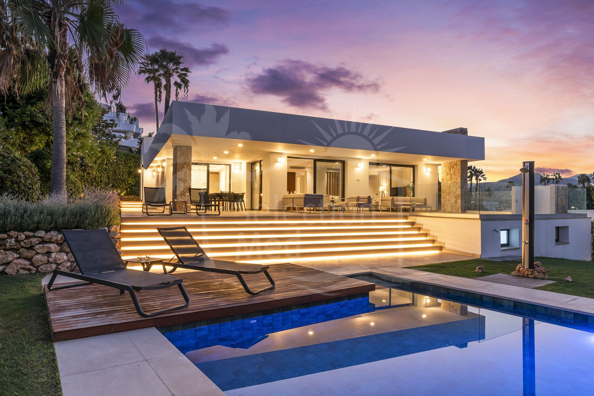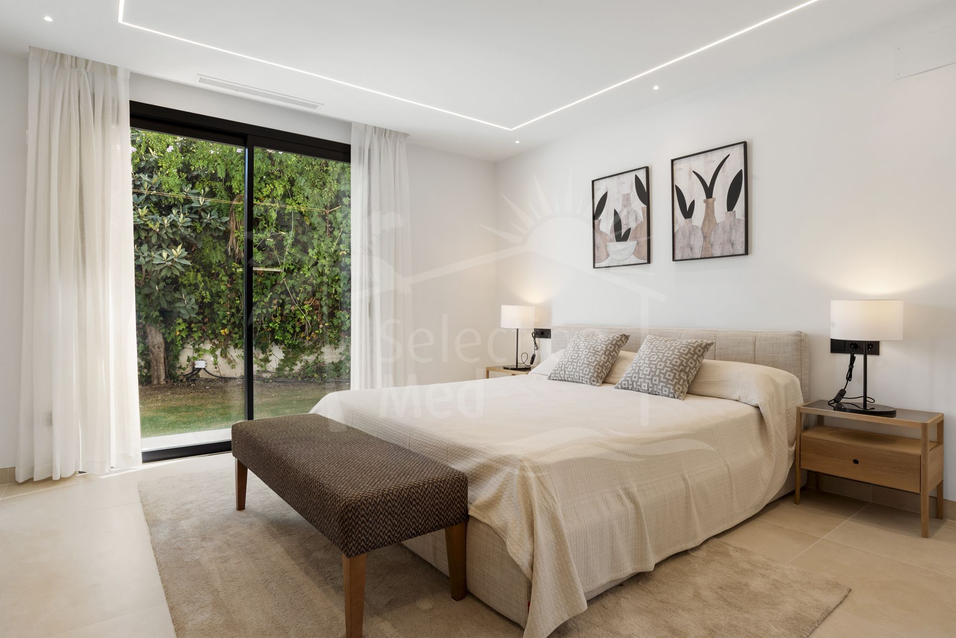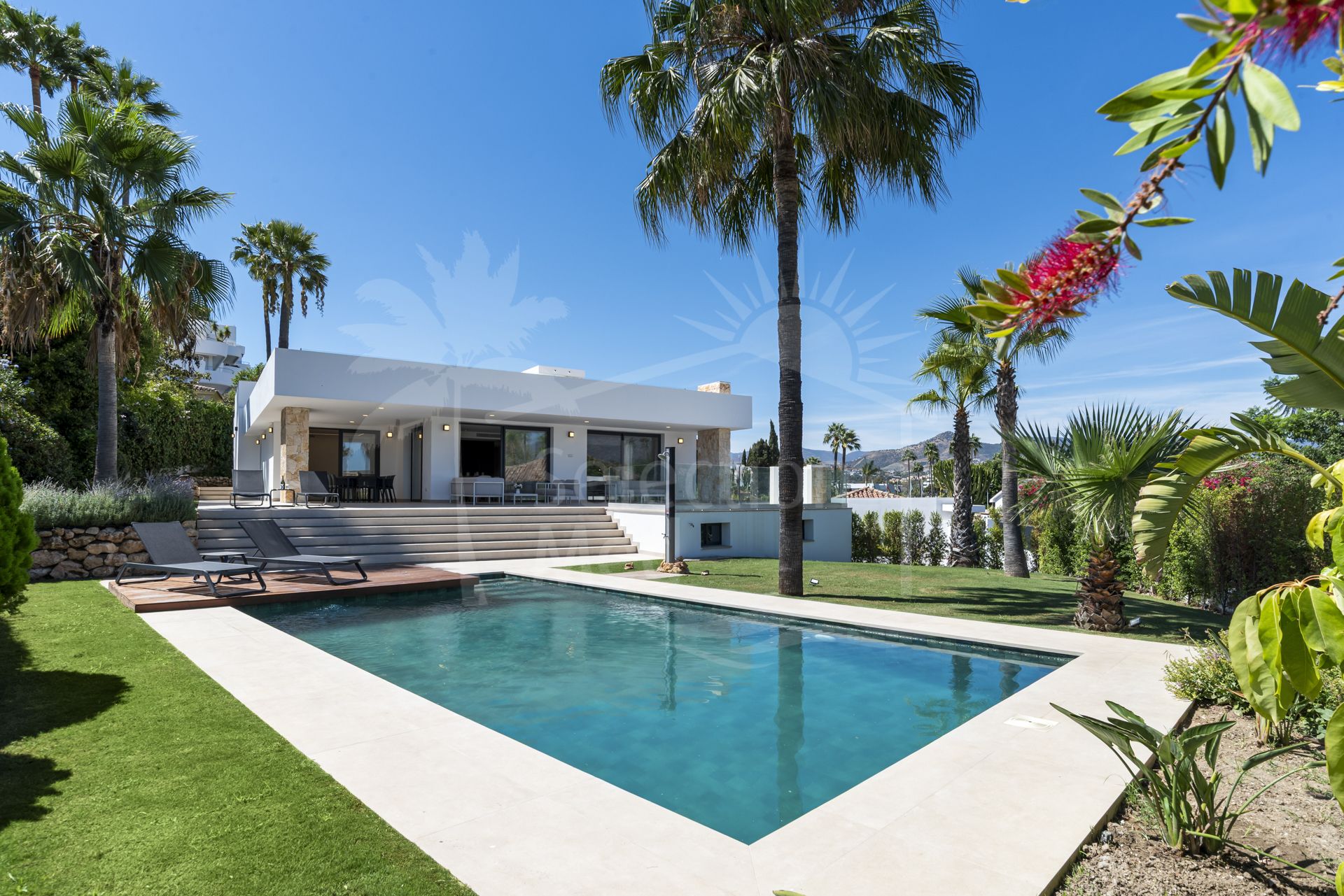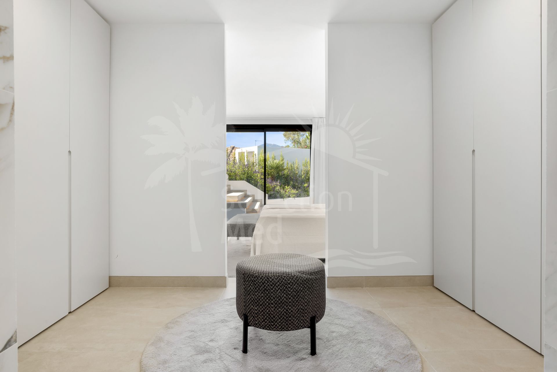 Ideally located just a short walk from the prestigious Guadalmina Golf Club and only minutes from the beach, this stunning villa is perfect as a family home, holiday retreat, or premium investment. It offers an exceptional blend of comfort, style, and convenience in one of the most sought-after areas of Marbella. The property features four spacious, sun-filled bedrooms and four modern bathrooms. The villa boasts a sleek open-plan kitchen with a central island and top-quality appliances, which connects seamlessly to an expansive living and dining area with direct access to the terrace. Outside, there is a beautifully landscaped garden with a private swimming pool, as well as a generous rooftop terrace offering impressive sea and mountain views. The villa is sold fully furnished and move-in ready, with built-in wardrobes illuminated by LED lighting. It also includes a large covered garage for one car, an electric vehicle charging point, and additional gated space that can accommodate up to three more cars. This is an exceptional property that combines prime location, modern design, and premium finishes.