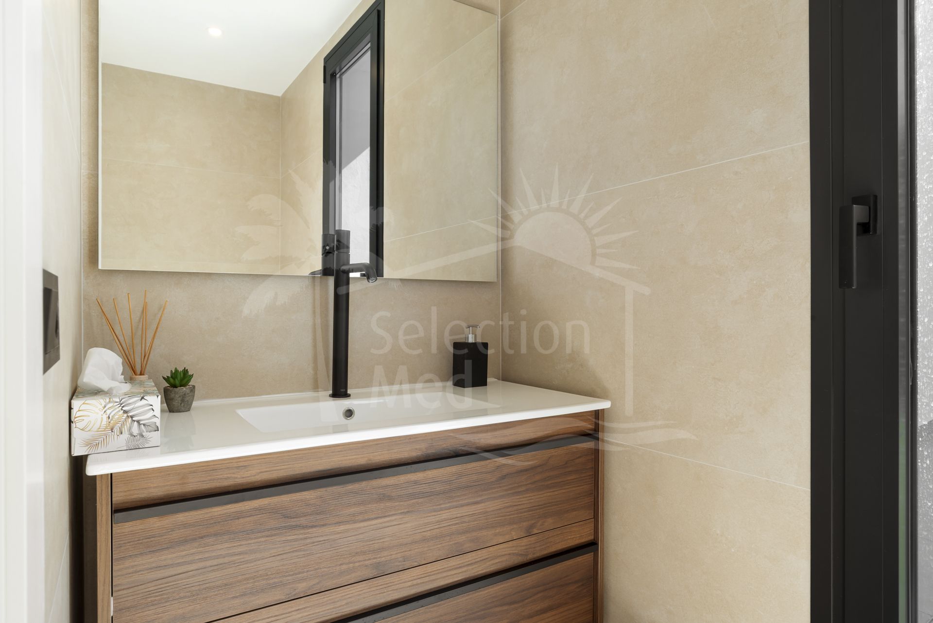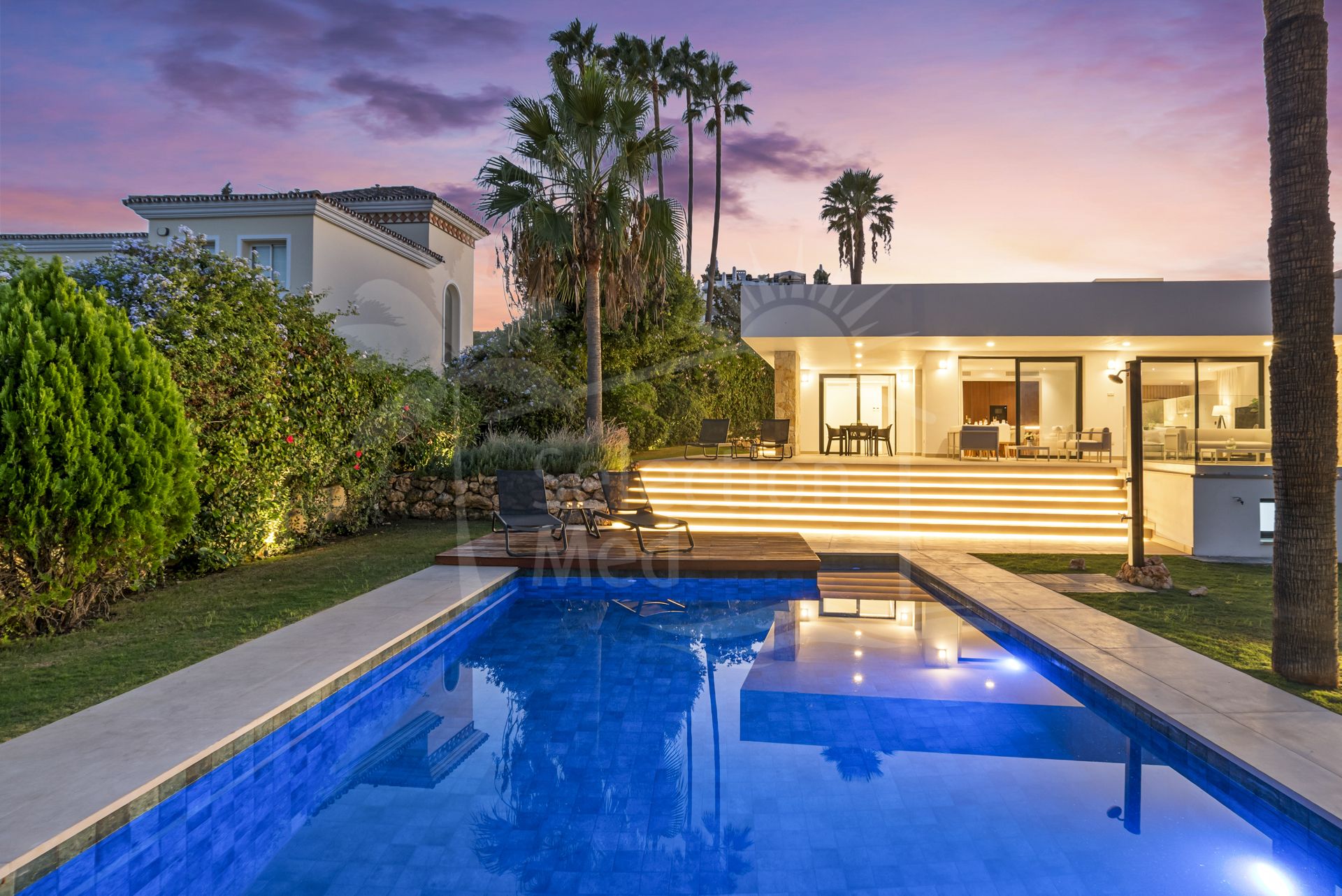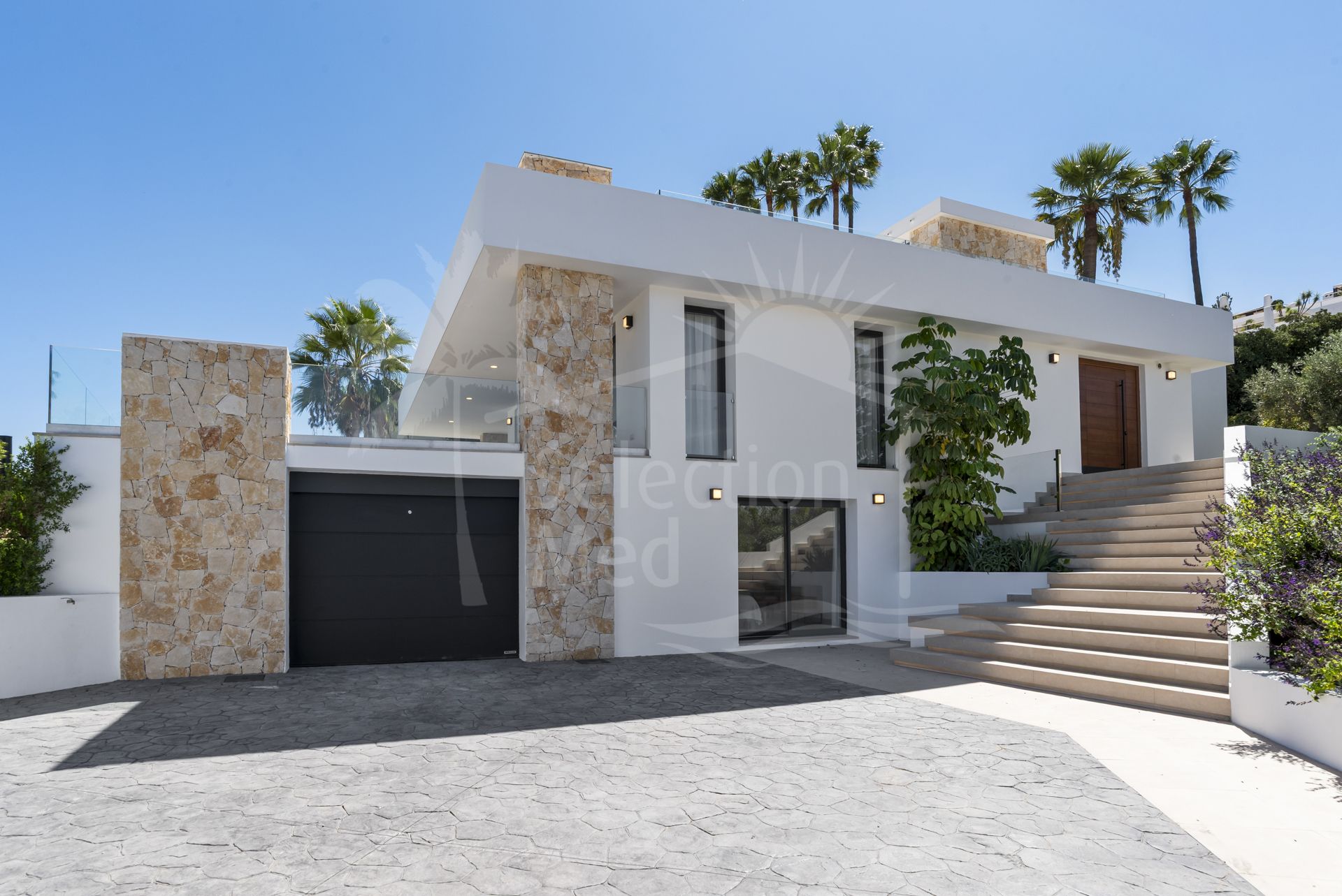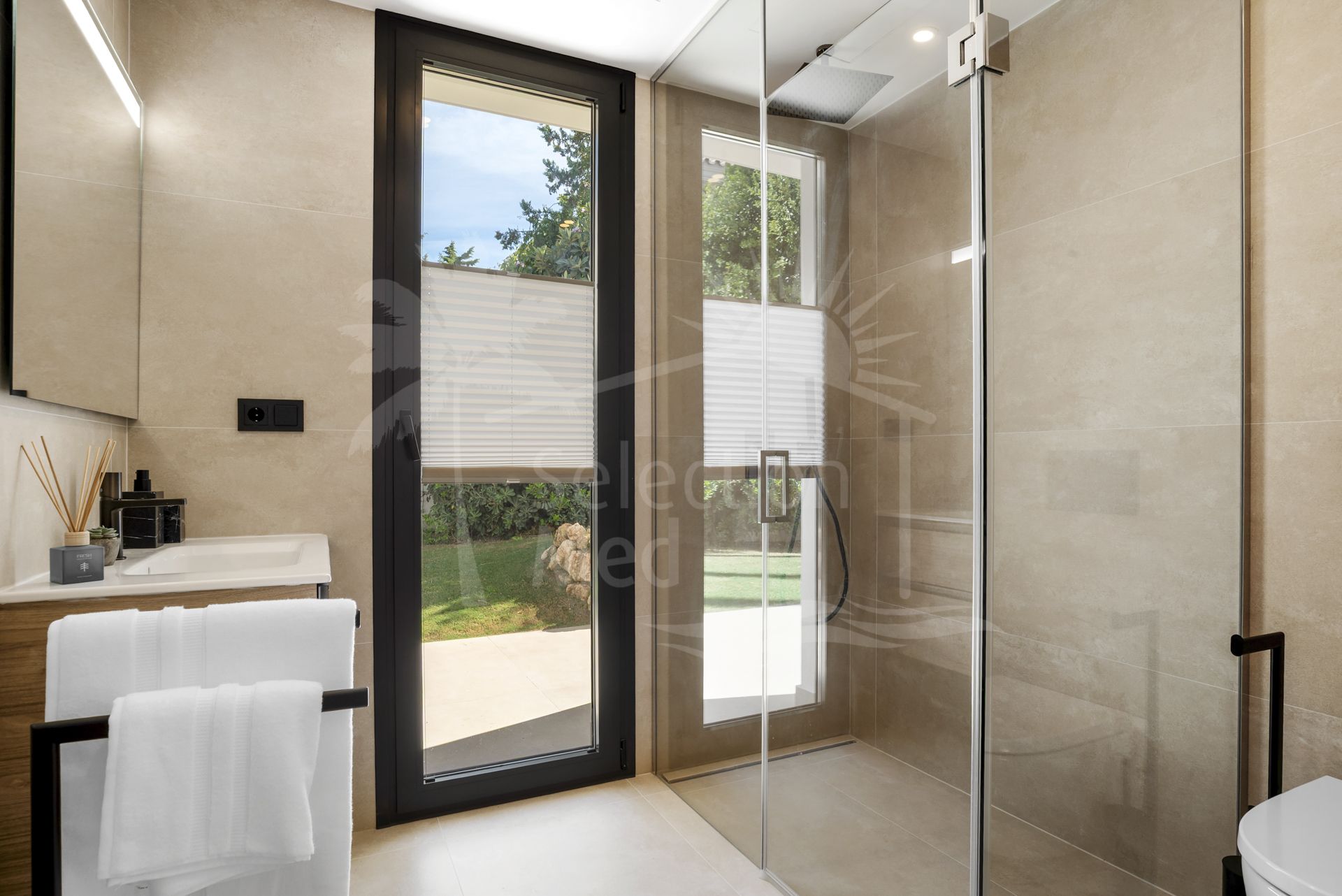 Ideally located just a short walk from the prestigious Guadalmina Golf Club and only minutes from the beach, this stunning villa is perfect as a family home, holiday retreat, or premium investment. It offers an exceptional blend of comfort, style, and convenience in one of the most sought-after areas of Marbella. The property features four spacious, sun-filled bedrooms and four modern bathrooms. The villa boasts a sleek open-plan kitchen with a central island and top-quality appliances, which connects seamlessly to an expansive living and dining area with direct access to the terrace. Outside, there is a beautifully landscaped garden with a private swimming pool, as well as a generous rooftop terrace offering impressive sea and mountain views. The villa is sold fully furnished and move-in ready, with built-in wardrobes illuminated by LED lighting. It also includes a large covered garage for one car, an electric vehicle charging point, and additional gated space that can accommodate up to three more cars. This is an exceptional property that combines prime location, modern design, and premium finishes.