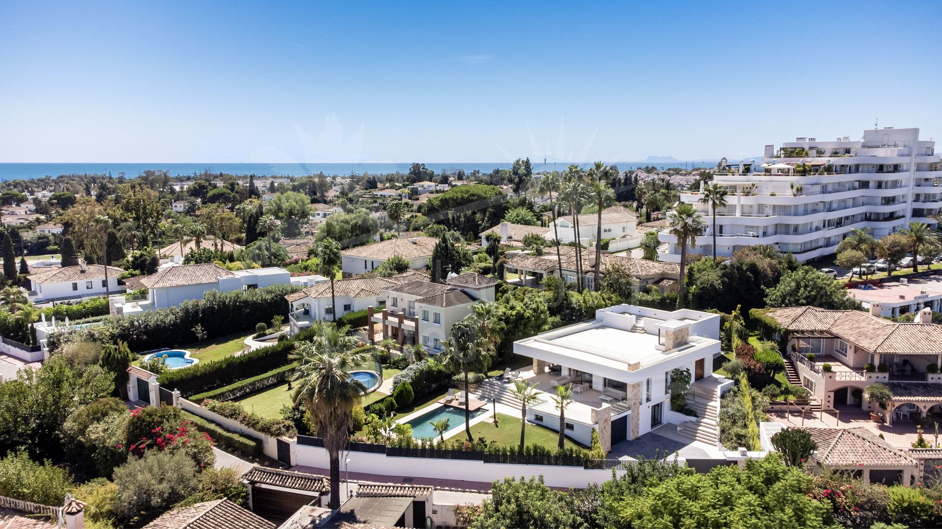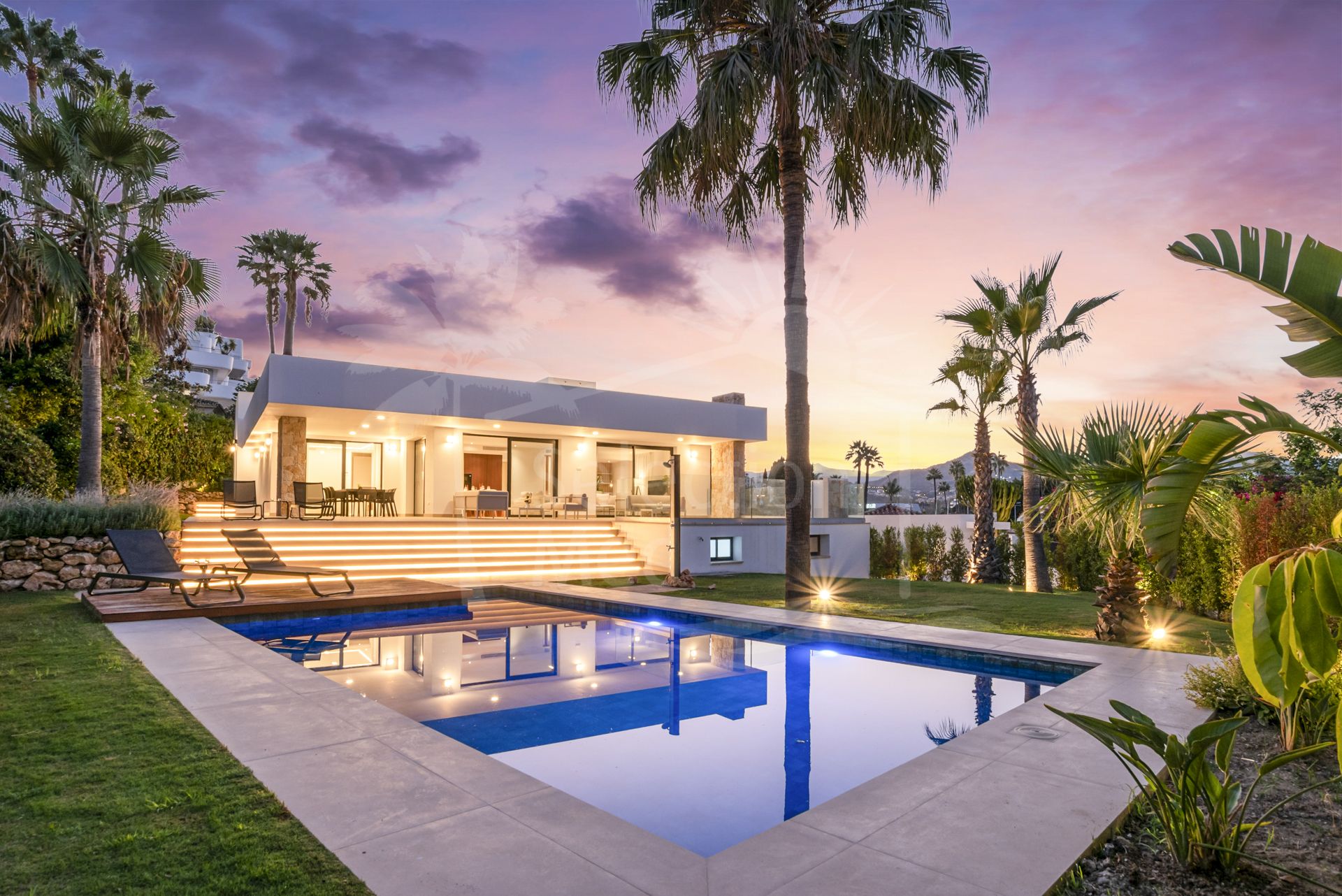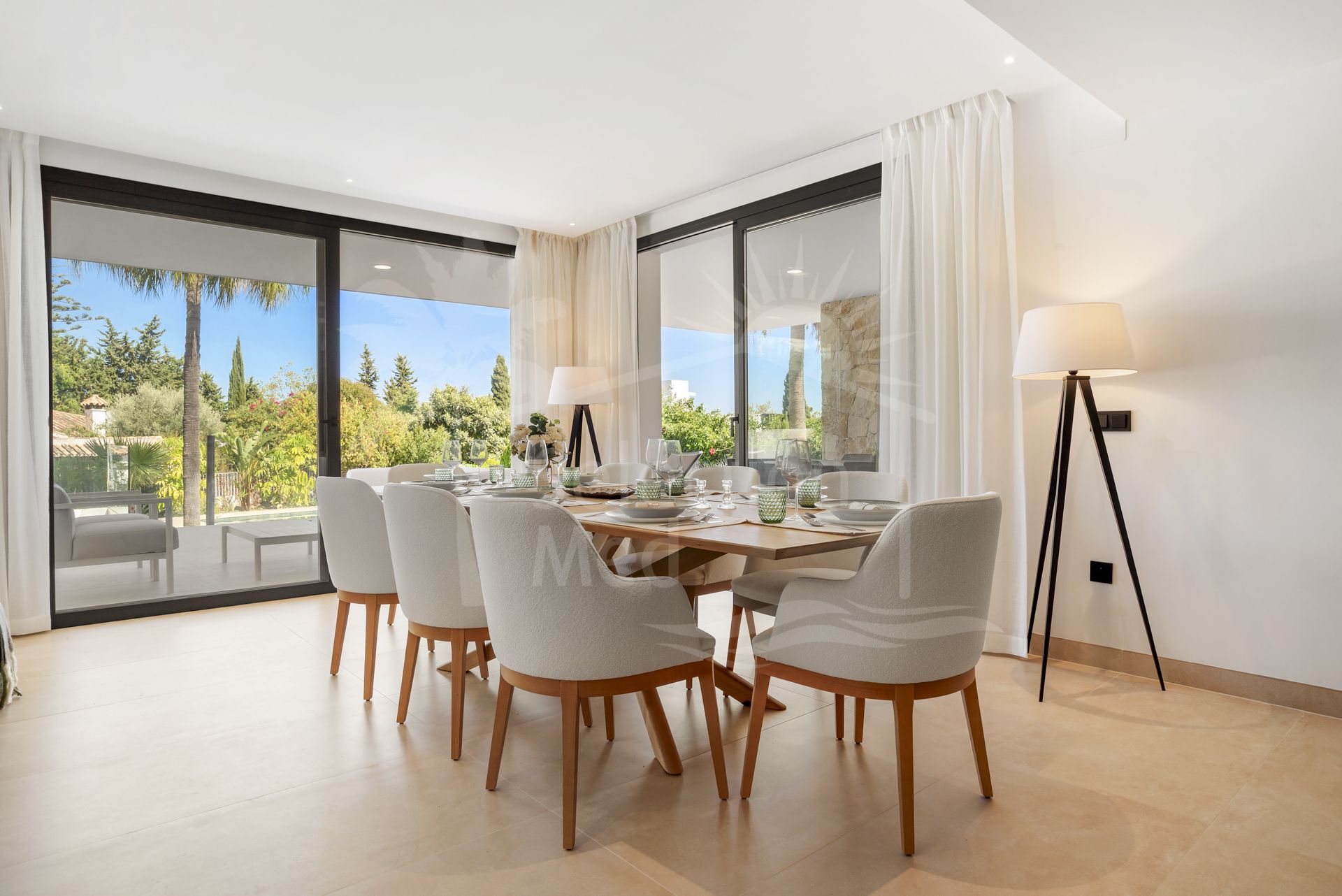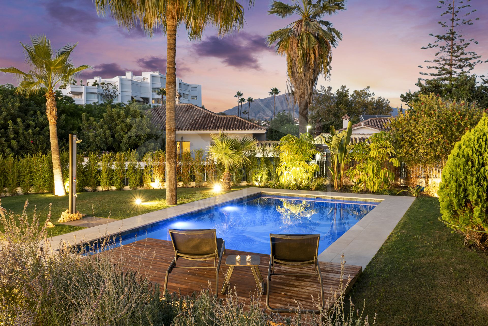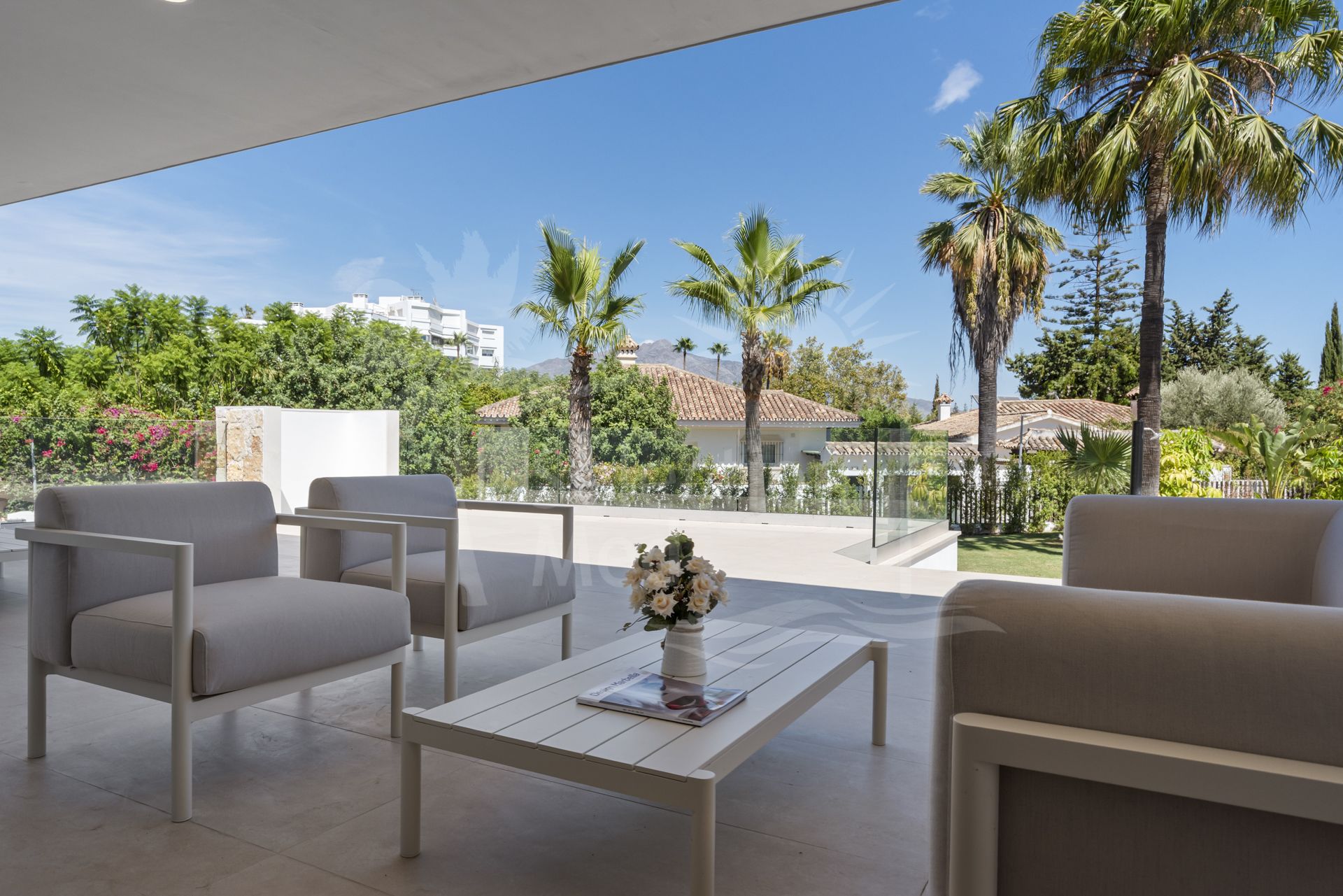 Ideally located just a short walk from the prestigious Guadalmina Golf Club and only minutes from the beach, this stunning villa is perfect as a family home, holiday retreat, or premium investment. It offers an exceptional blend of comfort, style, and convenience in one of the most sought-after areas of Marbella. The property features four spacious, sun-filled bedrooms and four modern bathrooms. The villa boasts a sleek open-plan kitchen with a central island and top-quality appliances, which connects seamlessly to an expansive living and dining area with direct access to the terrace. Outside, there is a beautifully landscaped garden with a private swimming pool, as well as a generous rooftop terrace offering impressive sea and mountain views. The villa is sold fully furnished and move-in ready, with built-in wardrobes illuminated by LED lighting. It also includes a large covered garage for one car, an electric vehicle charging point, and additional gated space that can accommodate up to three more cars. This is an exceptional property that combines prime location, modern design, and premium finishes.