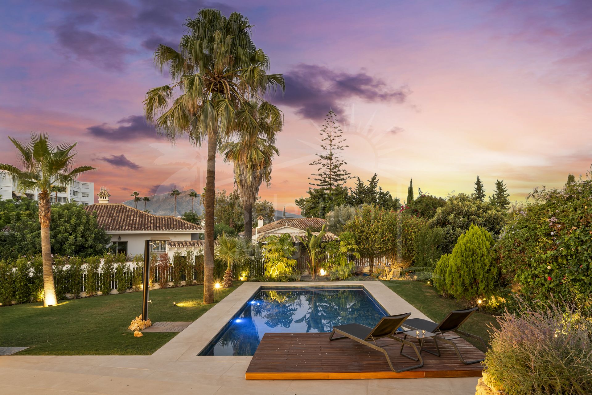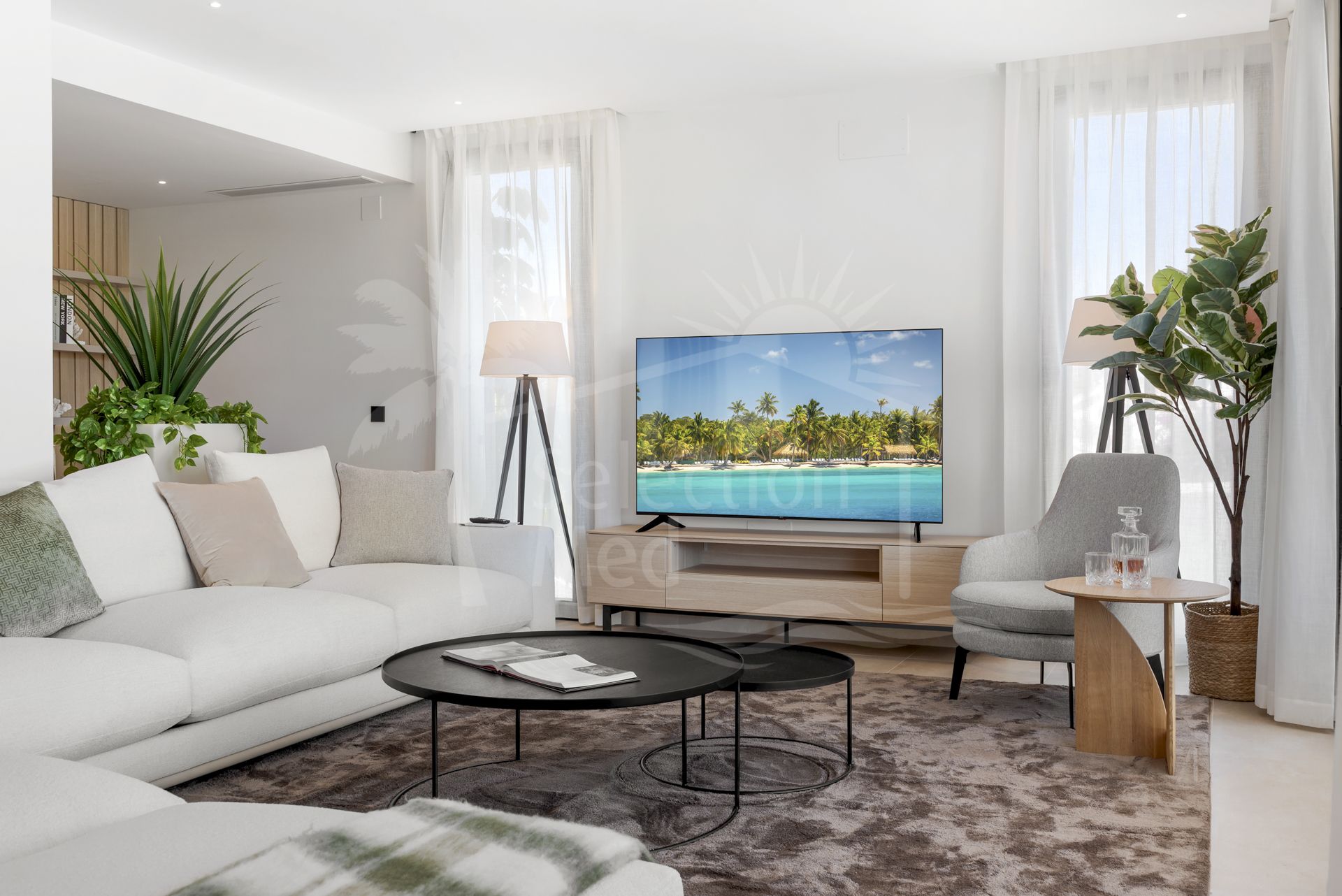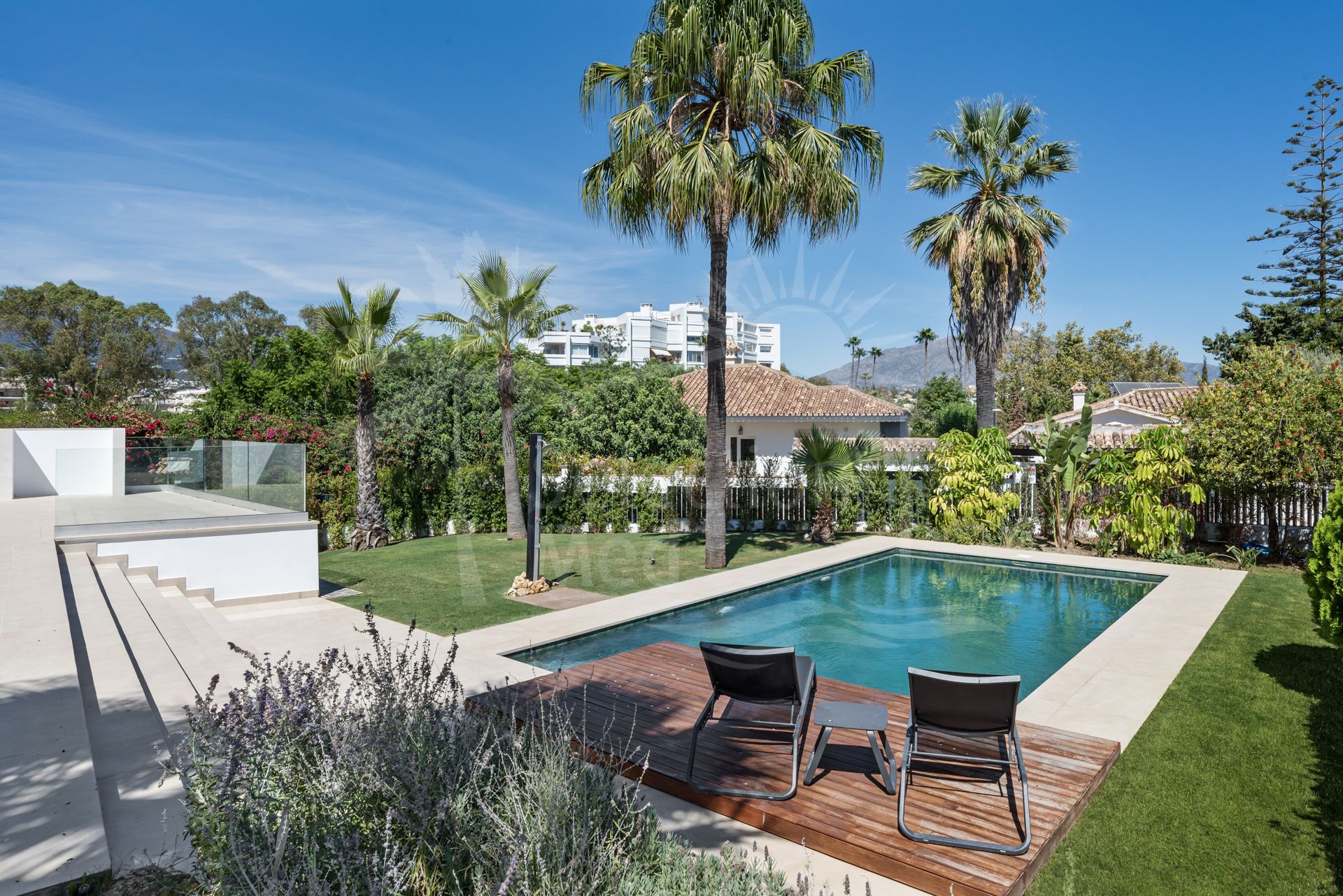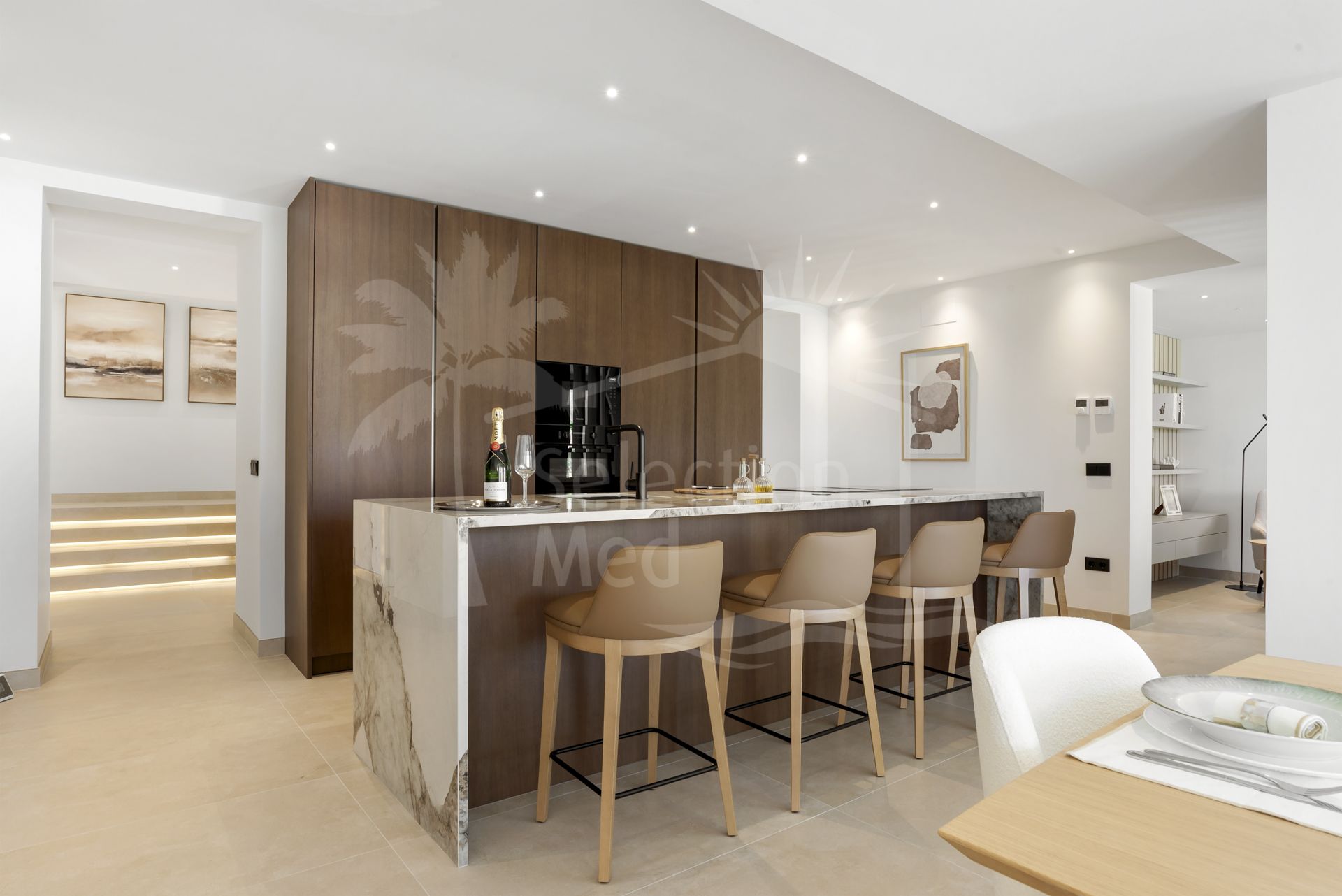 Ideally located just a short walk from the prestigious Guadalmina Golf Club and only minutes from the beach, this stunning villa is perfect as a family home, holiday retreat, or premium investment. It offers an exceptional blend of comfort, style, and convenience in one of the most sought-after areas of Marbella. The property features four spacious, sun-filled bedrooms and four modern bathrooms. The villa boasts a sleek open-plan kitchen with a central island and top-quality appliances, which connects seamlessly to an expansive living and dining area with direct access to the terrace. Outside, there is a beautifully landscaped garden with a private swimming pool, as well as a generous rooftop terrace offering impressive sea and mountain views. The villa is sold fully furnished and move-in ready, with built-in wardrobes illuminated by LED lighting. It also includes a large covered garage for one car, an electric vehicle charging point, and additional gated space that can accommodate up to three more cars. This is an exceptional property that combines prime location, modern design, and premium finishes.