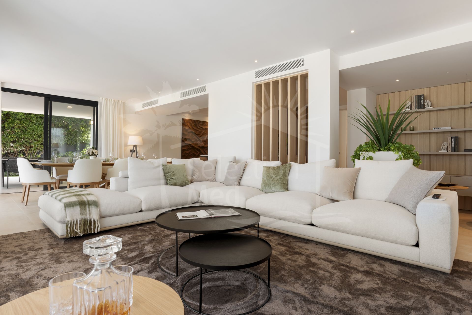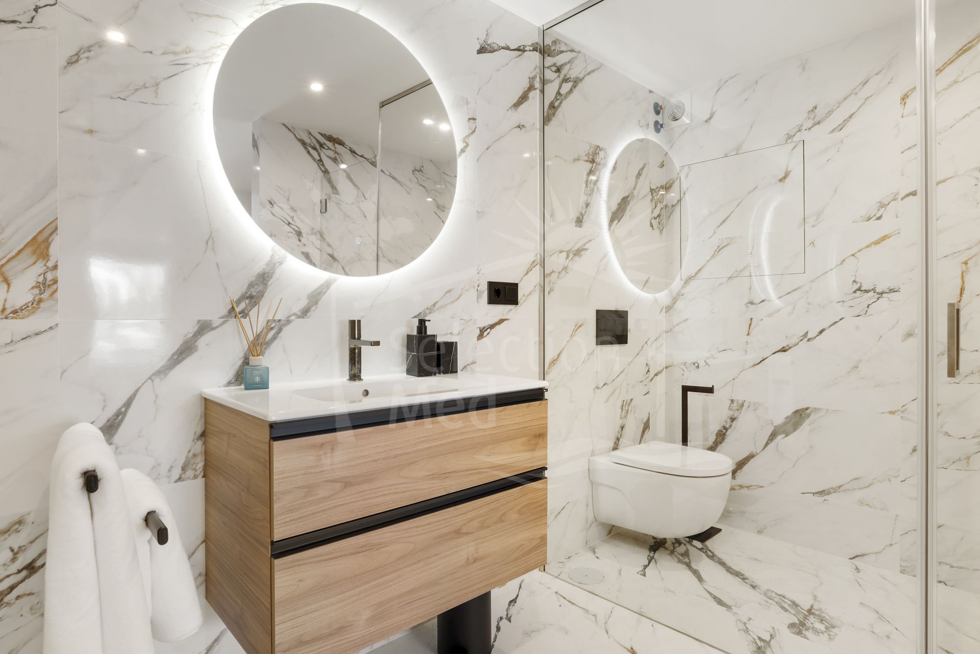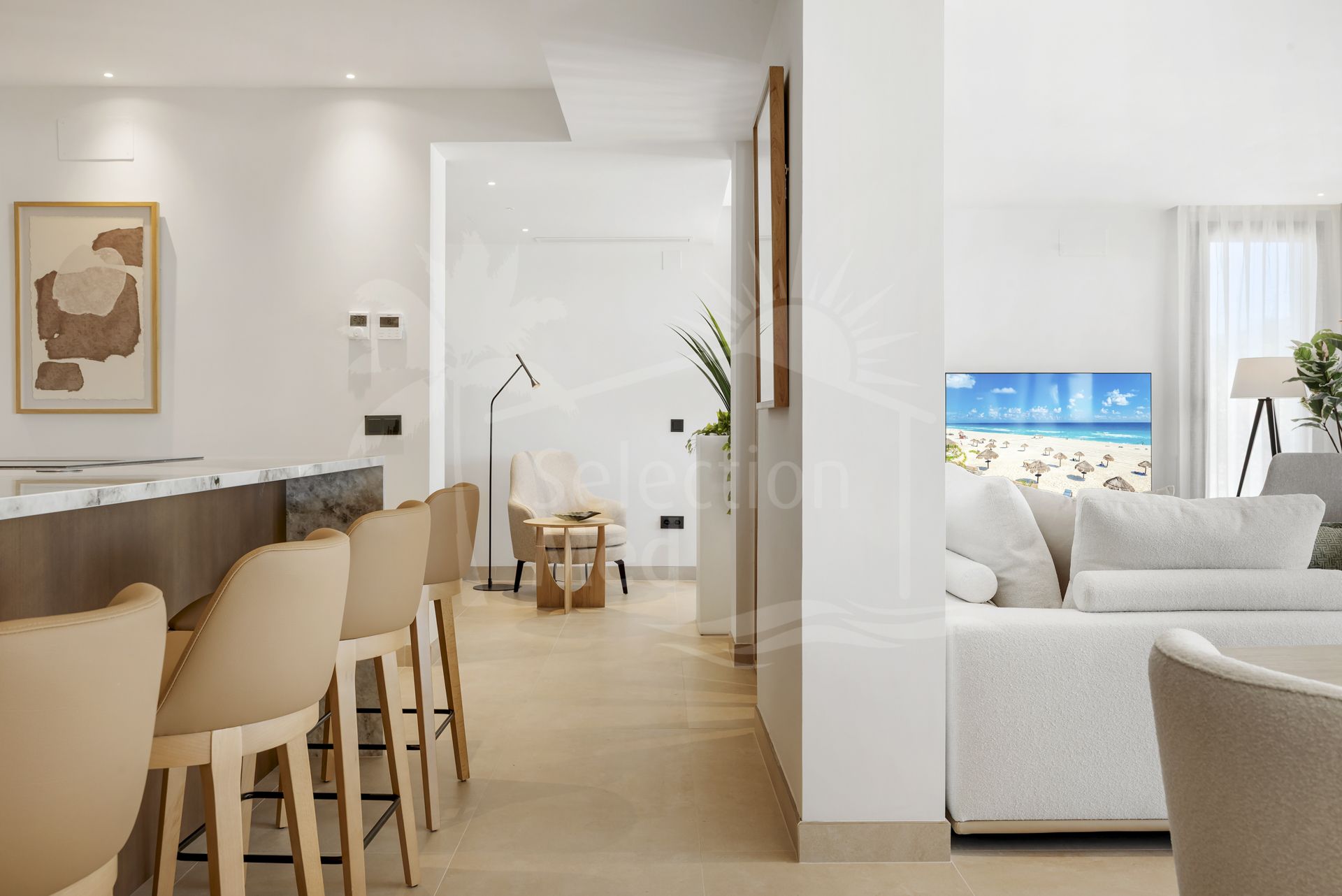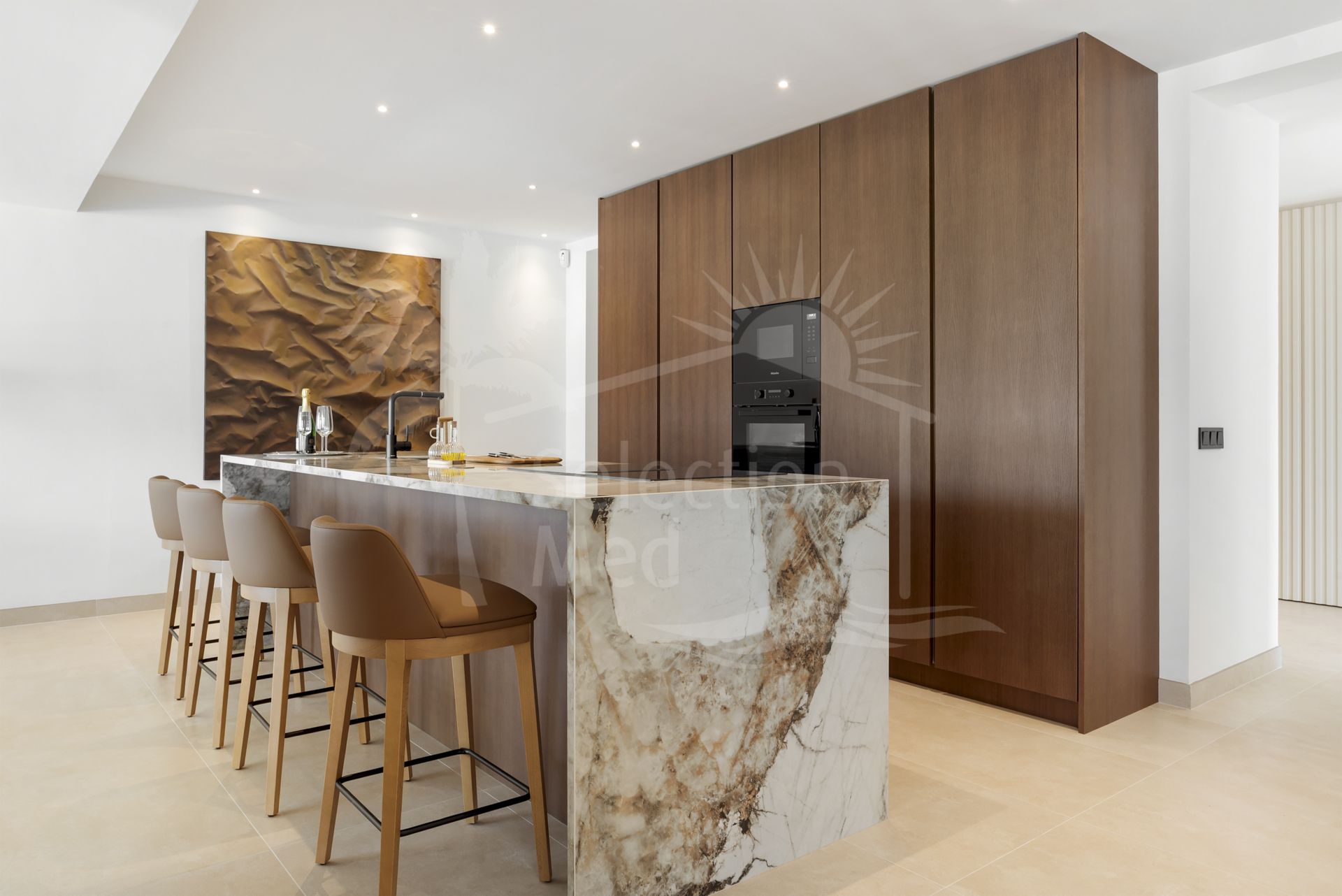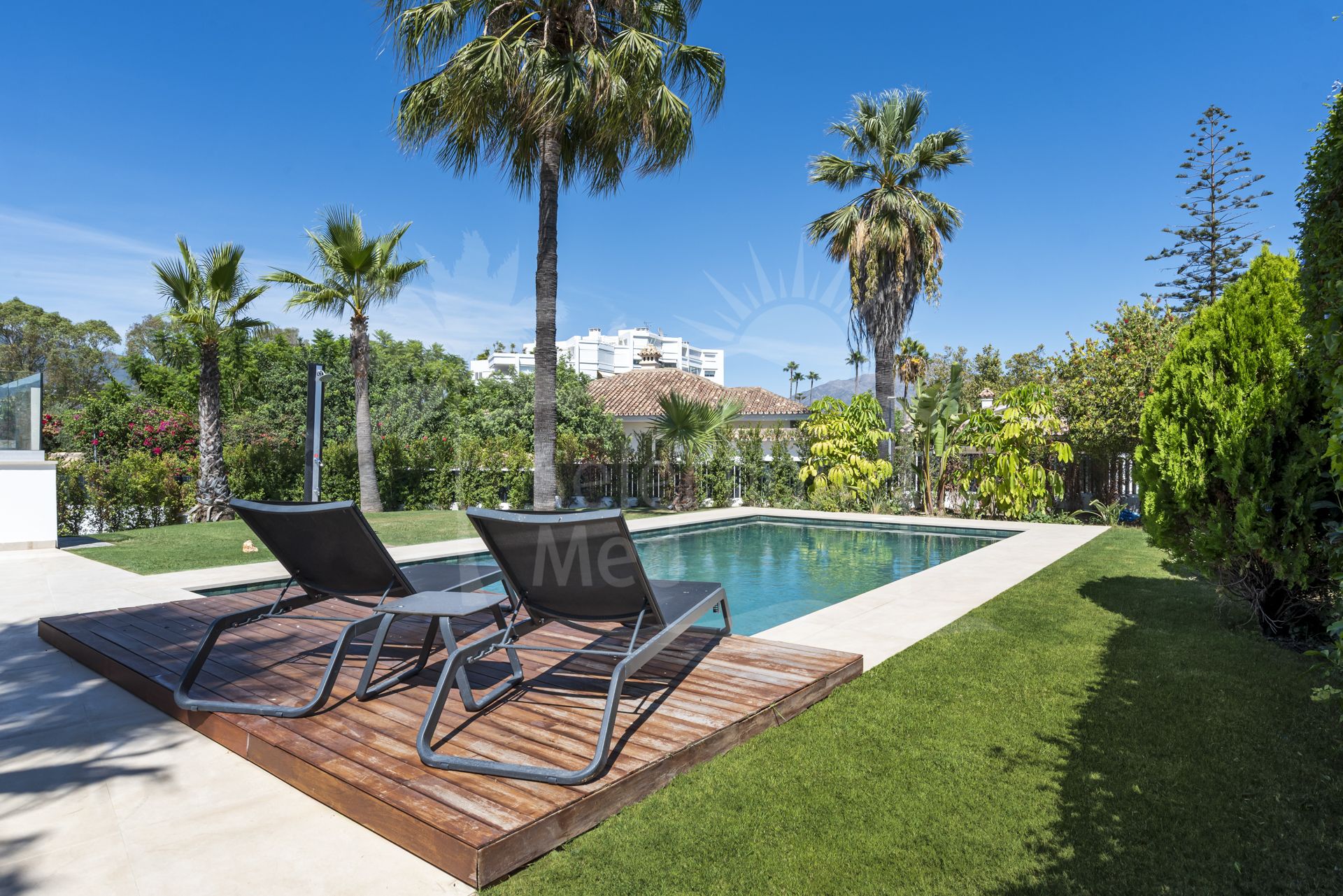 Ideally located just a short walk from the prestigious Guadalmina Golf Club and only minutes from the beach, this stunning villa is perfect as a family home, holiday retreat, or premium investment. It offers an exceptional blend of comfort, style, and convenience in one of the most sought-after areas of Marbella. The property features four spacious, sun-filled bedrooms and four modern bathrooms. The villa boasts a sleek open-plan kitchen with a central island and top-quality appliances, which connects seamlessly to an expansive living and dining area with direct access to the terrace. Outside, there is a beautifully landscaped garden with a private swimming pool, as well as a generous rooftop terrace offering impressive sea and mountain views. The villa is sold fully furnished and move-in ready, with built-in wardrobes illuminated by LED lighting. It also includes a large covered garage for one car, an electric vehicle charging point, and additional gated space that can accommodate up to three more cars. This is an exceptional property that combines prime location, modern design, and premium finishes.