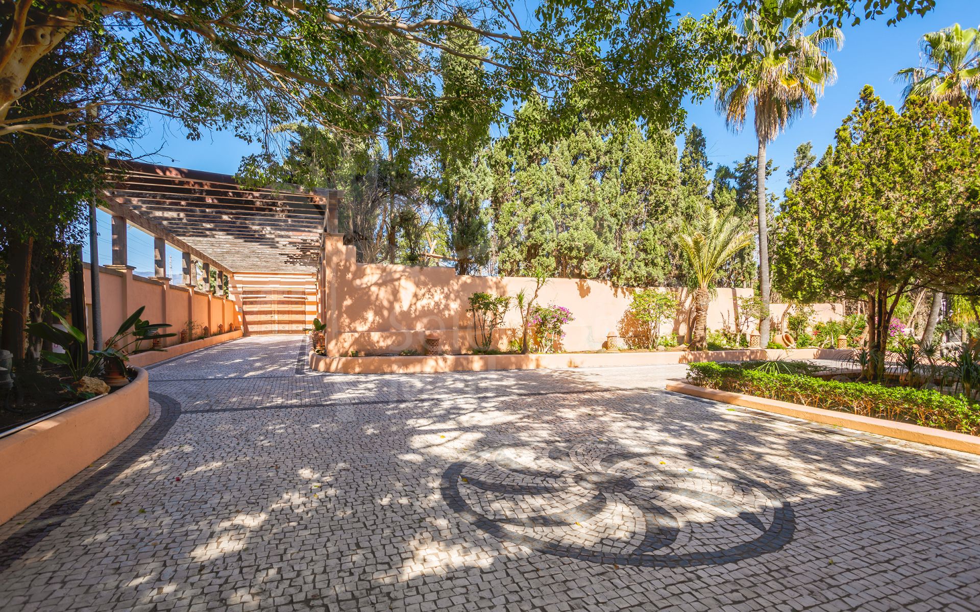 The outdoor oasis is crowned by a shimmering swimming pool, inviting residents to indulge in leisurely swims or bask in the warm Mediterranean sun. A sprawling driveway leads to a two-car garage, ensuring ample parking space for residents and guests.