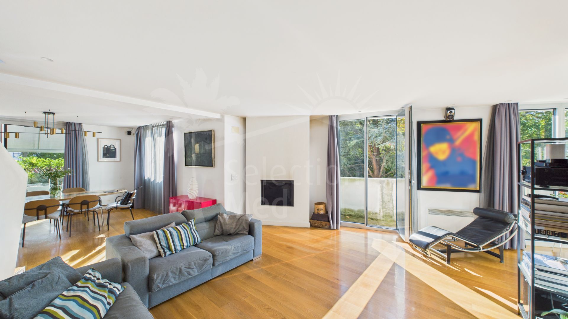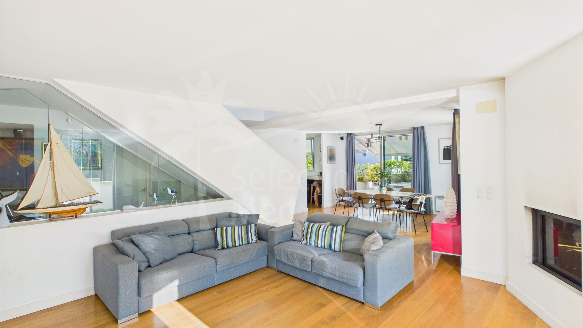 A spacious open-plan living and dining area opening onto a 60 m² terrace with stunning views over the bay
