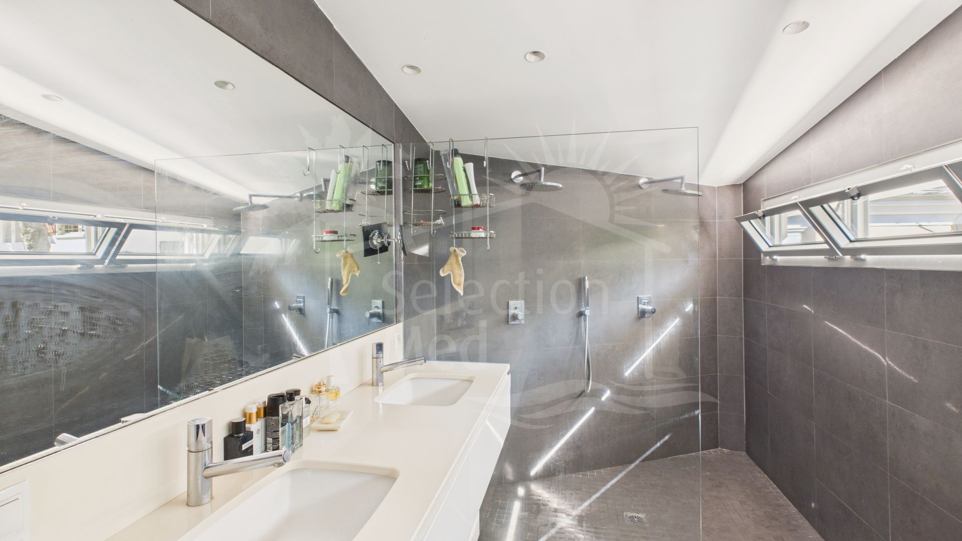 Five bedrooms, including an elegant master suite with walk-in dressing room and a luxurious bathroom featuring double shower and double vanity