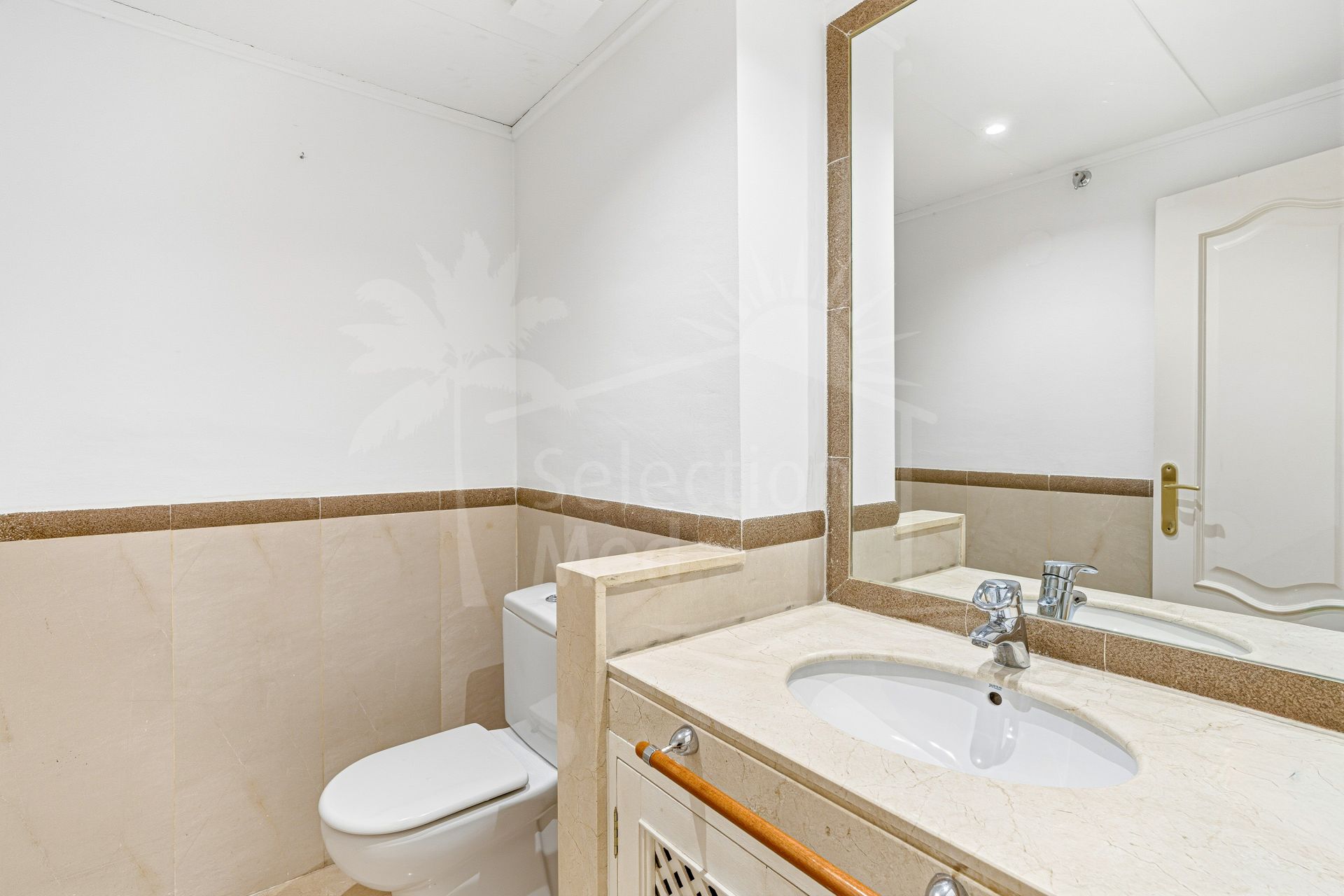 Situated on Marbella’s Golden Mile, this elegant two-bedroom beachfront apartment is located in the prestigious Jardin del Mediterráneo community, just a two-minute walk from the beach with all amenities within easy walking distance. The property features a bright and welcoming entrance that opens into a spacious living and dining area with direct access to a private terrace, ideal for outdoor dining. The apartment offers a fully equipped kitchen with a separate utility room, a generous master bedroom with en-suite bathroom, a guest bedroom, an additional bathroom, and a guest toilet. Further features include air conditioning, electric blinds, one parking space, a storage room, and access to beautiful communal gardens, a large communal swimming pool, and an additional smaller pool.