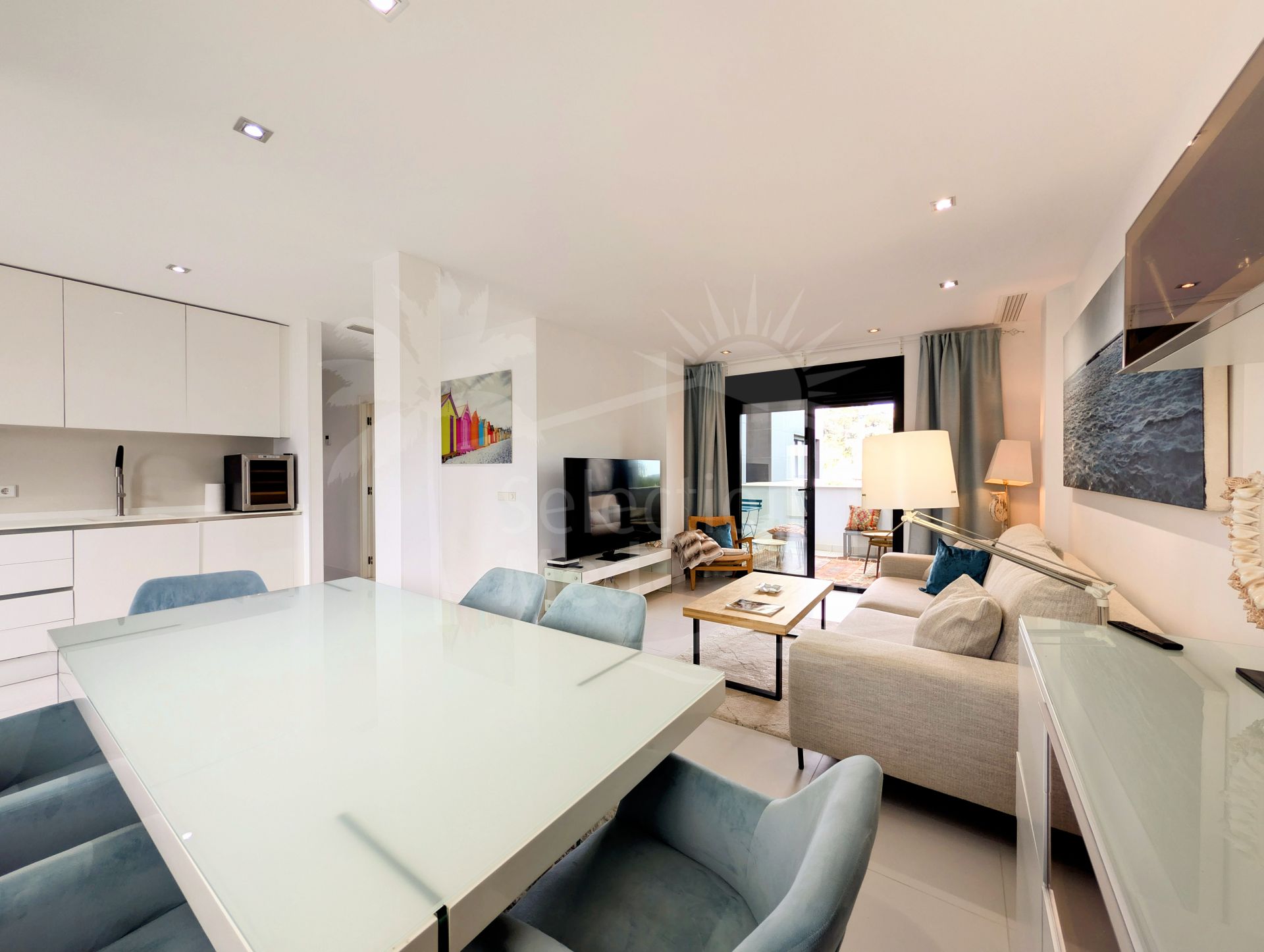 The fully fitted contemporary kitchen is equipped with high-quality appliances and designed to balance functionality with modern style. Comfort is ensured year-round thanks to features such as air conditioning, double glazing, mains electricity, high-speed internet, and enhanced security systems.
