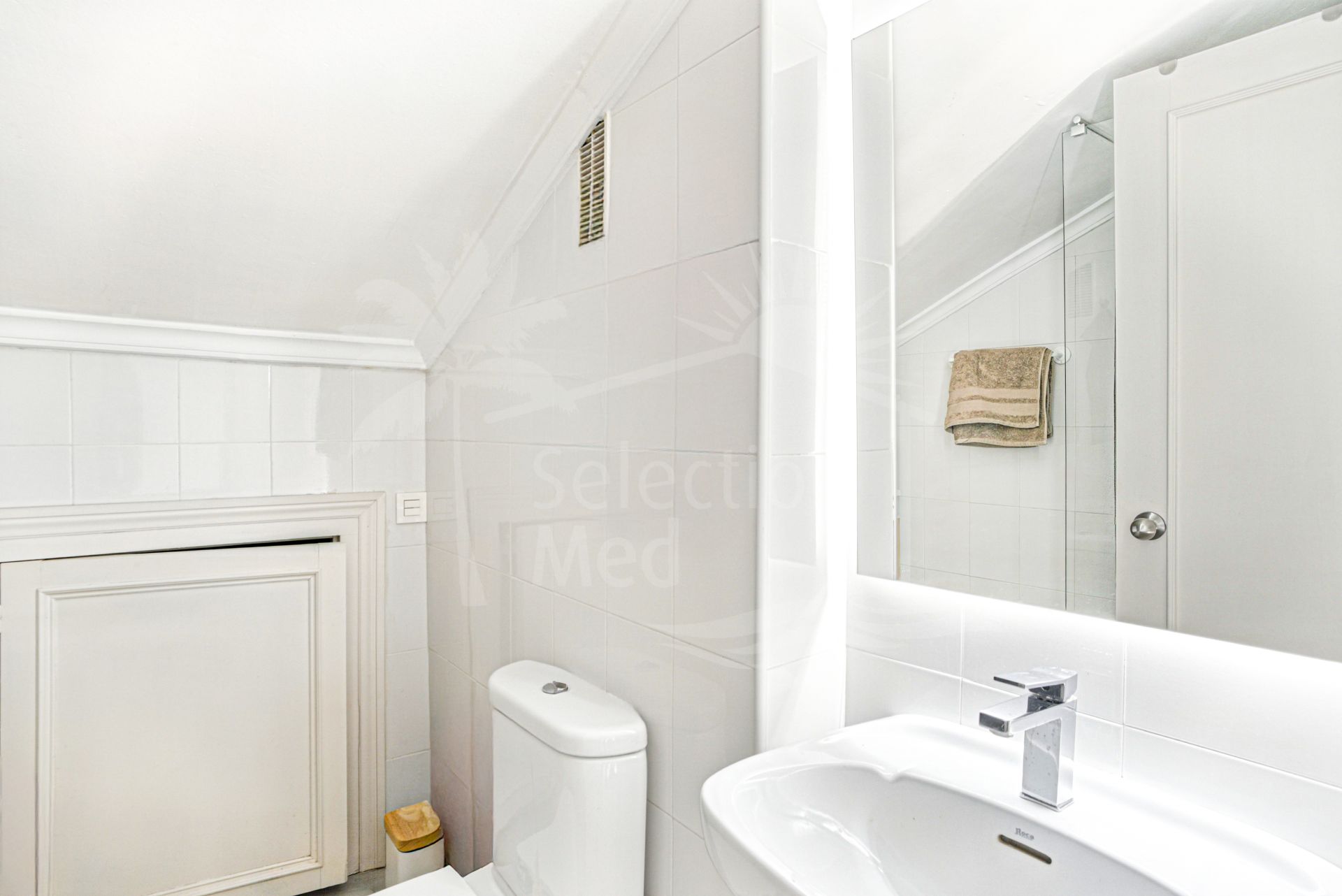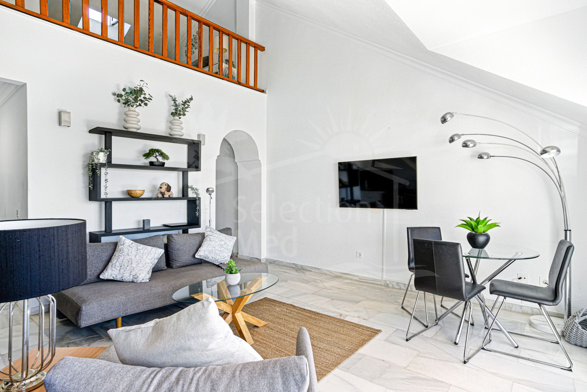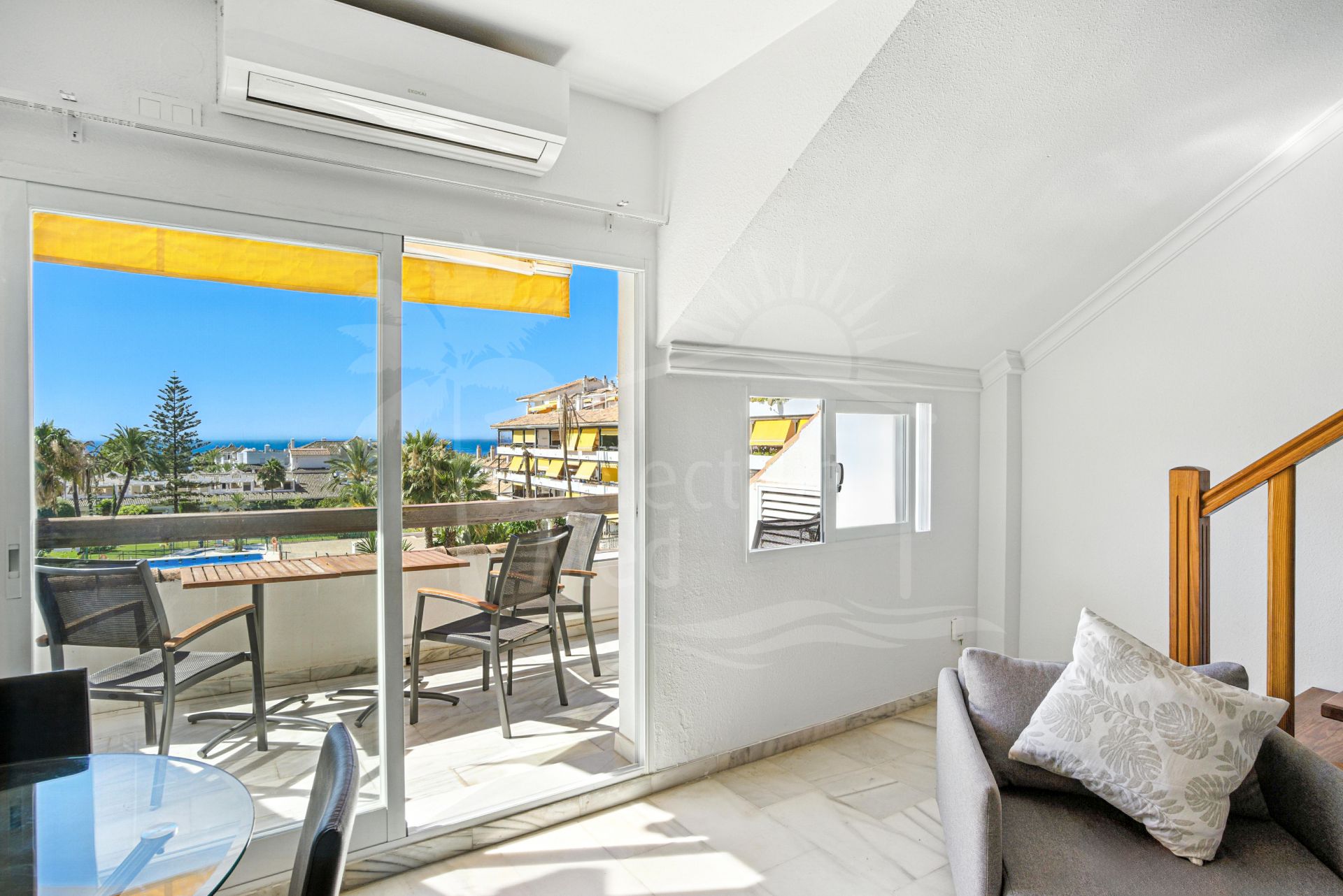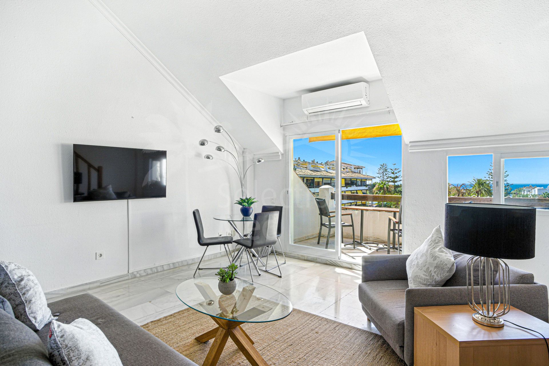 Wonderful south facing. two bedroom duplex penthouse located in the highly sought-after Carolina Park on Marbella’s prestigious Golden Mile, just a short walk from the beach, restaurants, and all amenities. This bright and spacious property features an open-plan living and dining area with a fully fitted kitchen, a guest bedroom with a guest bathroom, and a private terrace overlooking the communal pool, landscaped gardens, and offering fantastic sea views. Upstairs, the master bedroom enjoys an en-suite bathroom and ample natural light. Additional features include marble floors, fitted wardrobes, air conditioning in the living room, communal parking, and access to the complex’s swimming pools and tennis court. With its prime location and desirable layout, this penthouse offers excellent potential for both short- and long-term rentals.