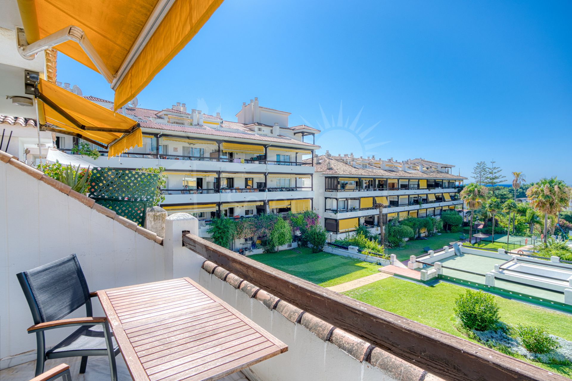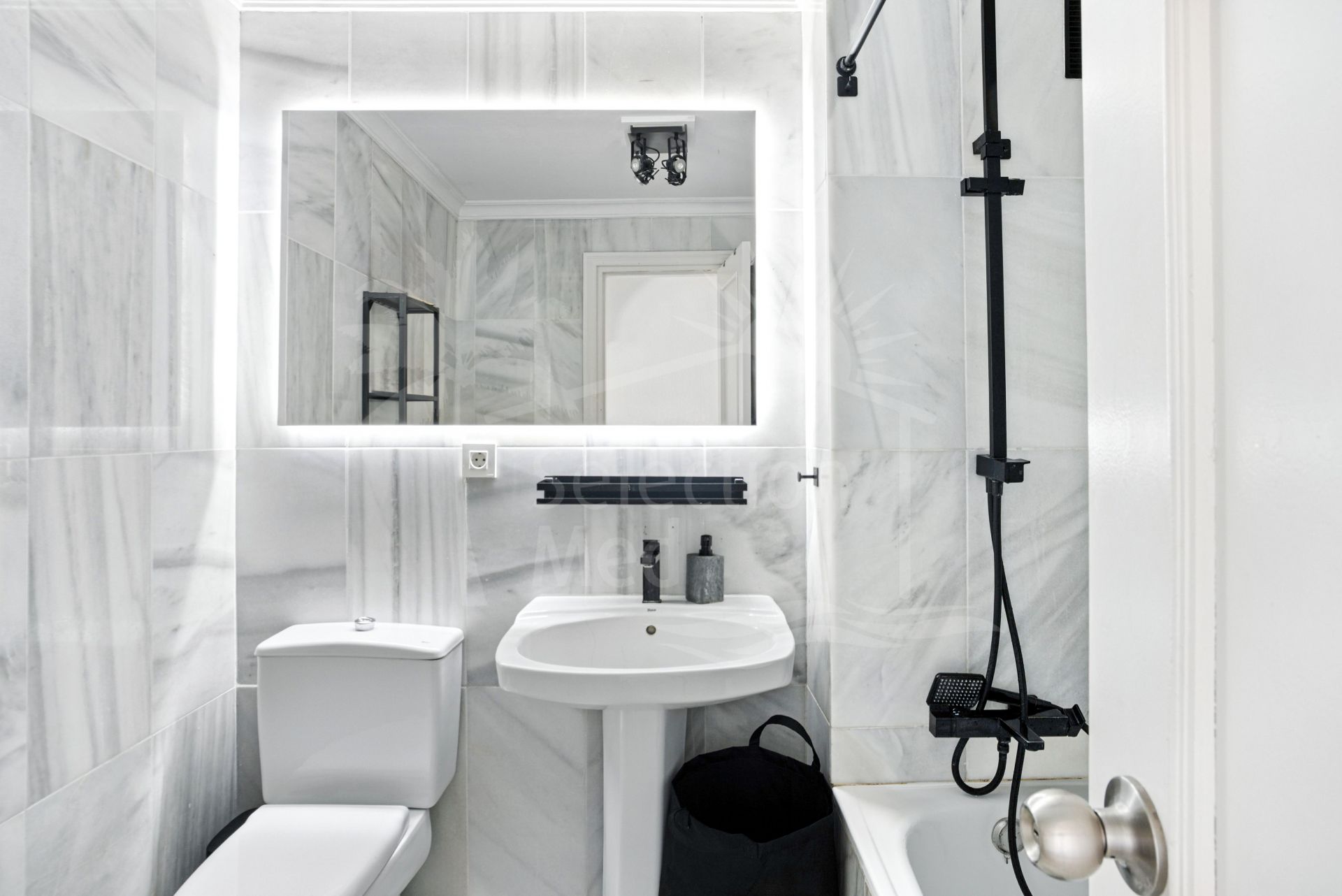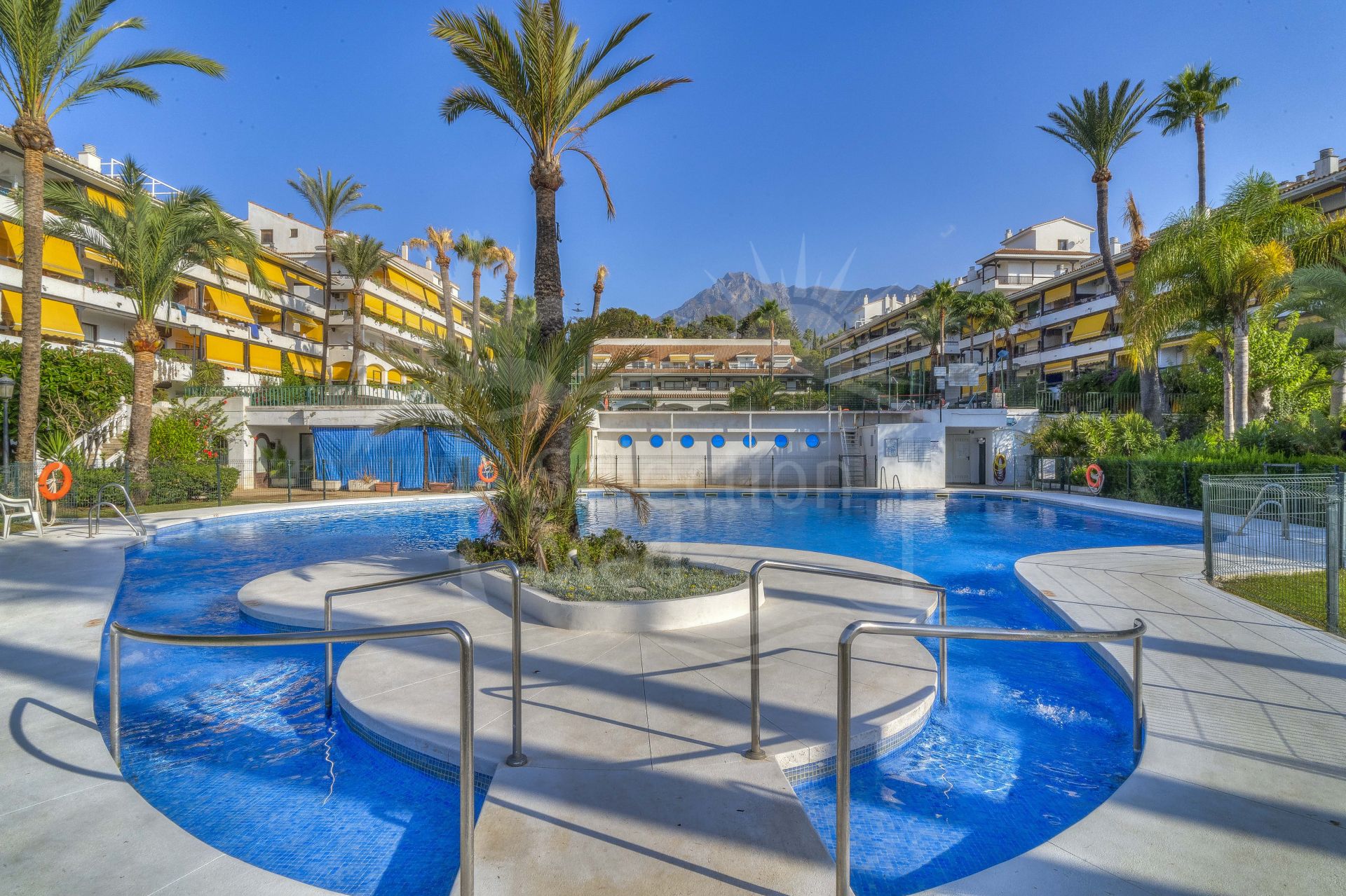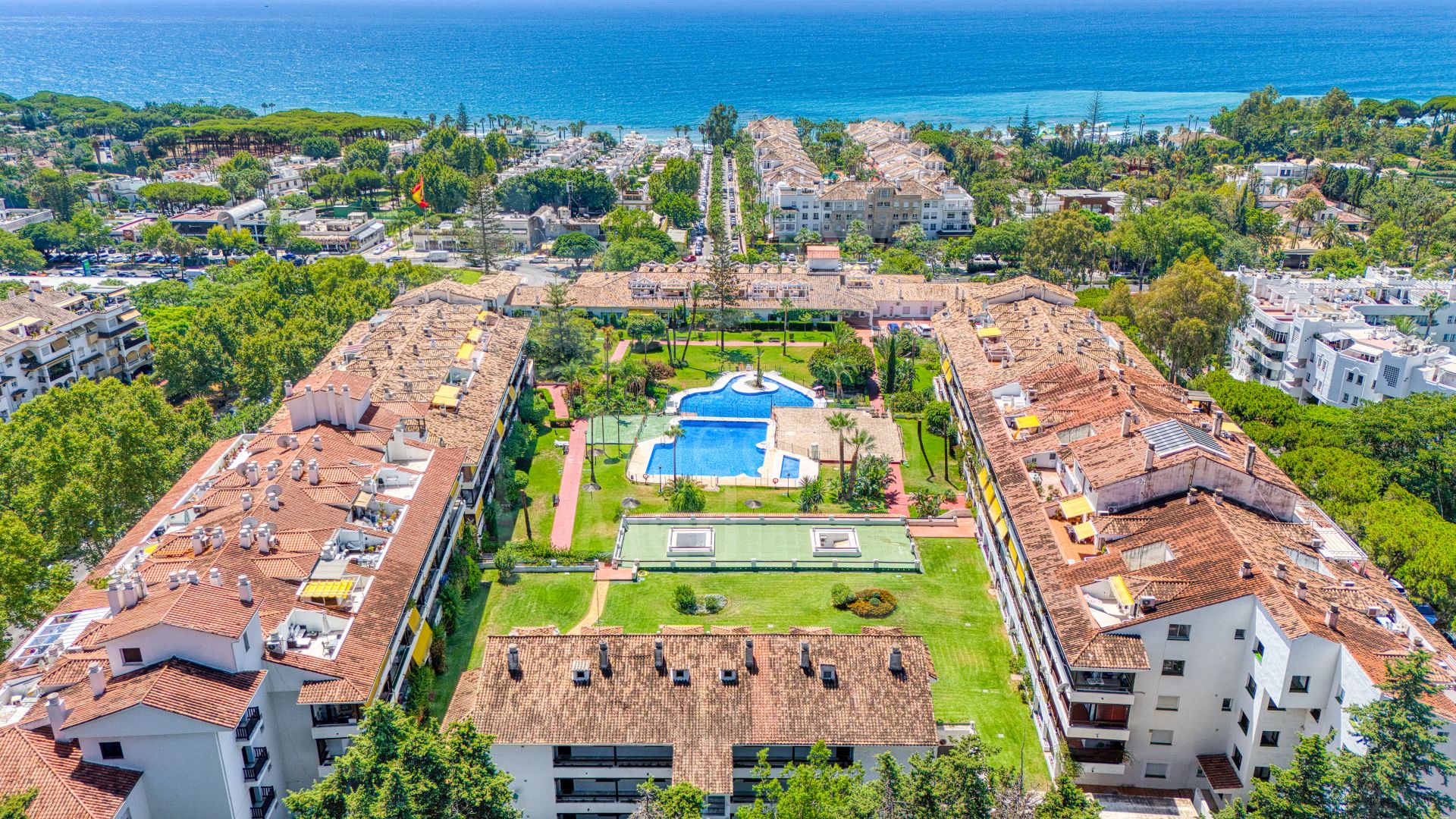 Wonderful south facing. two bedroom duplex penthouse located in the highly sought-after Carolina Park on Marbella’s prestigious Golden Mile, just a short walk from the beach, restaurants, and all amenities. This bright and spacious property features an open-plan living and dining area with a fully fitted kitchen, a guest bedroom with a guest bathroom, and a private terrace overlooking the communal pool, landscaped gardens, and offering fantastic sea views. Upstairs, the master bedroom enjoys an en-suite bathroom and ample natural light. Additional features include marble floors, fitted wardrobes, air conditioning in the living room, communal parking, and access to the complex’s swimming pools and tennis court. With its prime location and desirable layout, this penthouse offers excellent potential for both short- and long-term rentals.