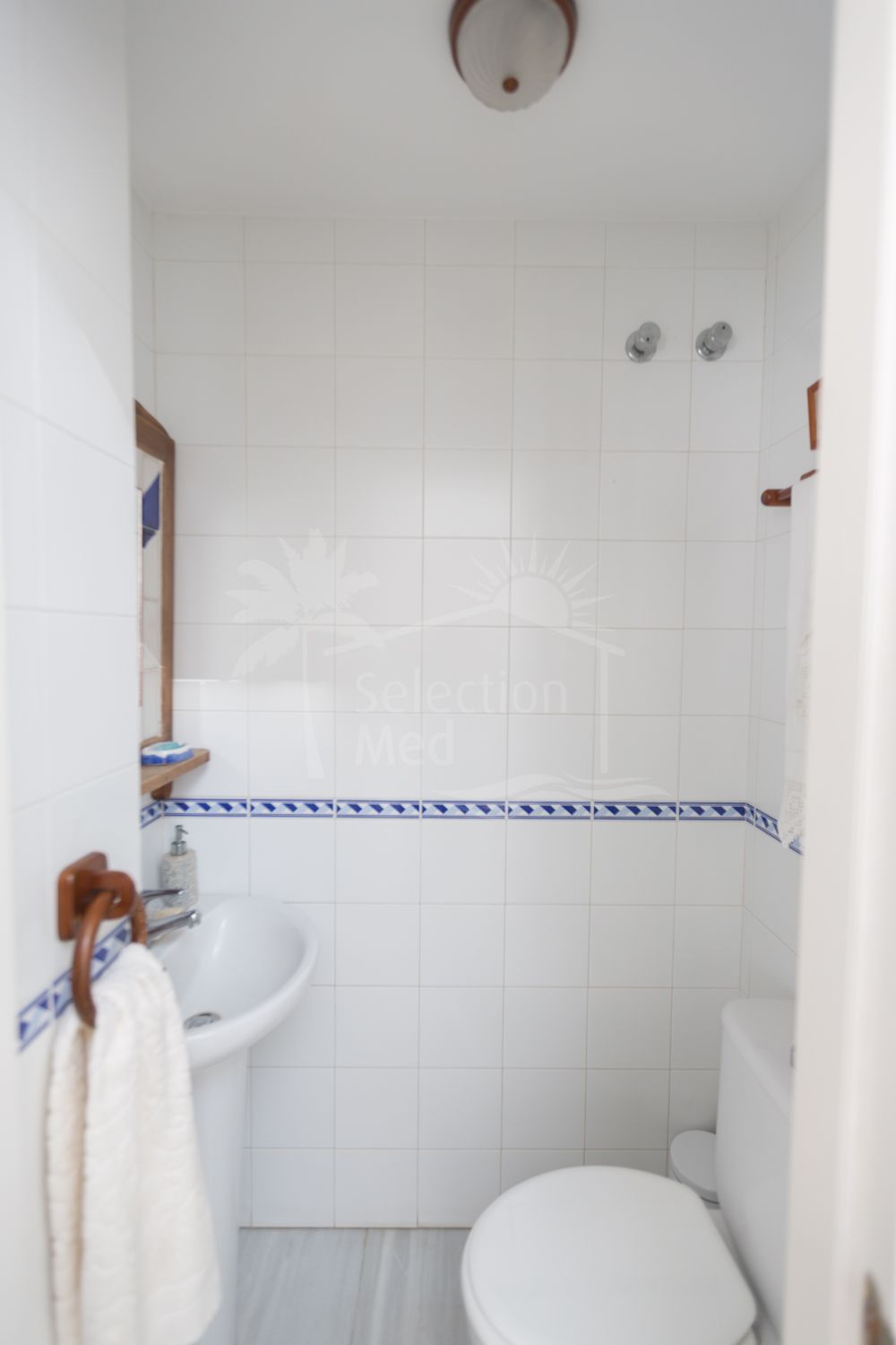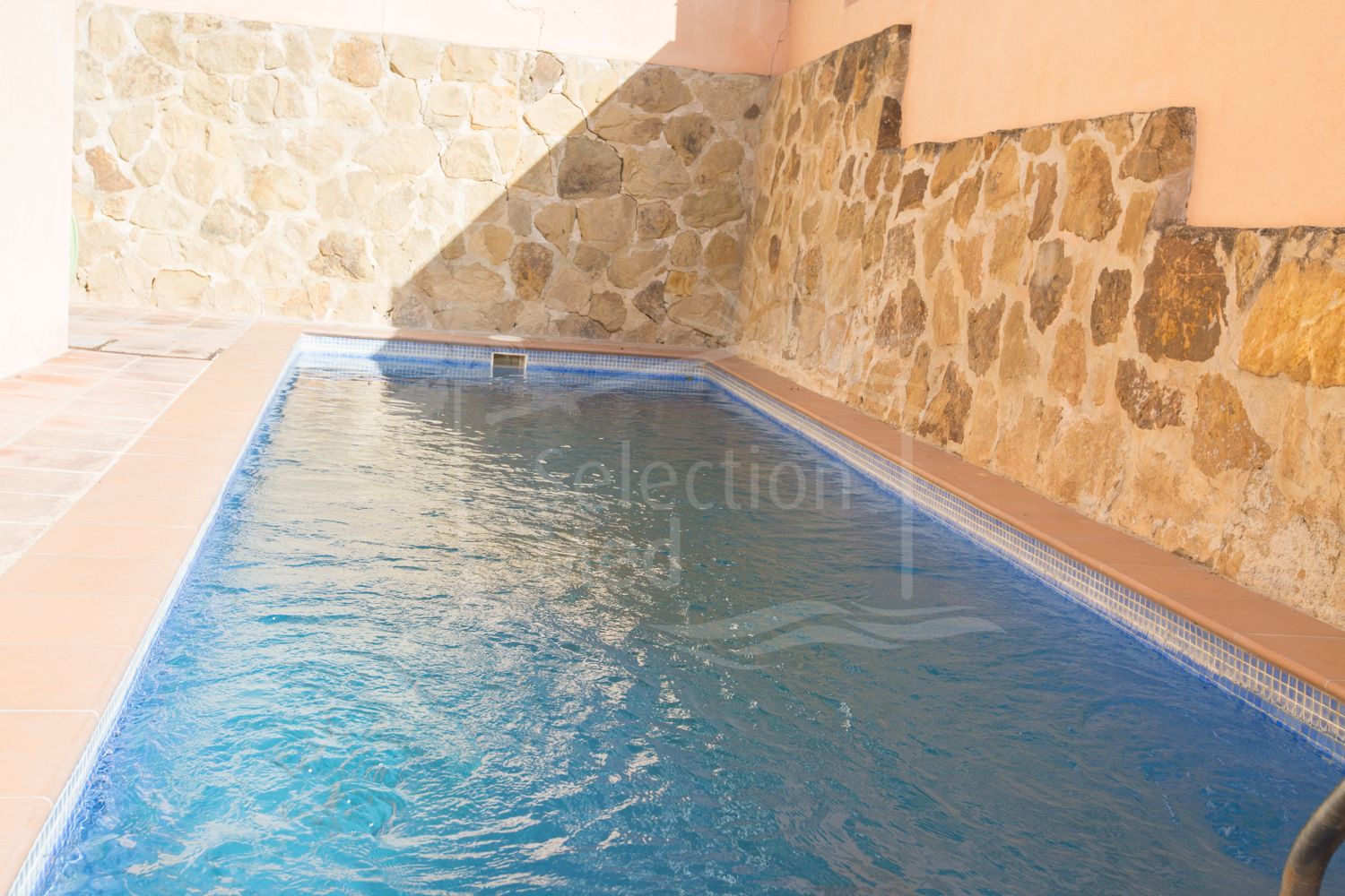 The house is distributed over three levels: a 80 m² basement; the main floor, which includes a kitchen, living-dining room with fireplace, guest toilet, terrace, and private pool measuring 7 × 3 m; and the upper floor with two en-suite bedrooms and a terrace that can be glazed.