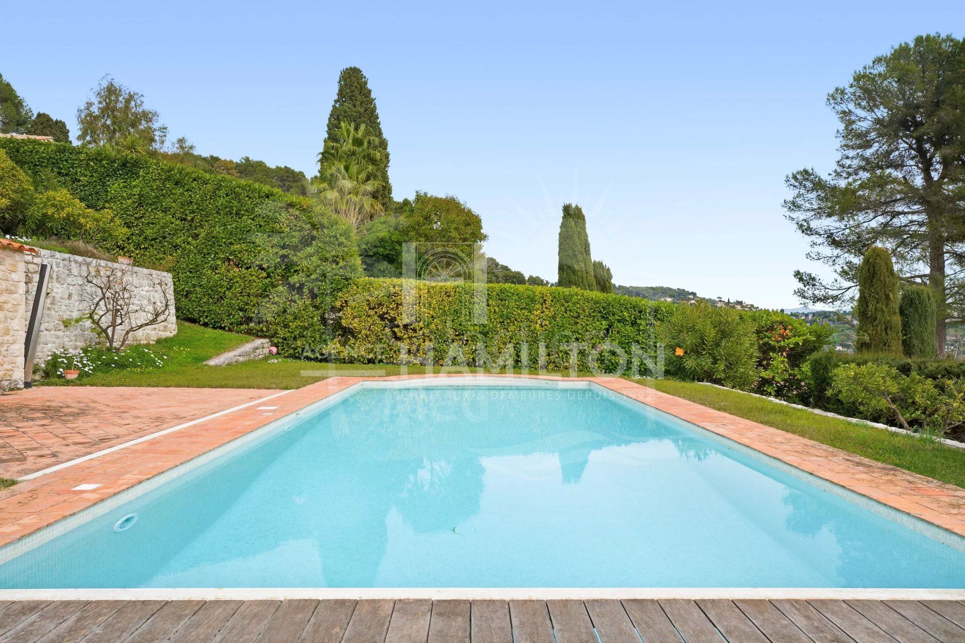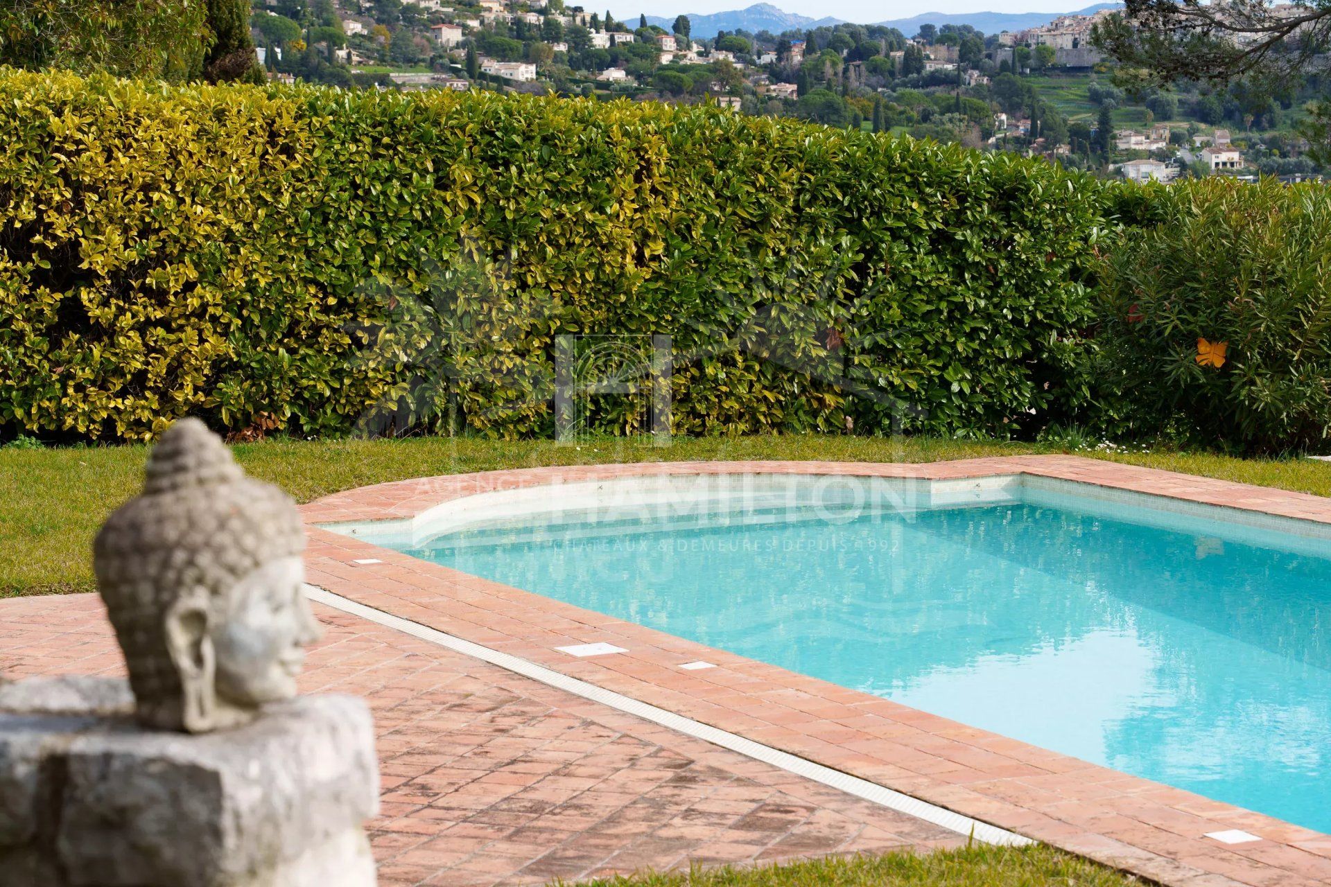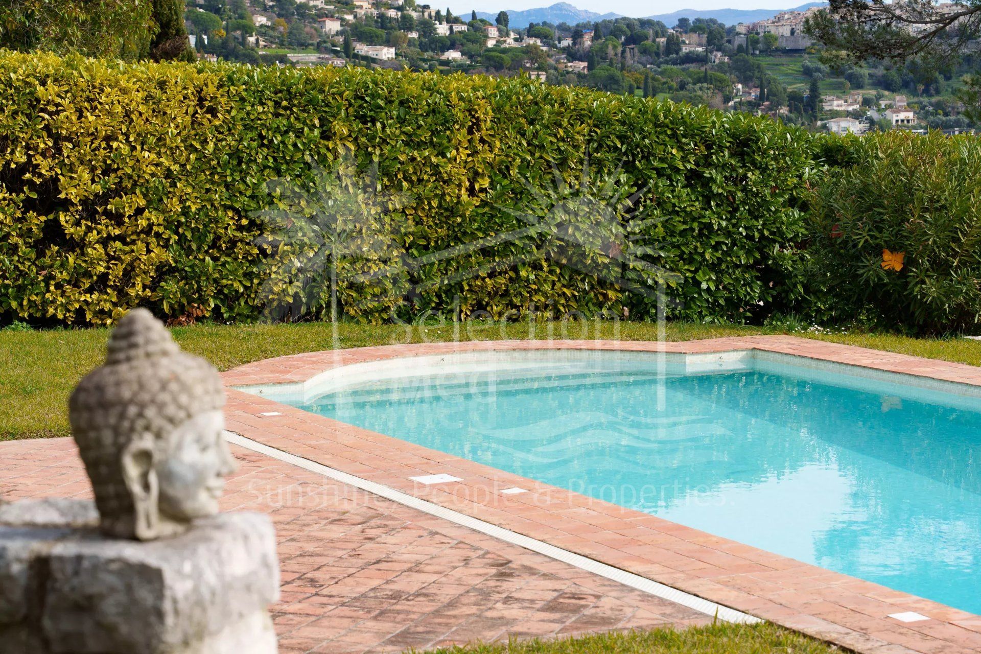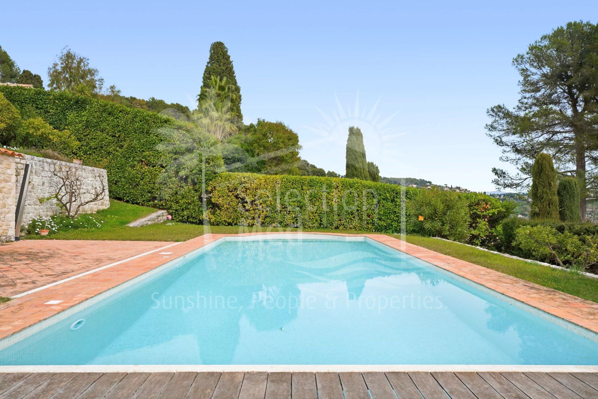 The property sits on 1,850 sqm of beautifully landscaped grounds, thoughtfully planted with fruit trees and intimate relaxation areas. The garden, with its swimming pool, pool house, and views over Saint-Paul-de-Vence, is ideal for enjoying long summer days on the French Riviera.