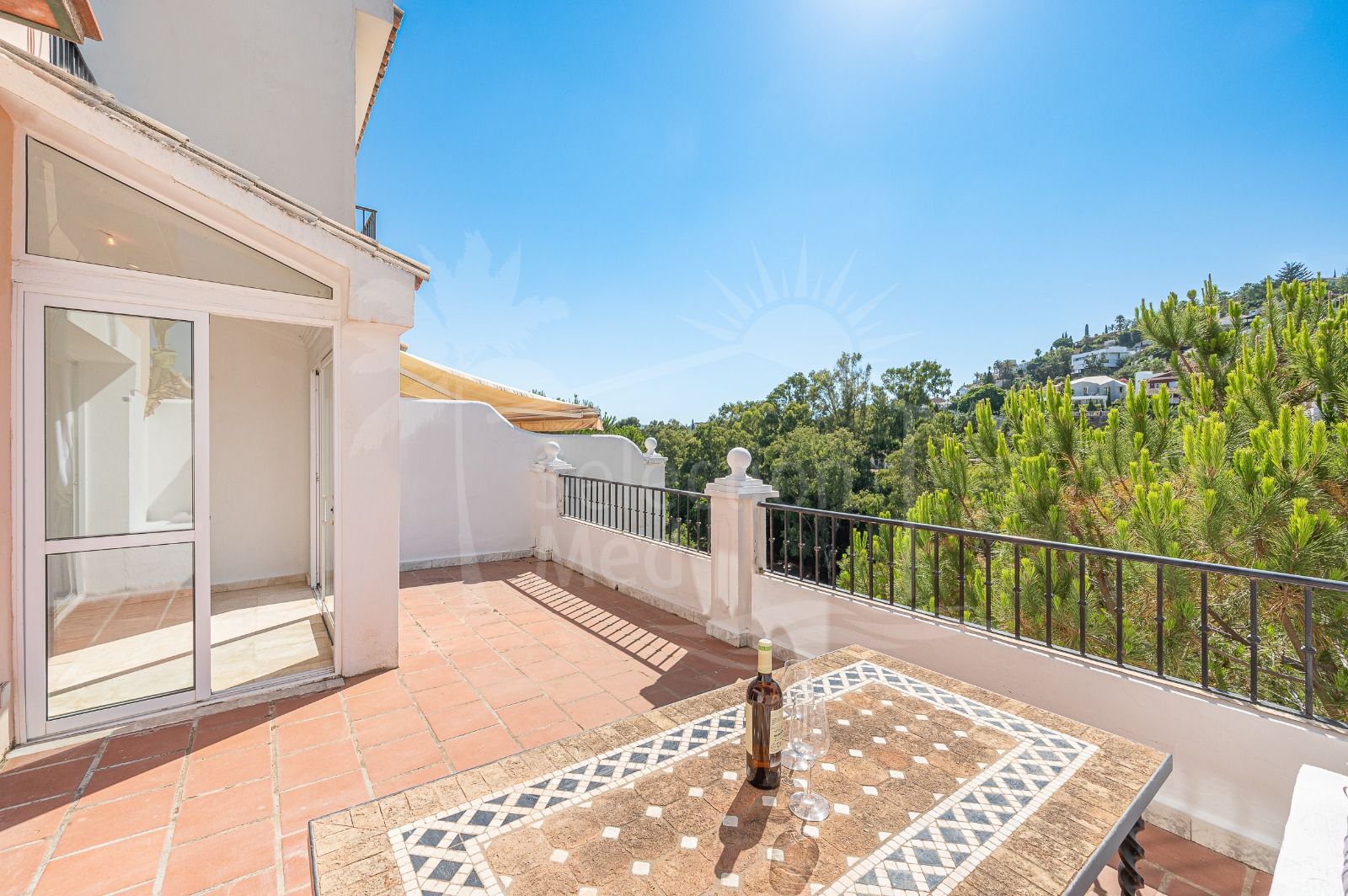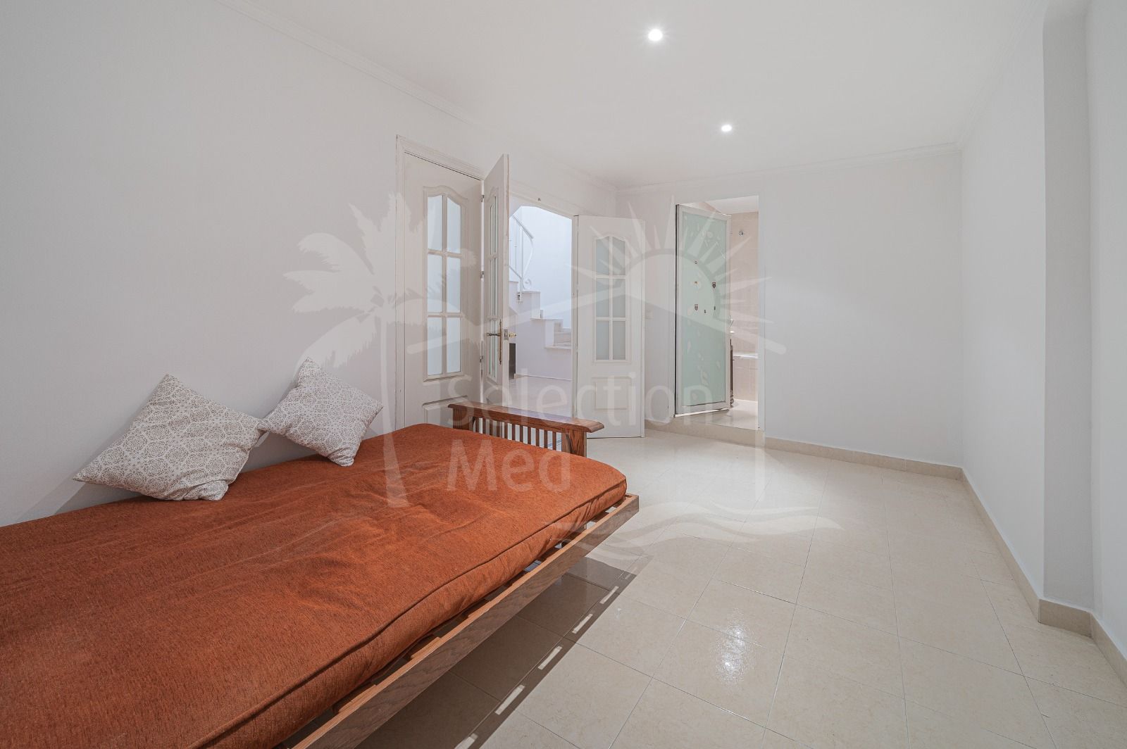 The upper floor houses a large master suite with a private bathroom and additional space for a sitting area, complemented by a small private terrace, perfect for moments of tranquility.