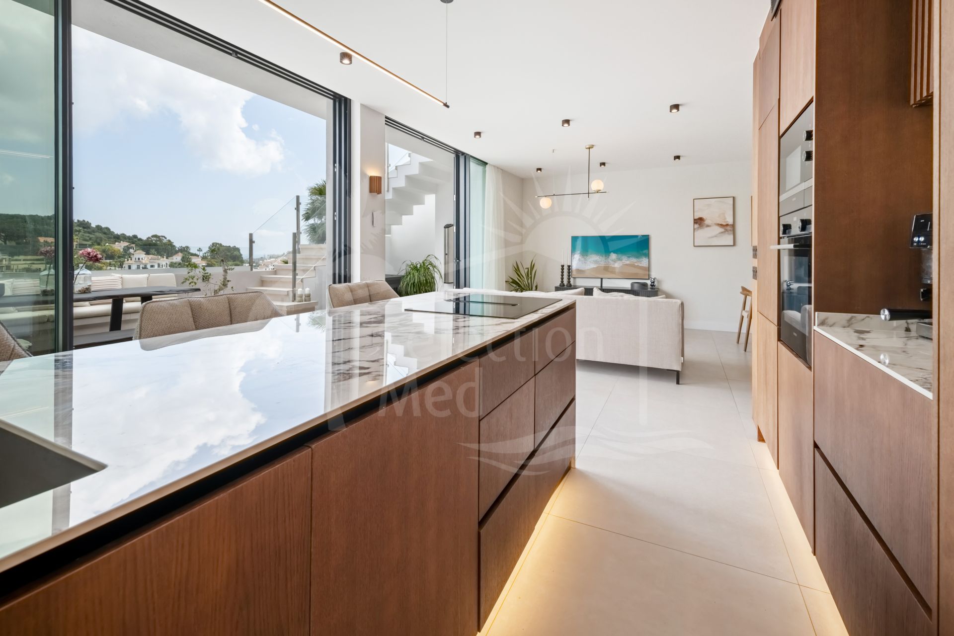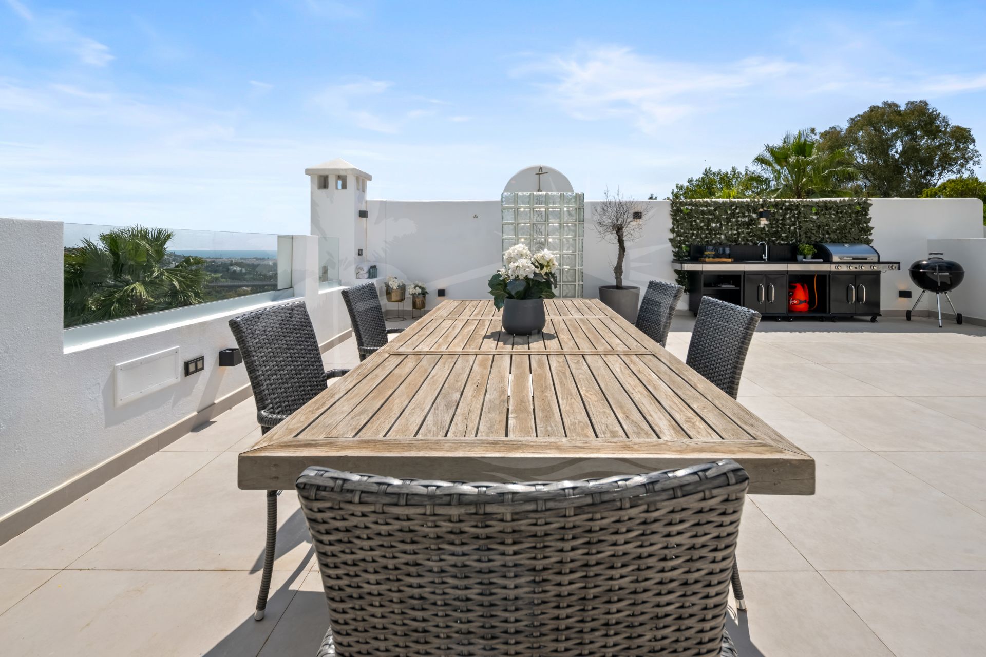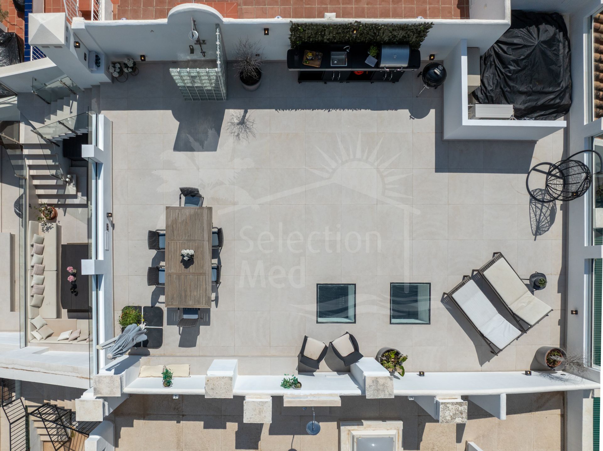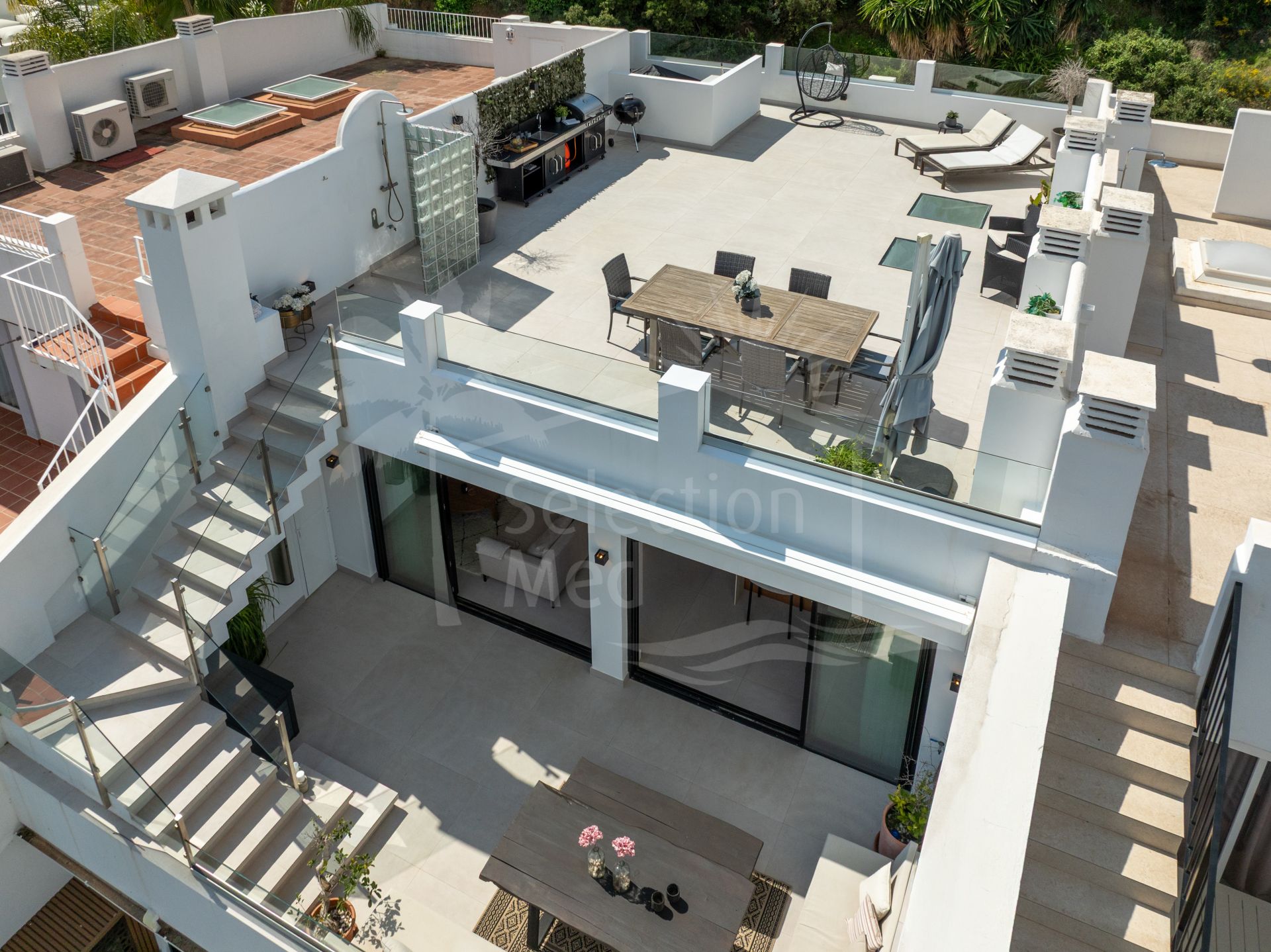 Designed for enjoying the Mediterranean lifestyle, the penthouse features spacious terraces on the main floor as well as a private rooftop retreat. The upper level is equipped with a complete outdoor kitchen, creating the perfect space for entertaining, dining, or unwinding while taking in stunning sea views.