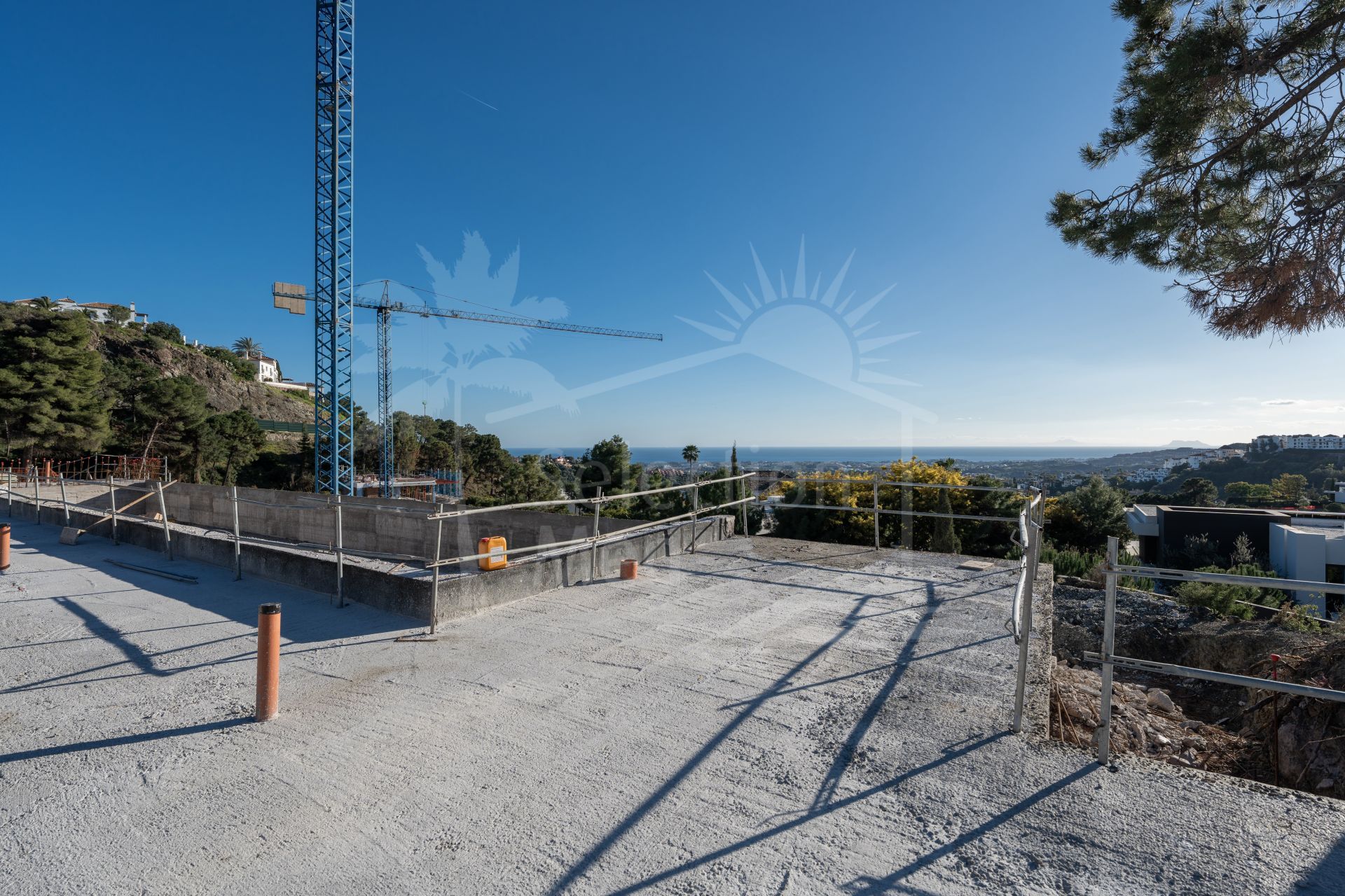 Spanning three levels, Villa Stonehaven has a total built area of 1.660 m² and is situated on a spacious plot of 3.082 m². The villa includes six large bedroom suites, though en-suite bathrooms are not specified. There are also two additional toilets for added convenience. The villa is filled with natural light, thanks to its large panoramic windows that offer stunning views of the Mediterranean Sea, surrounding hills and mountains, and even the distant African coastline. With a slight southwest orientation, the villa enjoys sunlight throughout the day and provides breathtaking sunset views, including glimpses of Gibraltar from both the ground and first floors.