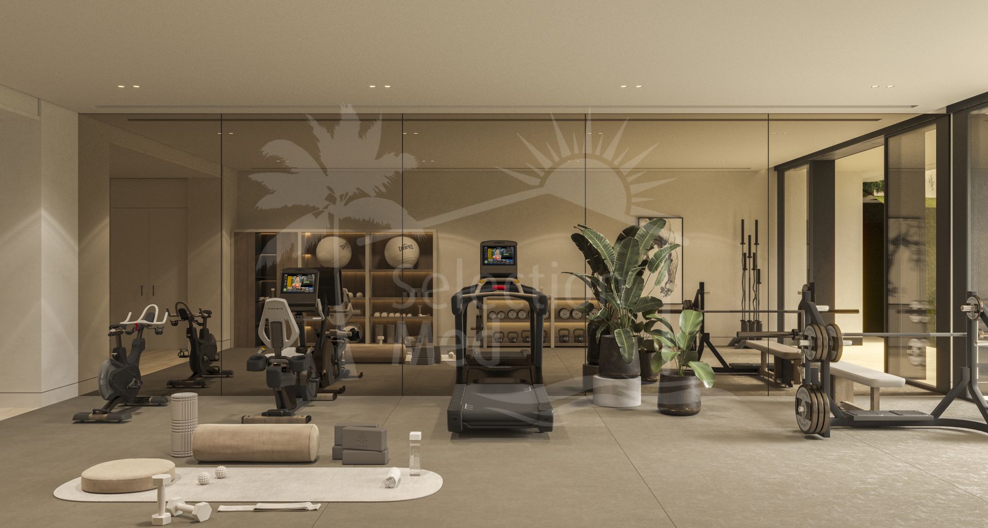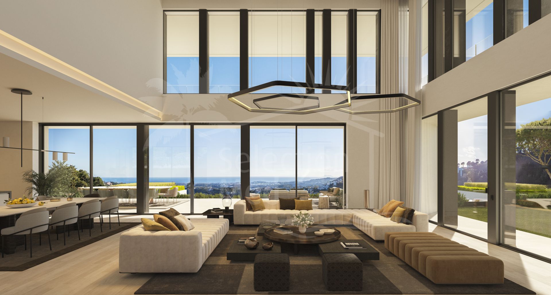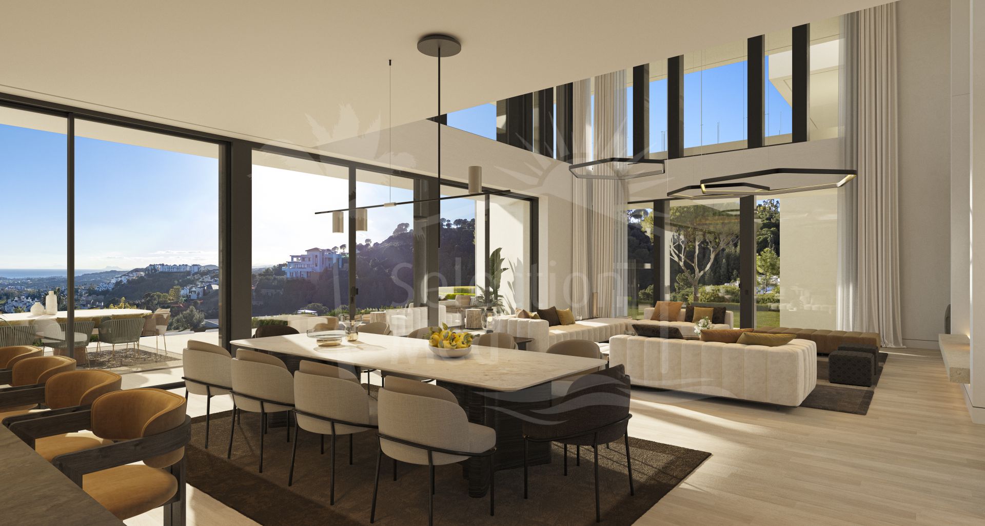 The villa’s outdoor spaces are equally spectacular, with 385 m² of terraces designed to maximise the enjoyment of the Andalusian climate. The beautifully landscaped gardens, equipped with an automatic irrigation system, surround a private heated swimming pool, creating the perfect setting for relaxation, dining, or entertaining amidst stunning surroundings. A private garage with space for three cars adds further convenience to this luxurious property.