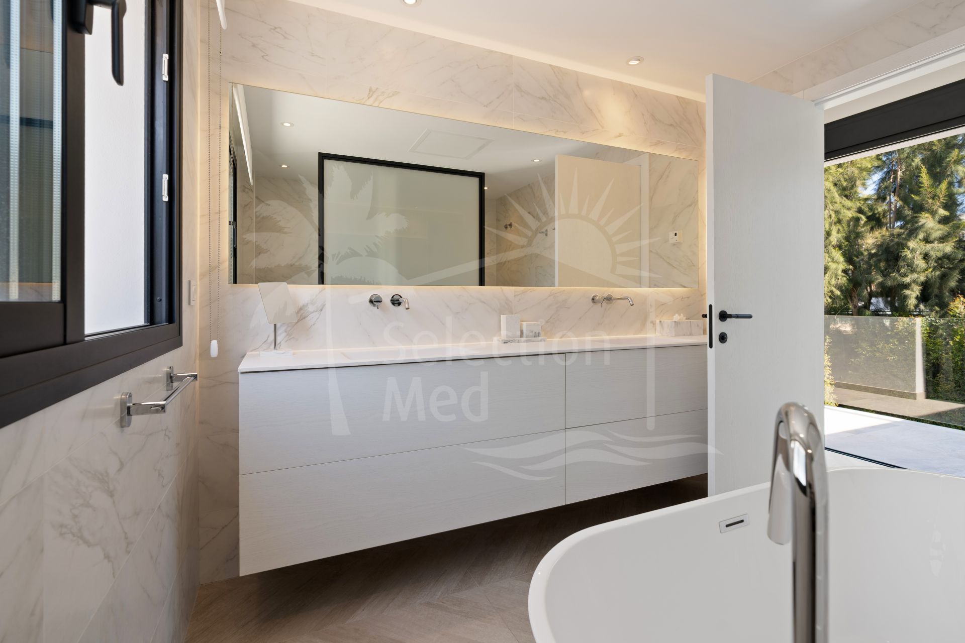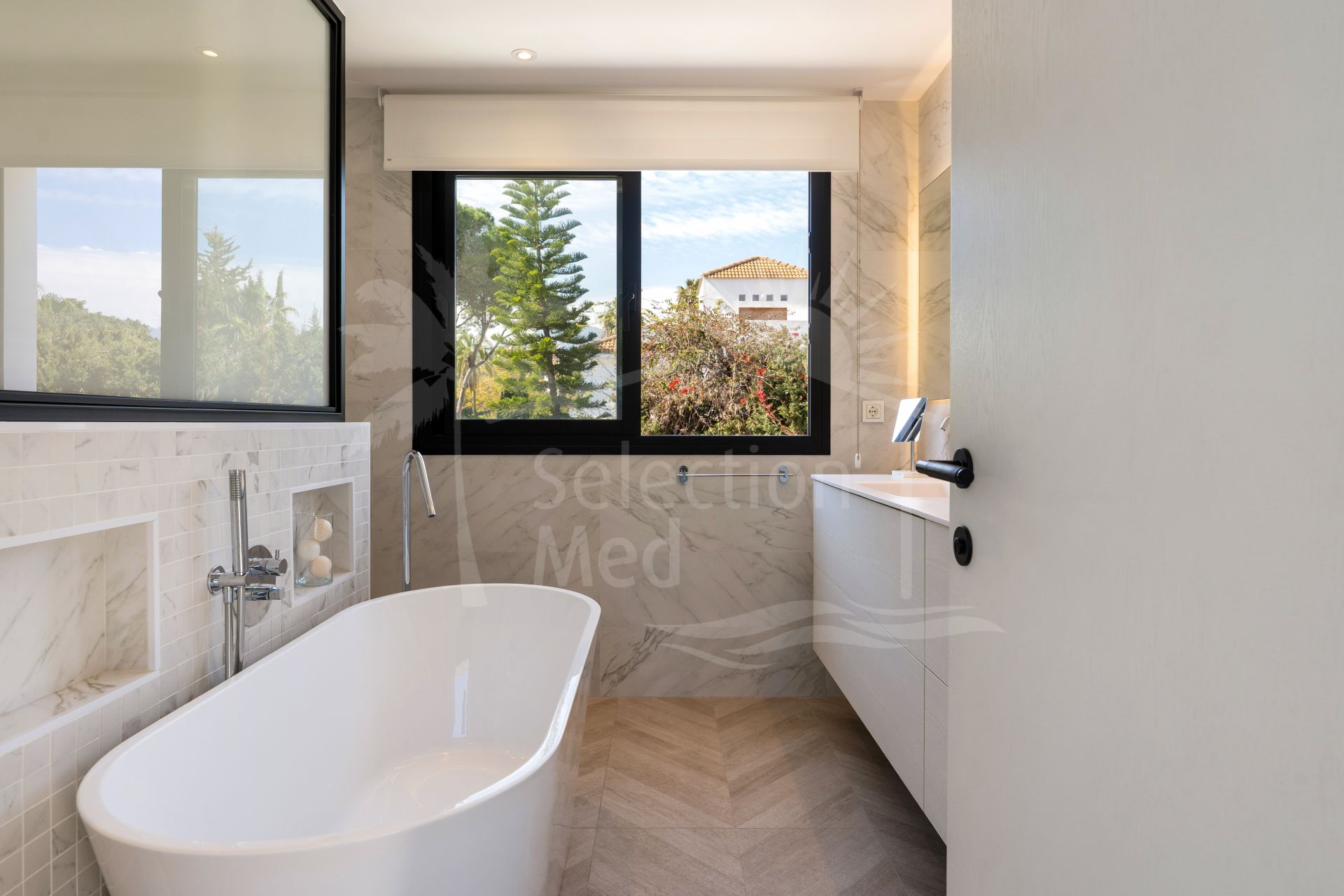 Ascending the impressive triple-height staircase, the upper level hosts three additional en-suite bedrooms. The principal suite is particularly luxurious, featuring both a bathtub and walk-in shower and large wrap around terrace, perfect to enjoy the stunning La Concha views. Three of the four bedrooms enjoy stunning views towards La Concha, further enhancing the villa’s appeal.