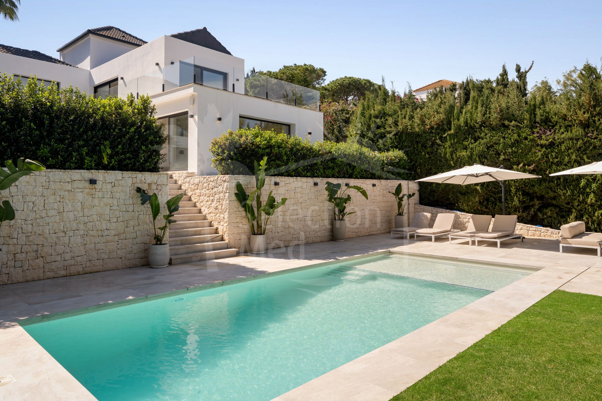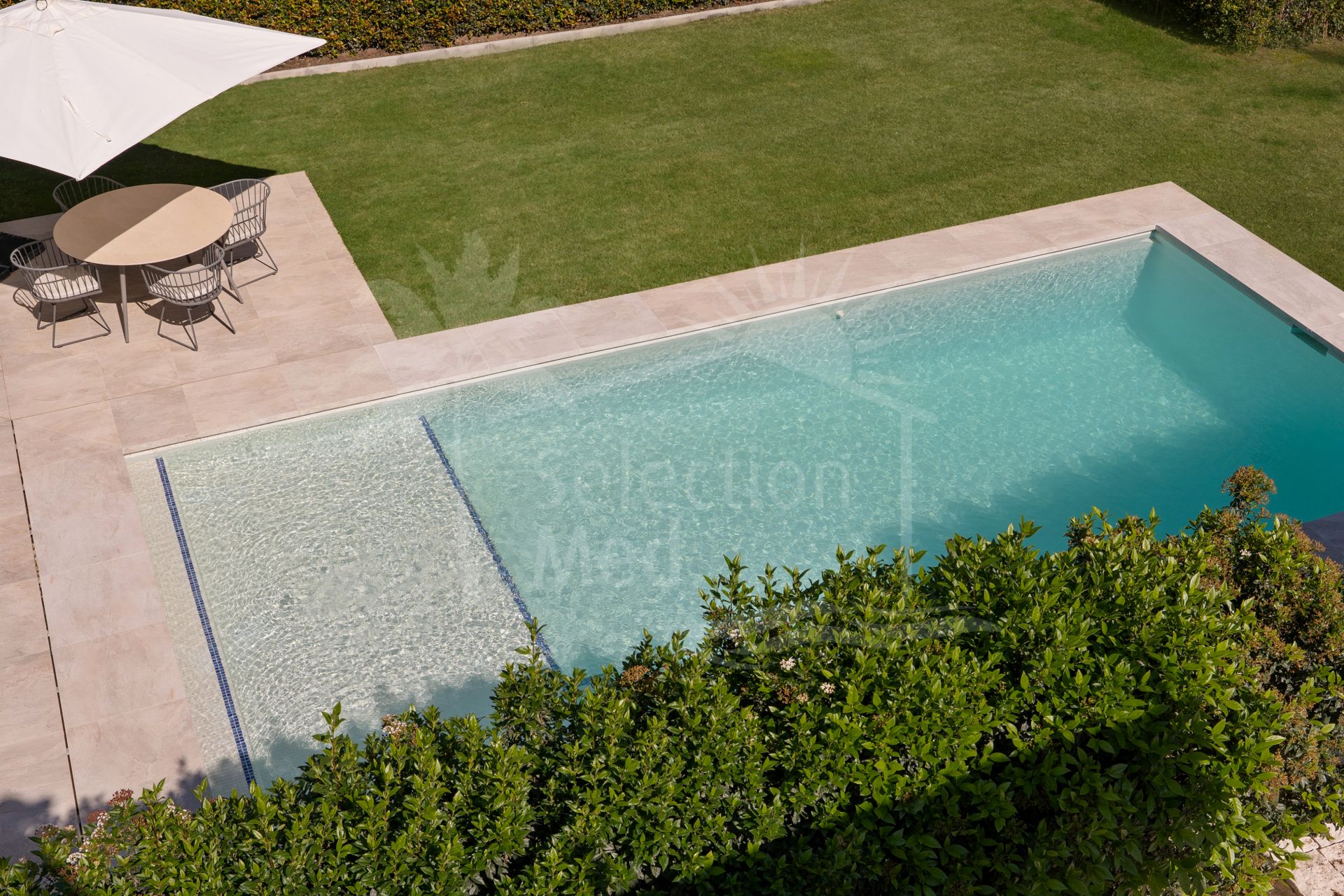 From both the living area and kitchen, there is direct access to the terrace and landscaped garden. Thoughtfully designed, the terrace provides ample shaded areas for comfortable summer living, while the lower level of the plot features an expansive swimming pool and sunbathing area, perfectly positioned to enjoy sunlight throughout the day and into the evening.